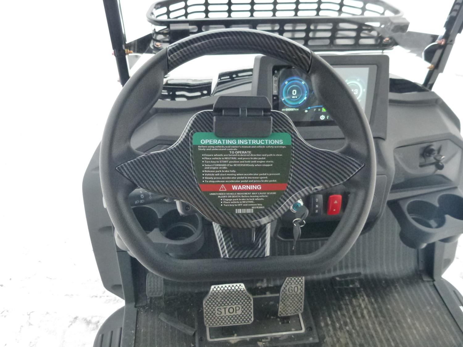 6 passengers, canopy, windshield, reverse, rear cargo, charger, Lights, radio, side steps, 23X10.00-14 tires. COLOR is WHITE