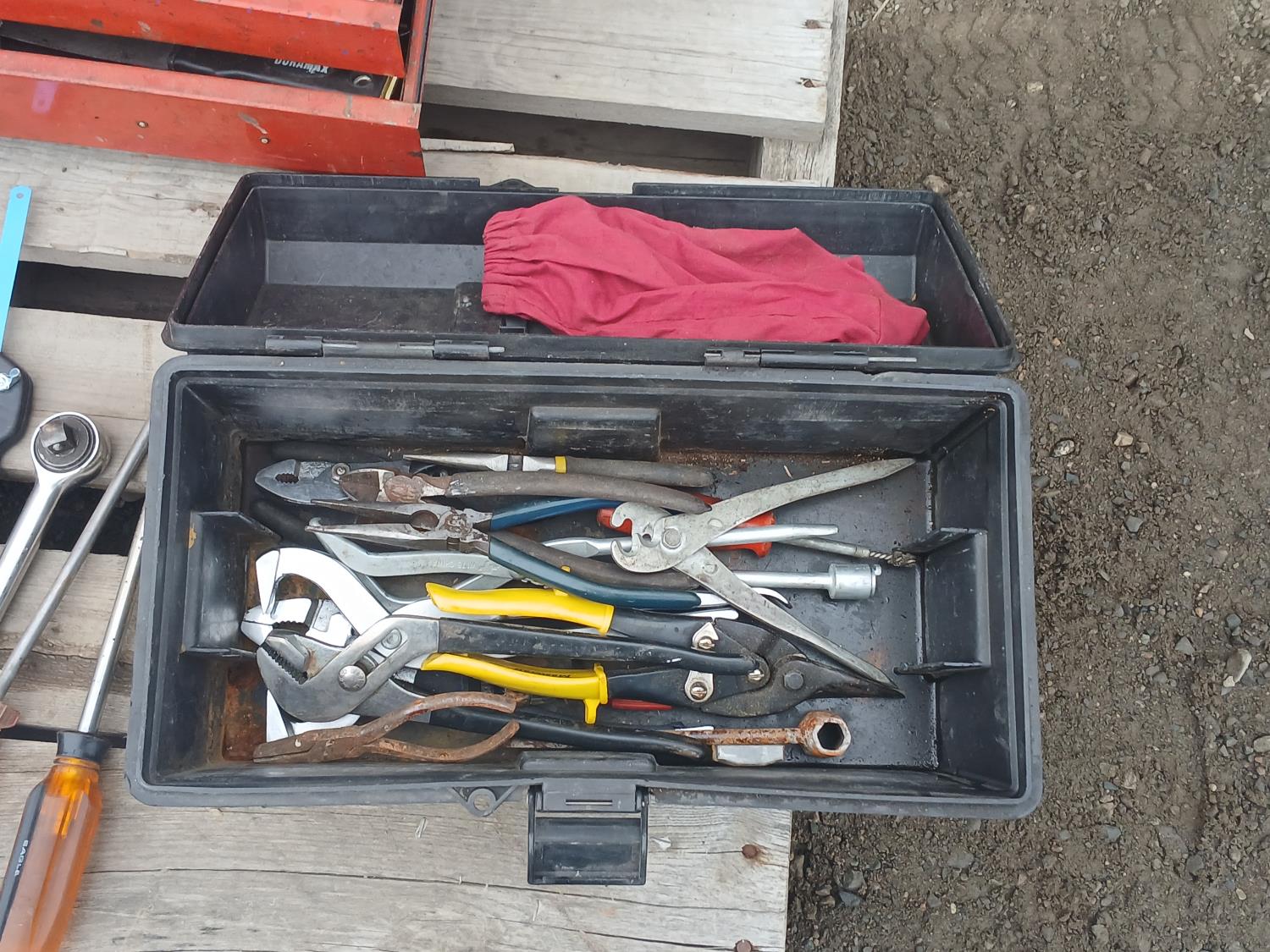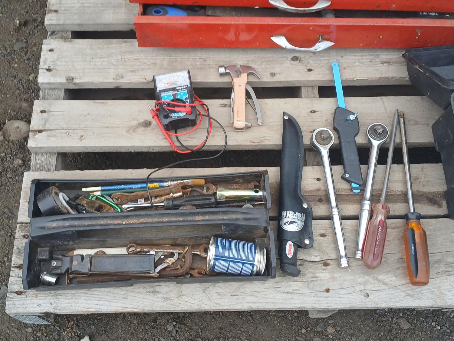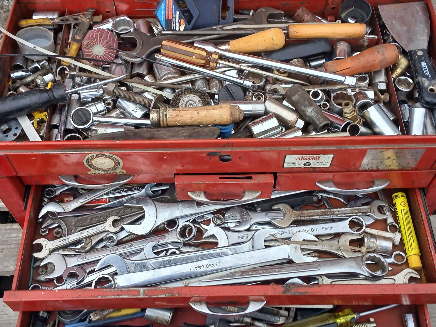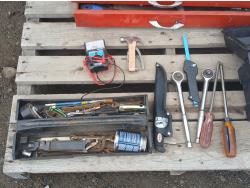 Multiple wrenches, sockets, files, screw drivers, pressure gauges, and various other tools, and accessories.