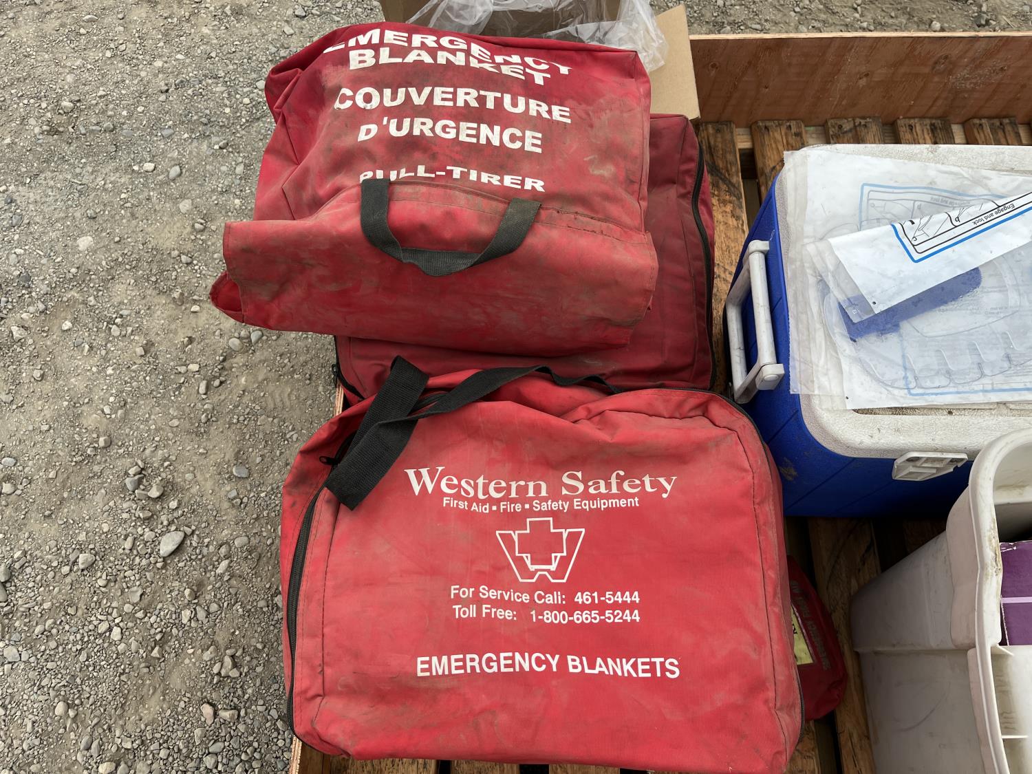 (3) emergency blankets, first aid kits, soap dispenser