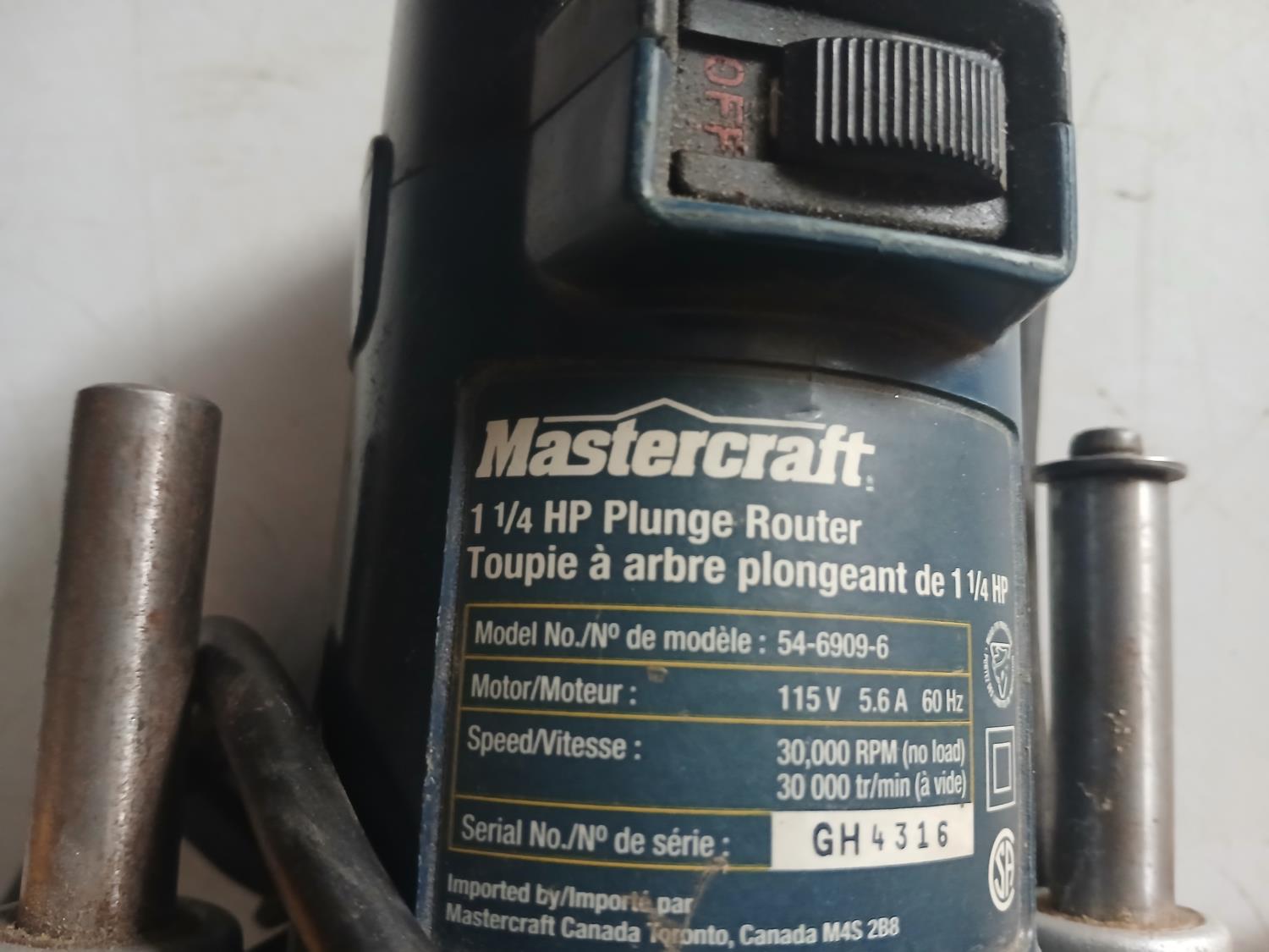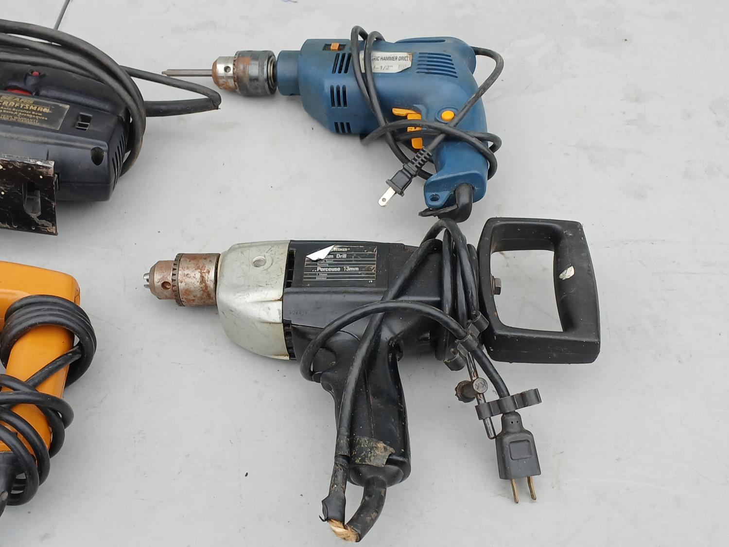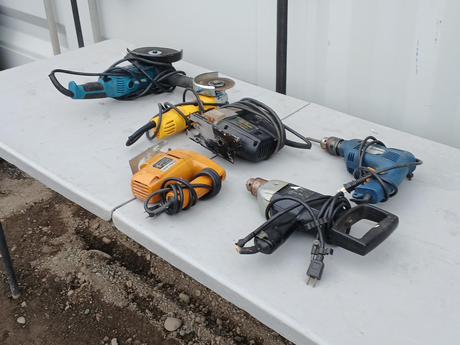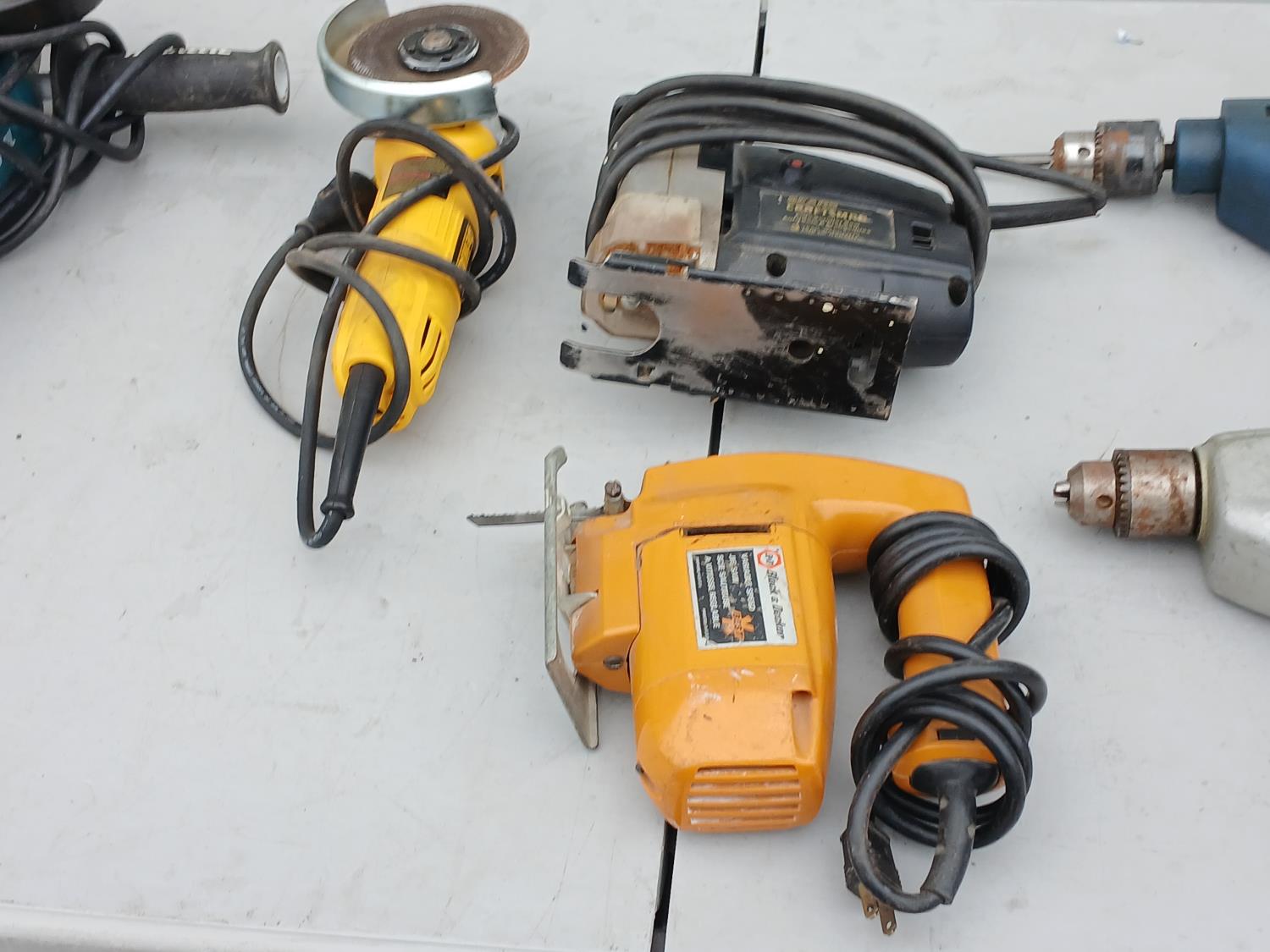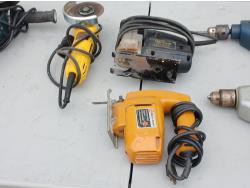(1) Mastercraft plunge Router, (1) Malita 6 inch grinder, (1) 4inch DeWalt grinder, (1) Craftman jig saw, (1) Black and Decker Jig Saw, (2) Black and Decker Hammer Drill.