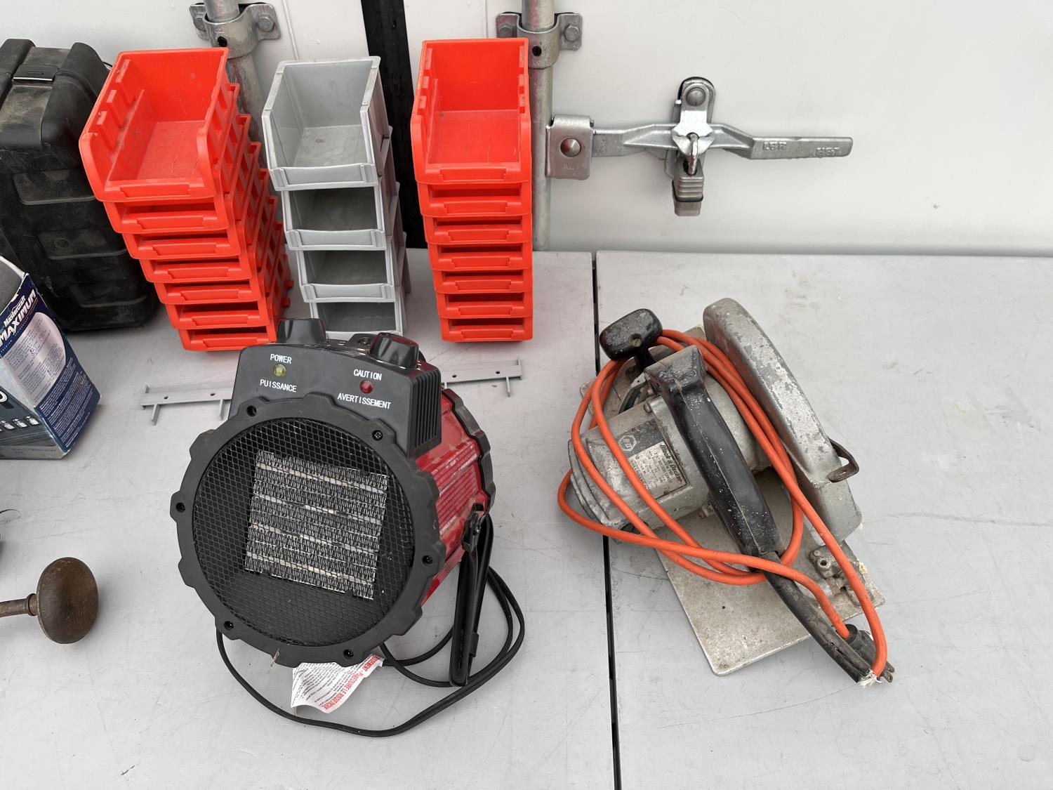Black & Decker circular saw, Wagner paint sprayer, Konwin Heater, (2) Mastercraft sets, (14) red hardware organizers, (4) grey,