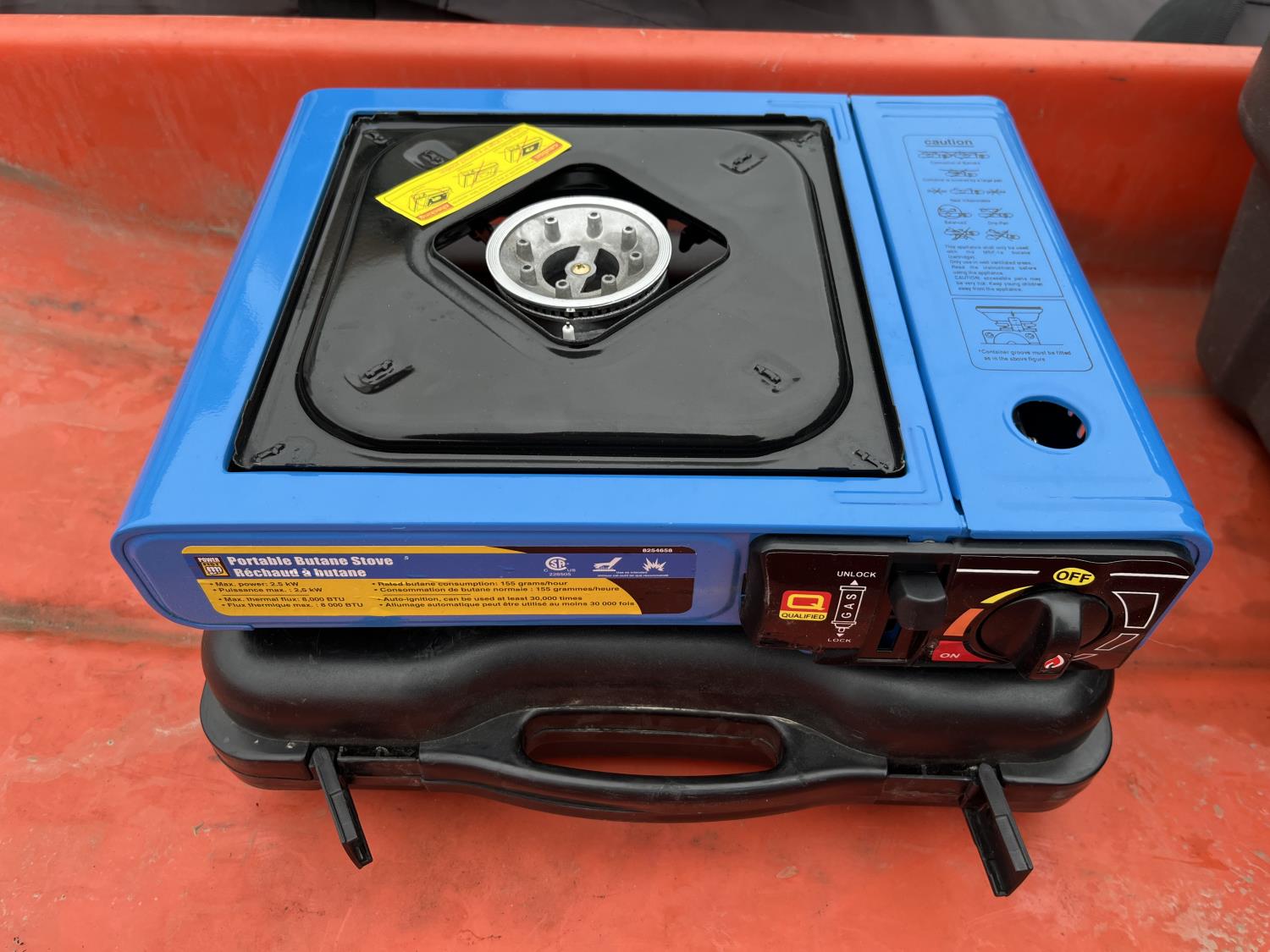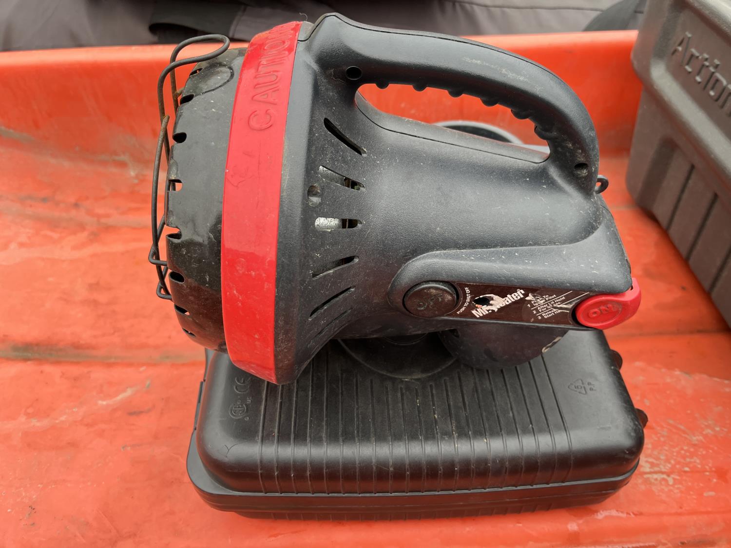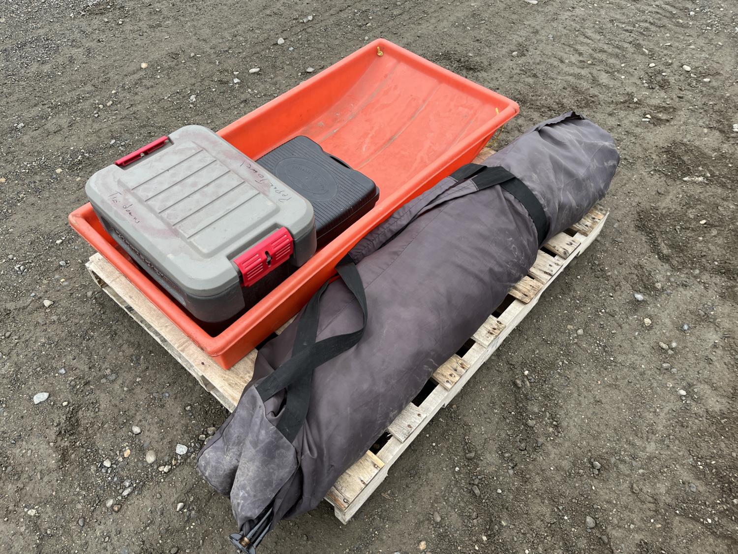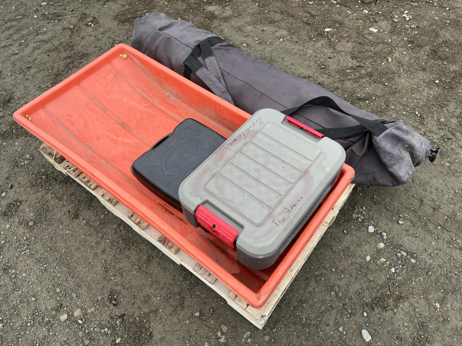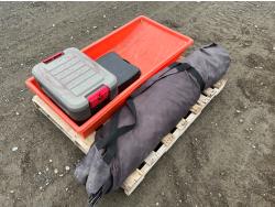 Portable ice fishing tent, equipment sled, Mr. Heater 3800 BTU portable propane heater, portable butane stove, (6) 2 stroke engine oil 10 litre mix