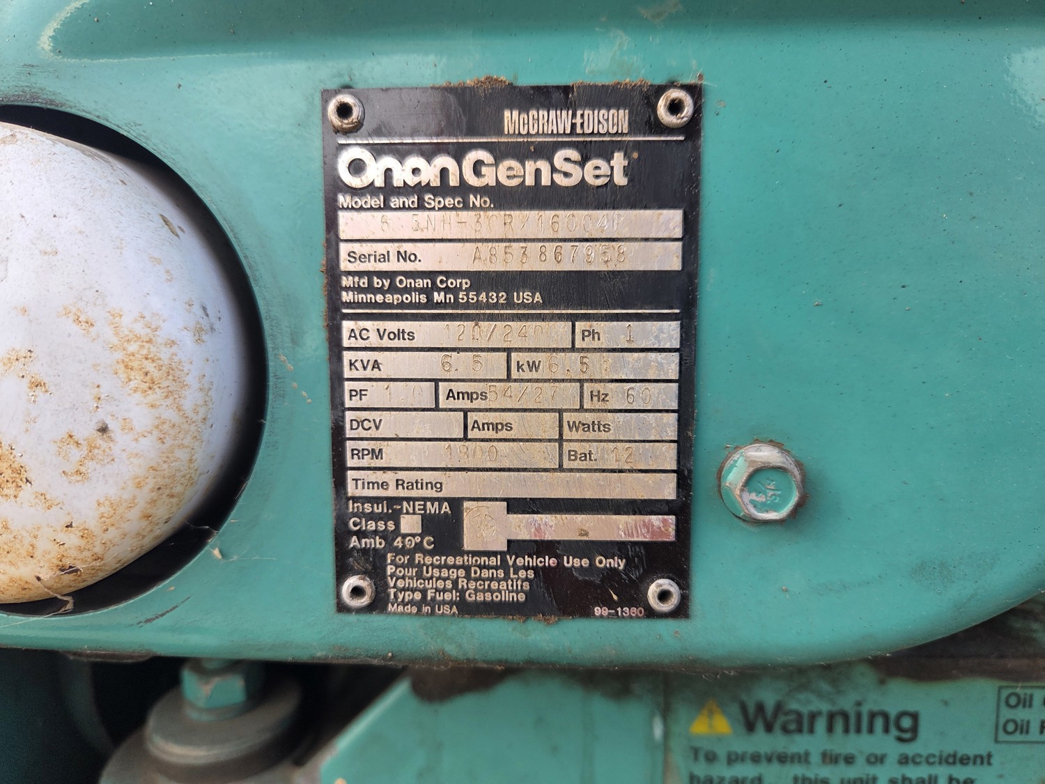 Onan 6.5RV Genset 4000W Gas Generator