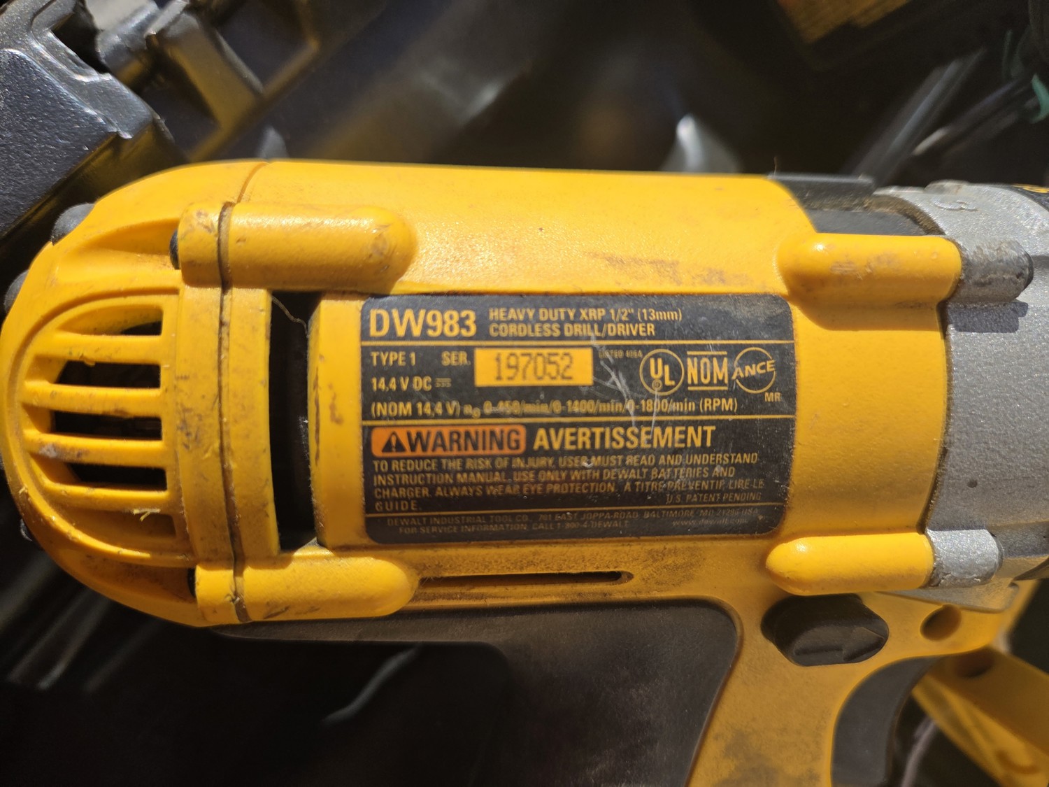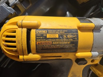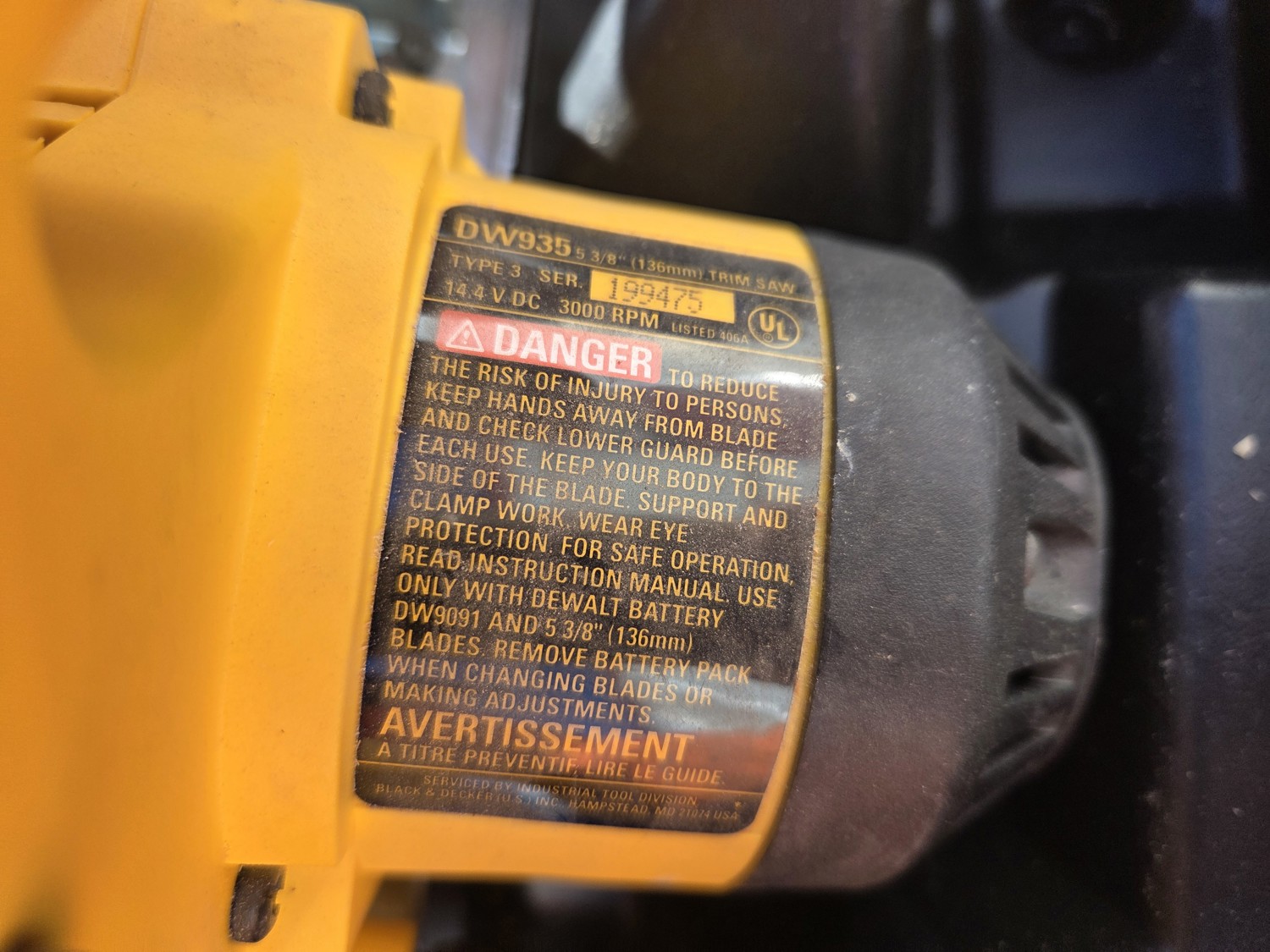 DW983 heavy duty 1/2 inch cordless drill driver, DW935 5-3/8 inch trim saw. Qty of (1) 14.4 V battery and charger included