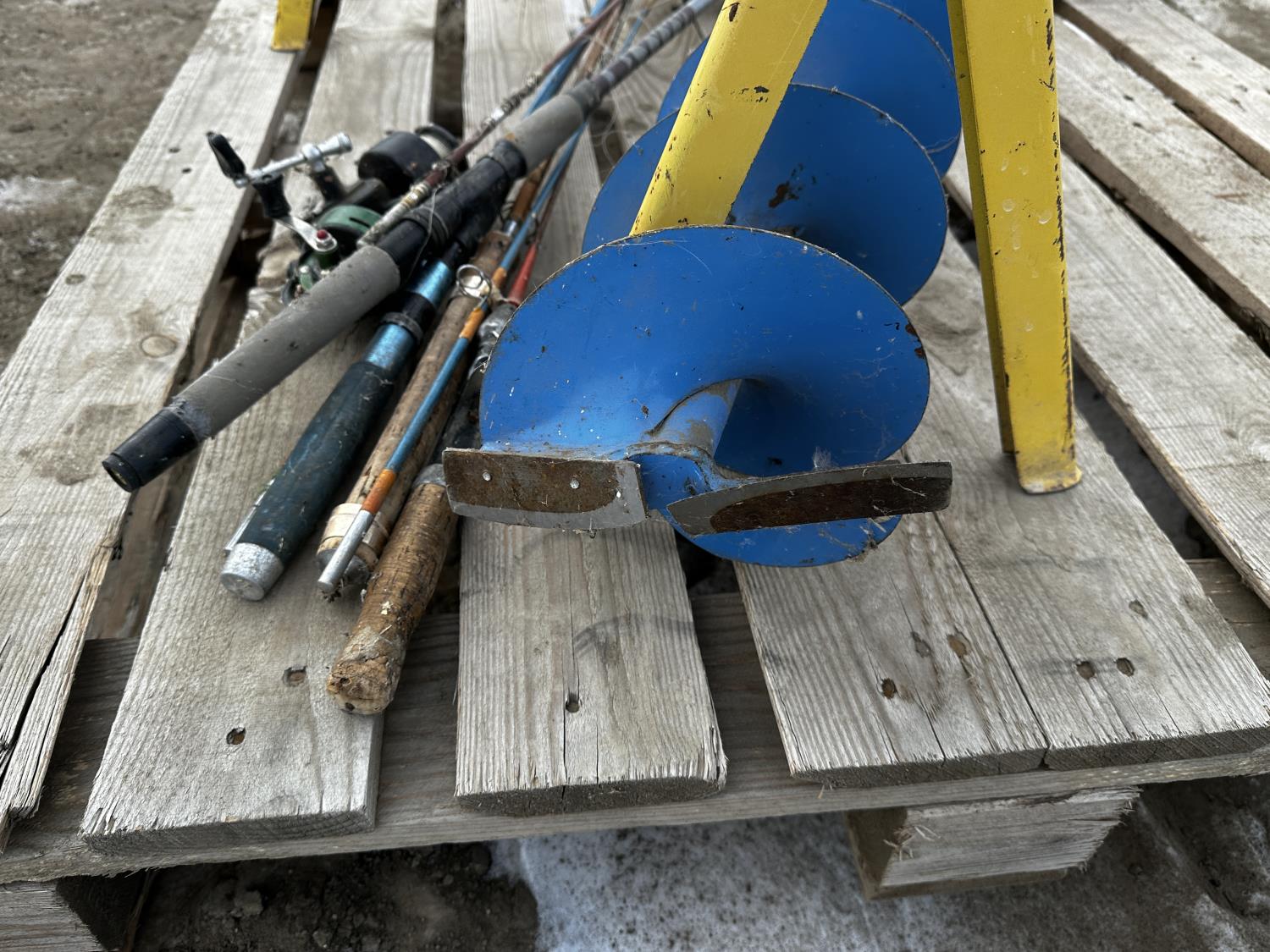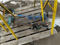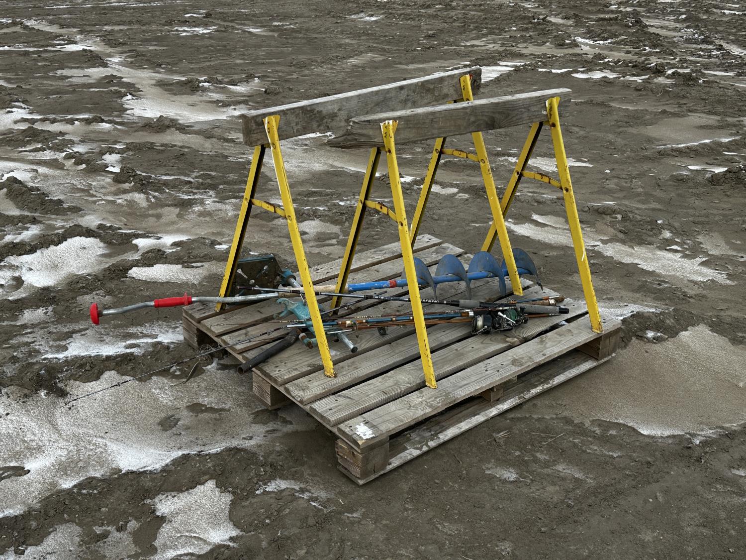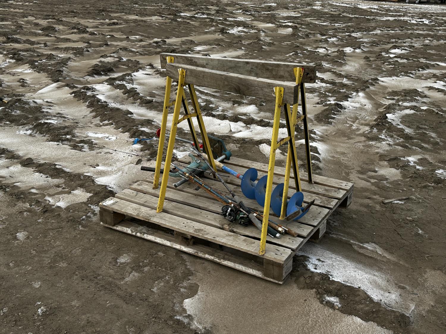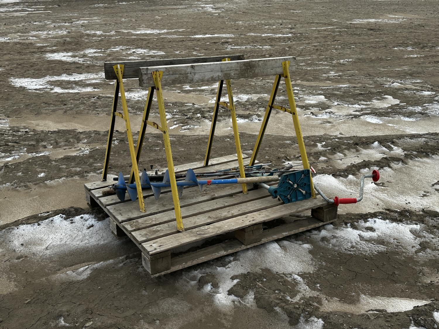 height 32 inch, length 37.5 inch, includes miscellaneous fishing supplies, 8 inch ice auger