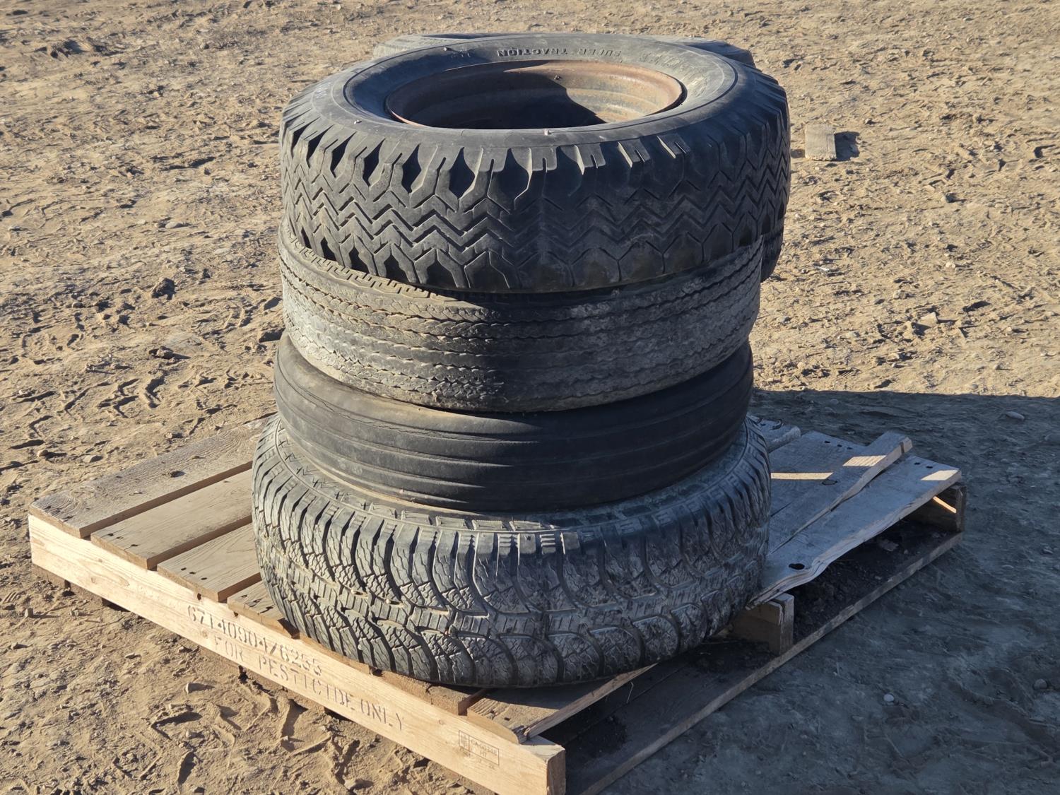 qty (1) G78-14, qty (1) P265/75R16, qty (1) 8.55-14, qty (2) 255/75R16, qty (1) 6.00-16 implement tire, qty (1) G78-15