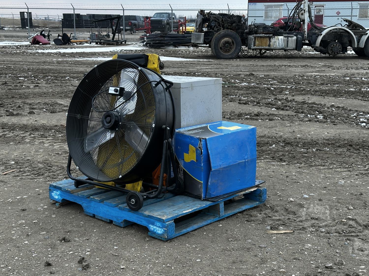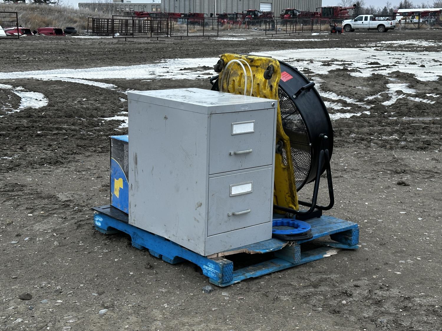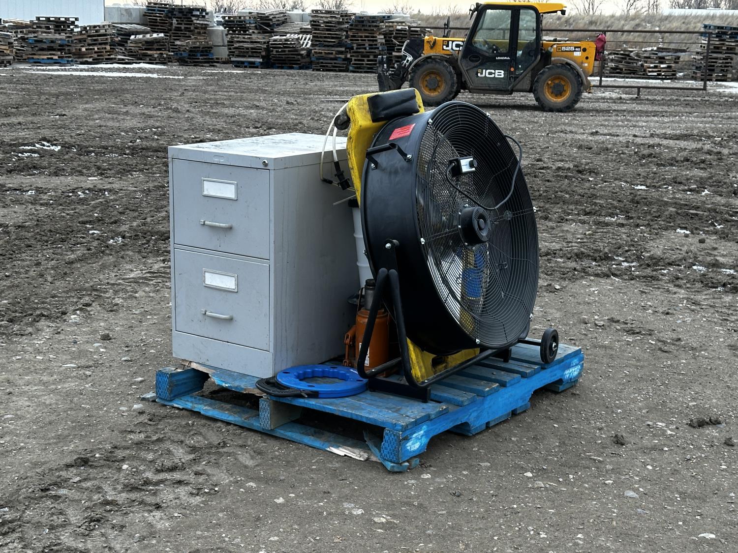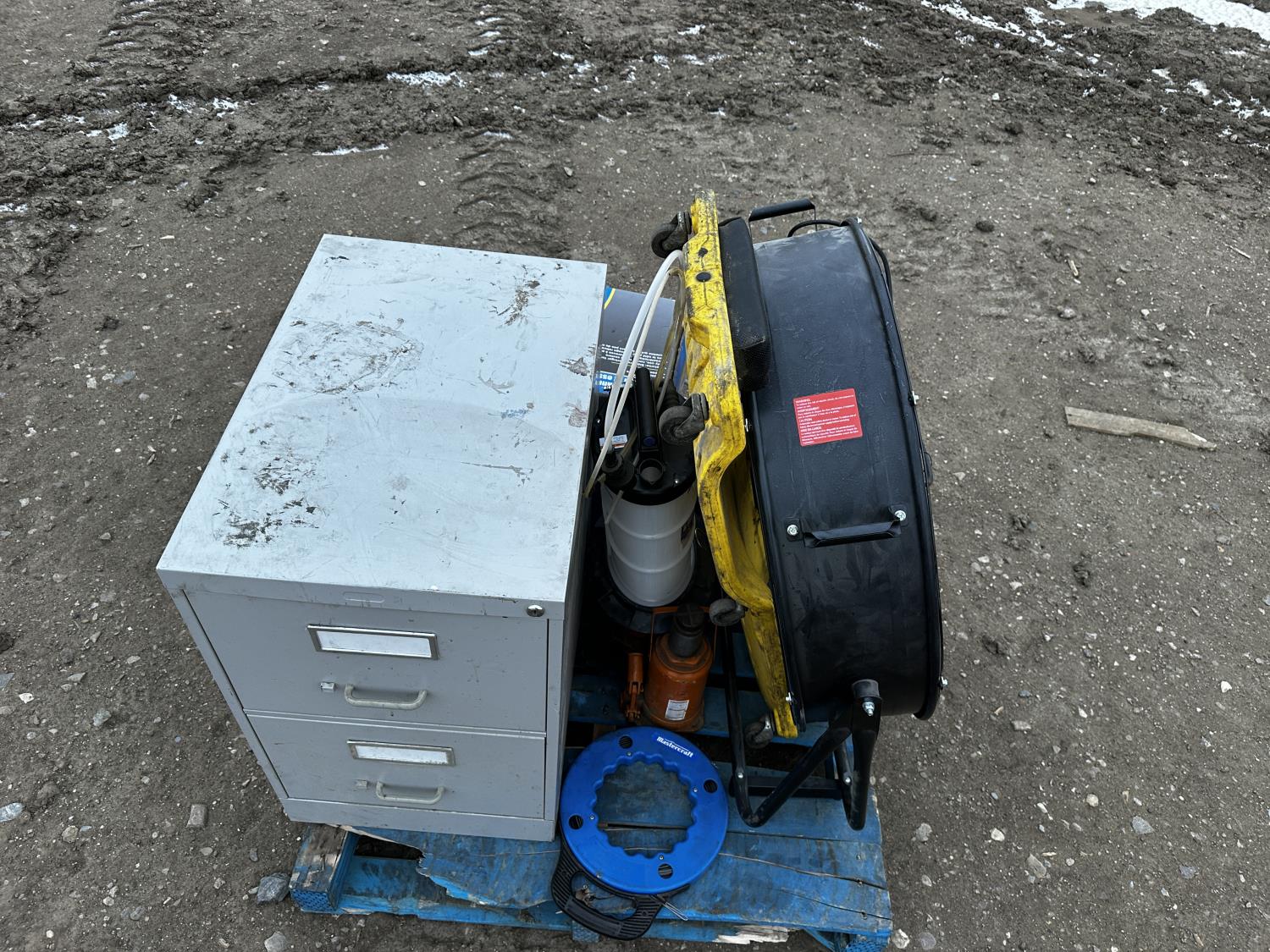 32 inch industrial fan, mop bucket, bottle jack, drain snake, filing cabinet