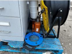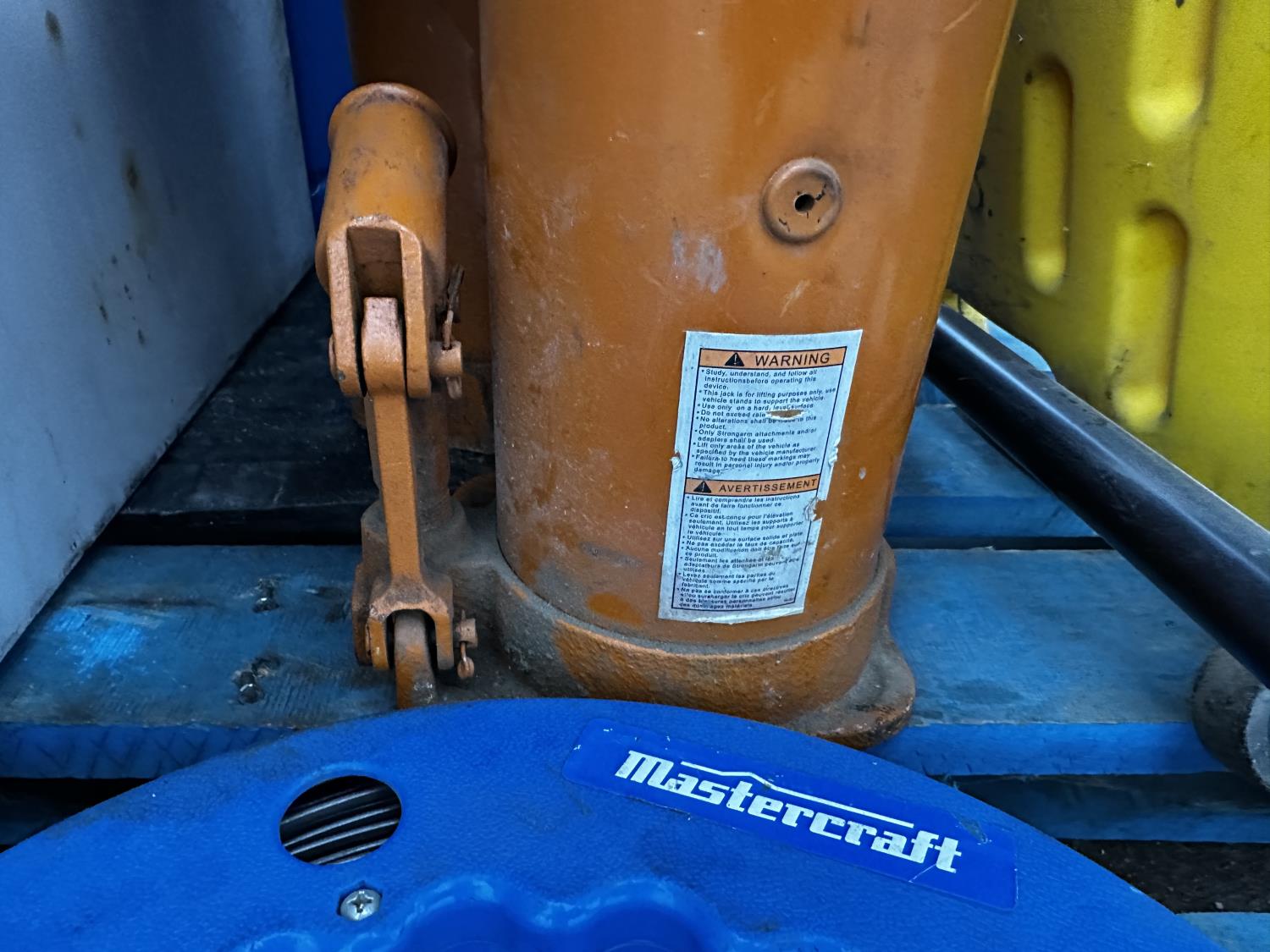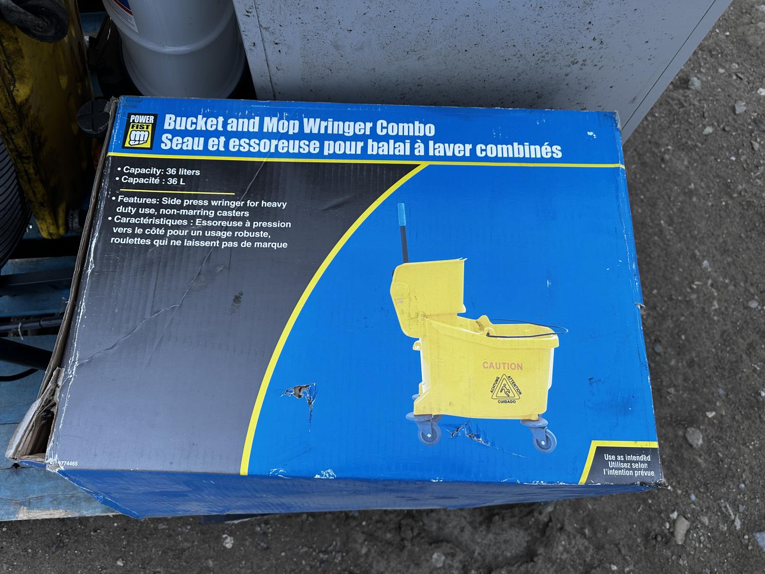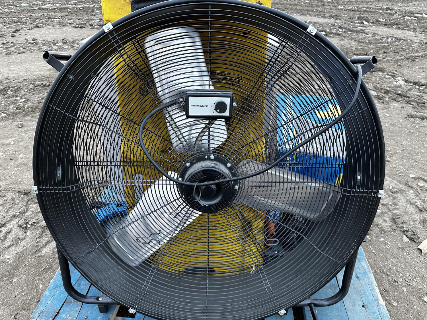 32 inch industrial fan, mop bucket, bottle jack, drain snake, filing cabinet