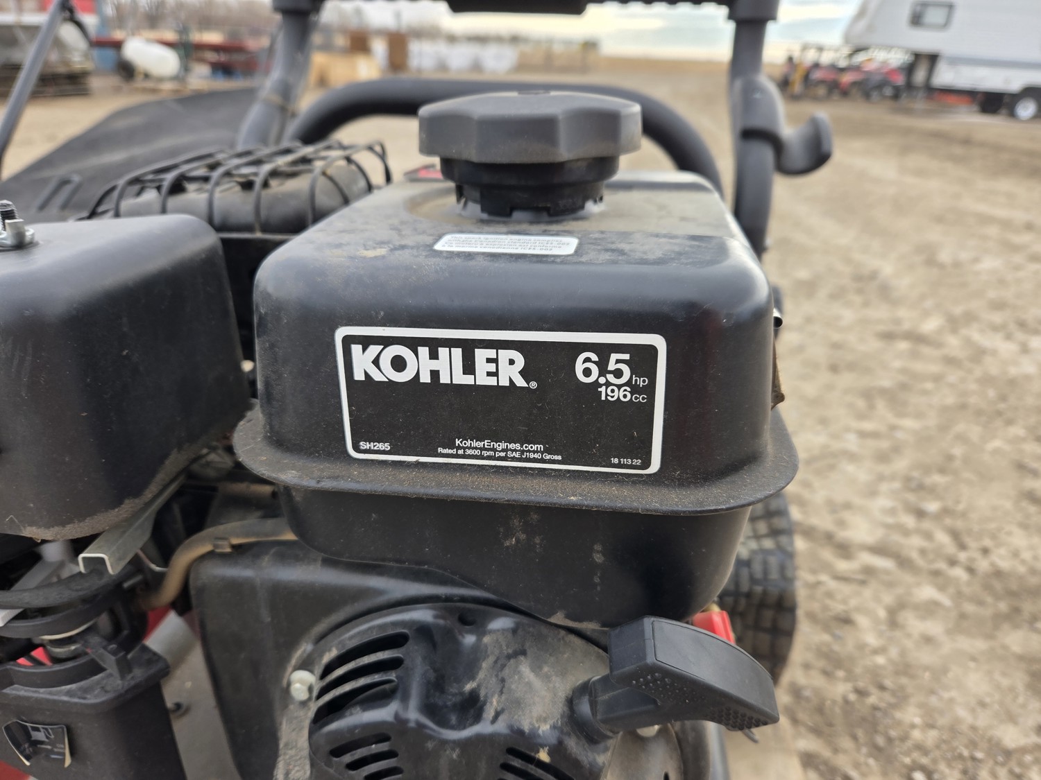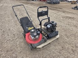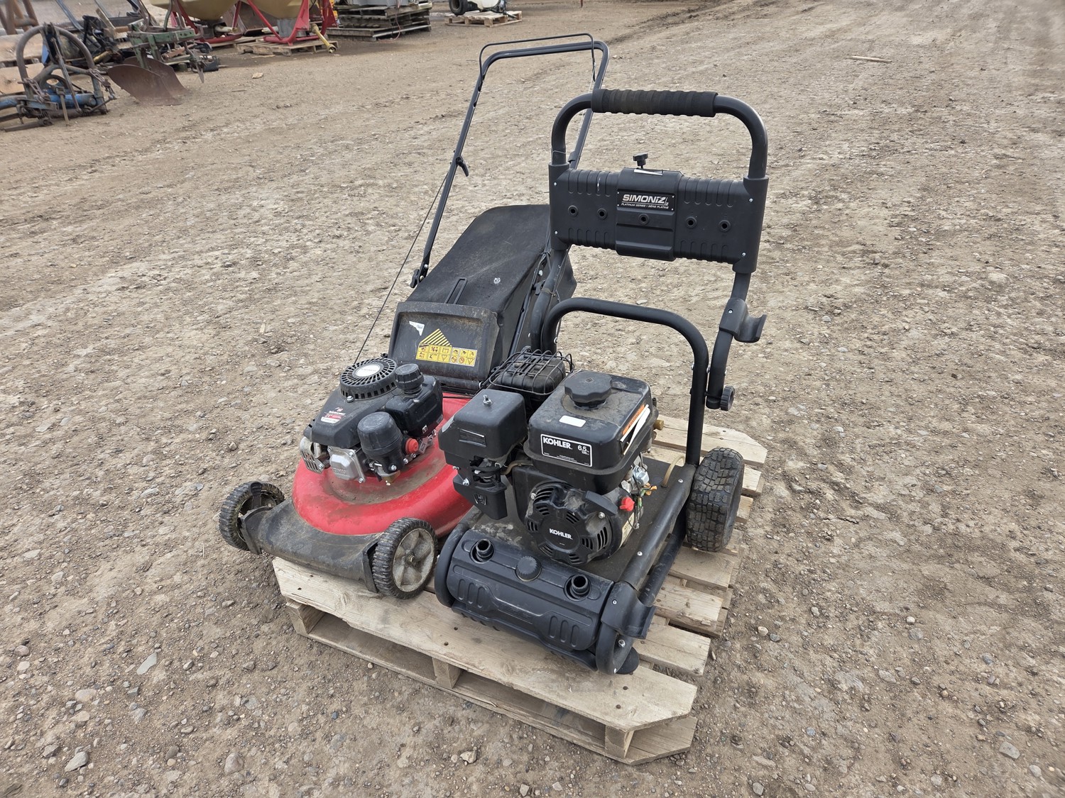 Pushmower: 21 inch deck, Powermore 132 cc engine, adjustable height, grass bag. Pressure washer: Kohler 6.5 HP engine, no wand.