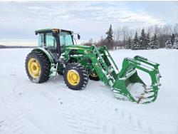 John Deere H310 loader, Q/A, 96 inch bucket, grapple, grill guard, mid mount hydraulic connection, John Deere 4.5 L 4 cylinder 137 HP, engine, 115 PTO HP, 9 speed partial synchro transmission, left hand power shuttle, cab, rear differential lock, joystick, A/C, radio, buddy seat, 540/1000 PTO, 3 point hitch, 3 rear hydraulic outlets, rear wheel weights, 14.9-24 front tires, 18.4-38 rear tires