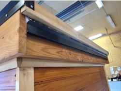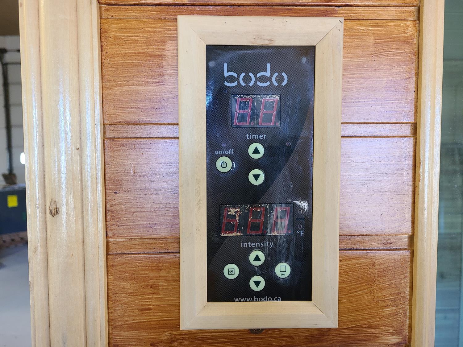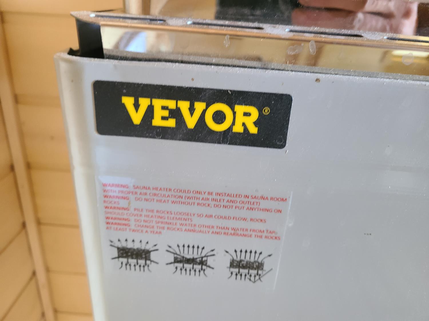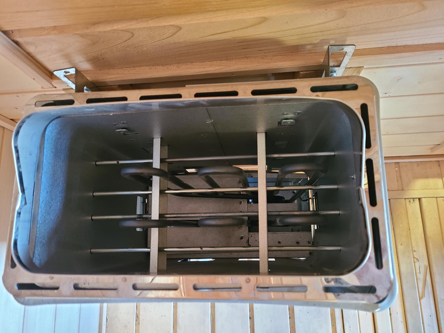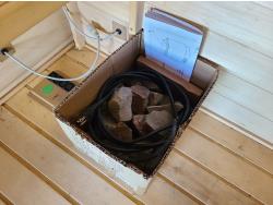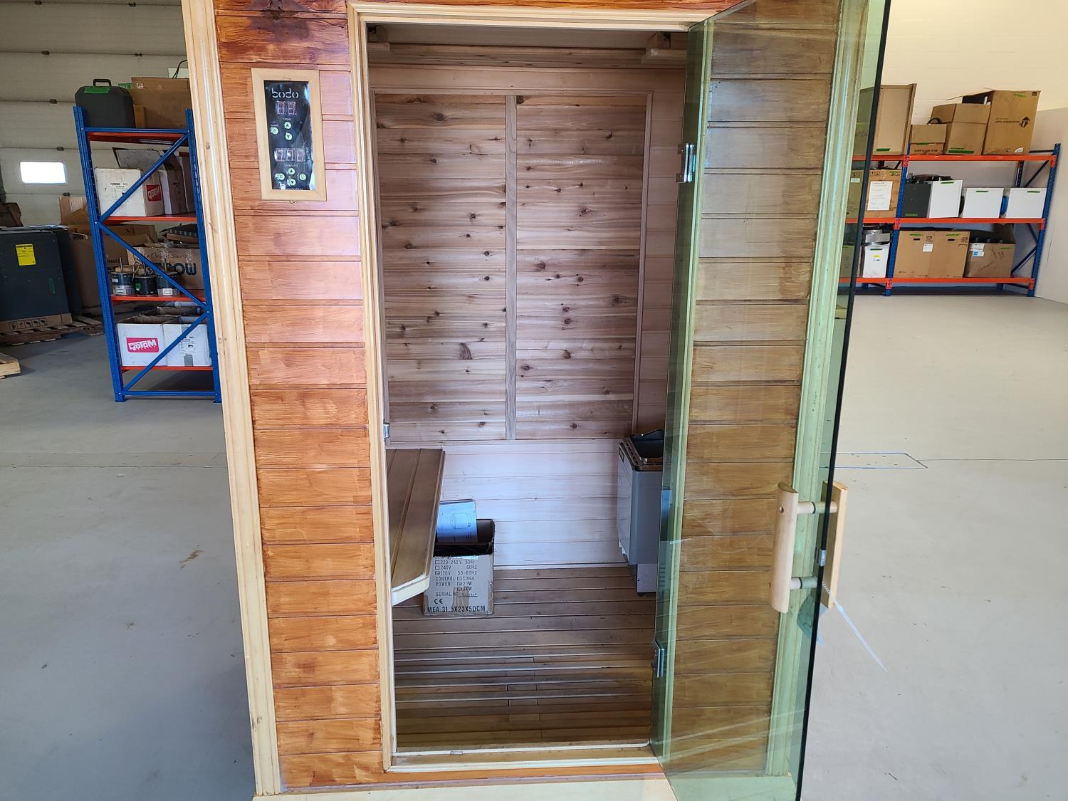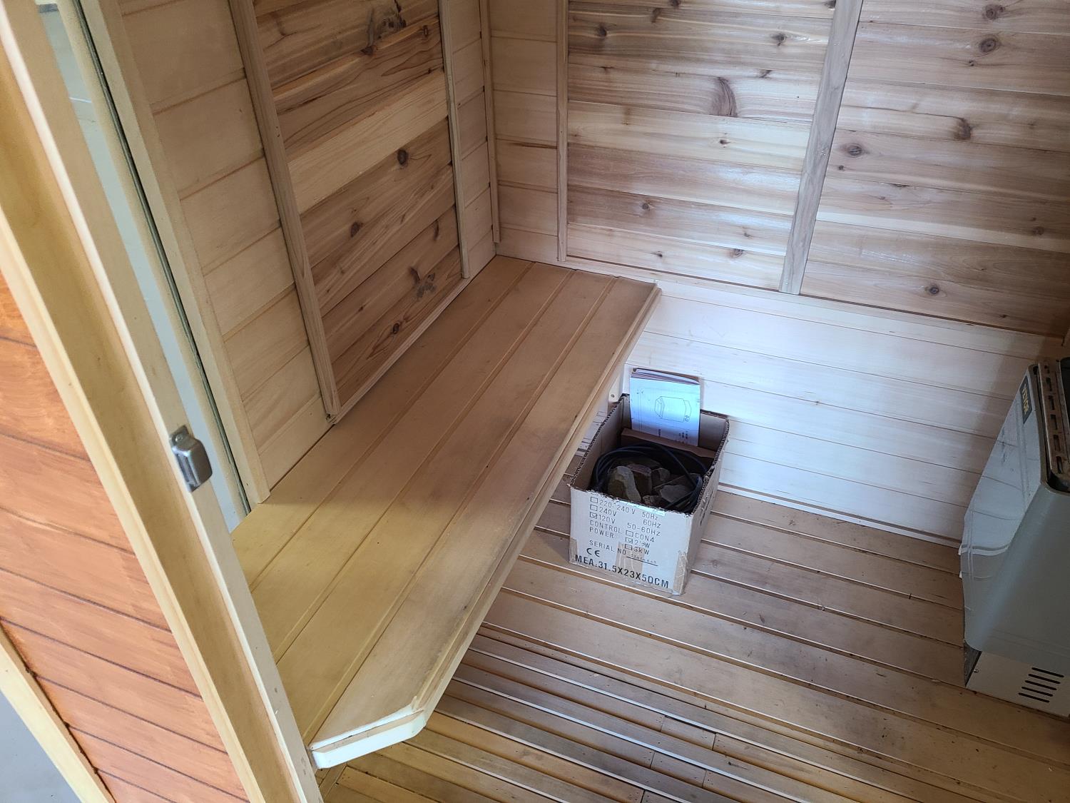 electric 2 kW heater, 10 v, 2 amp, sauna rocks, aspen/cedar interior, LED interior & exterior lights, full glass door, on castors for moving around on smooth floor, flat roof with seamless EPDM rubber, roof installed for outdoor use with rock ballast, larch/tamarack exterior trim