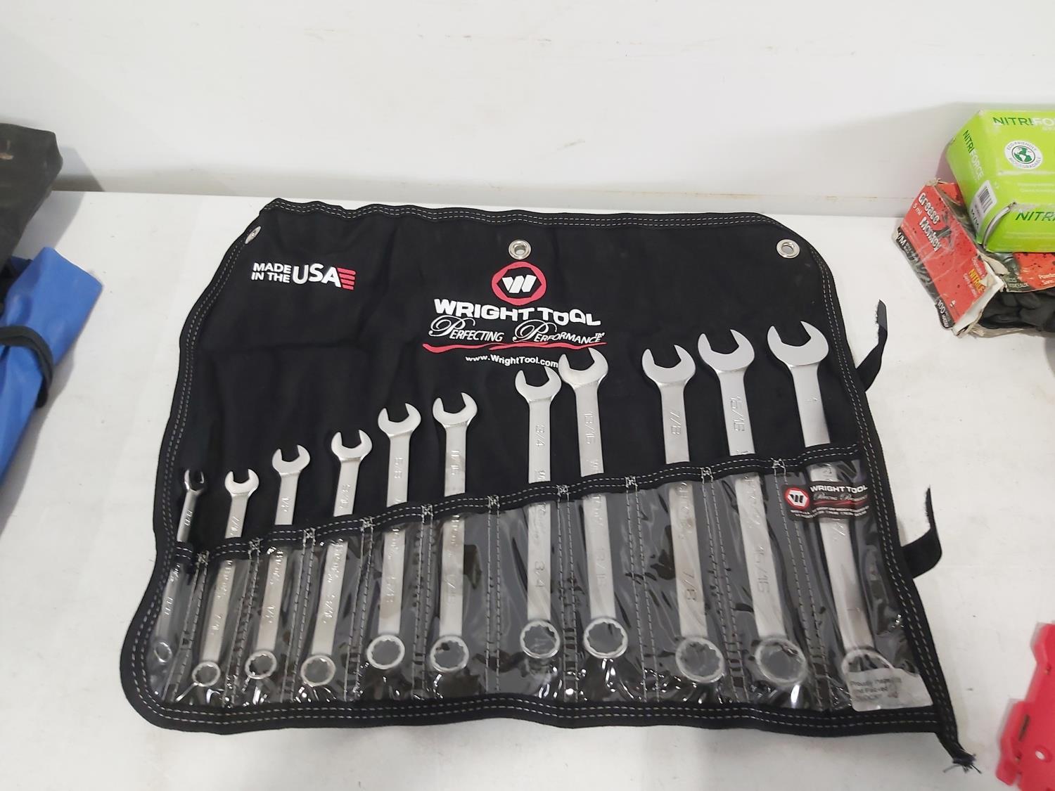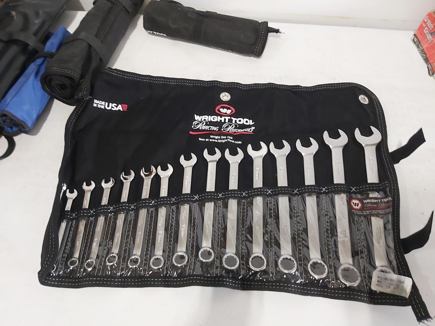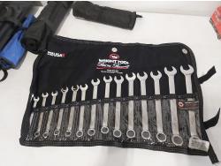 21 piece metric combination wrenches 6 to 32 mm, Wright Tools 11 piece imperial combination wrenches 3/8 inch to 1 inch, Williams 9 piece imperial 3/8 inch to 7/8 inch, Wright Tools 15 piece metric combination wrenches 7 mm to 22 mm, Wright Tools 7 piece imperial combination wrenches 1/4 inch to 5/8 inch, Williams double flex head 4 piece imperial, 12 inch combination bow and hacksaw