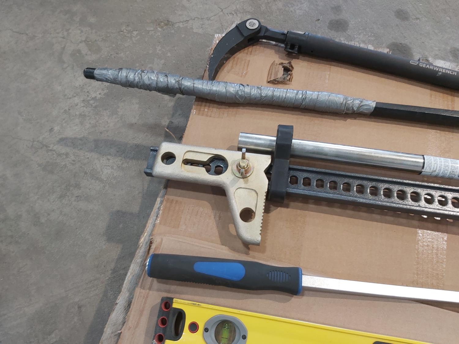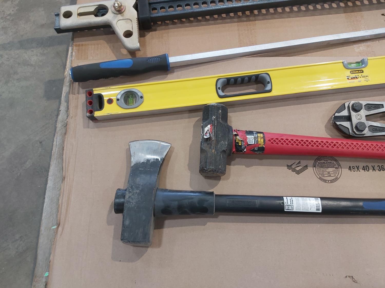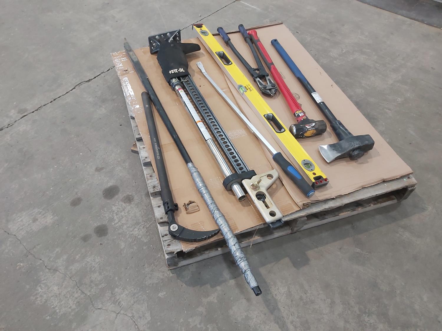 Hi-Lift jack-all, gear wrench bar, 48 inch level, 24 inch bolt cutters, sledge hammer, 8 lb splitting maul, (2) pry bars