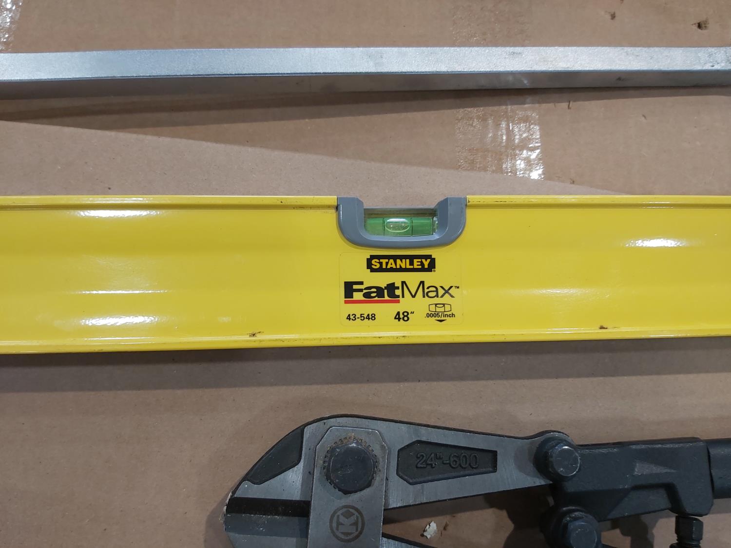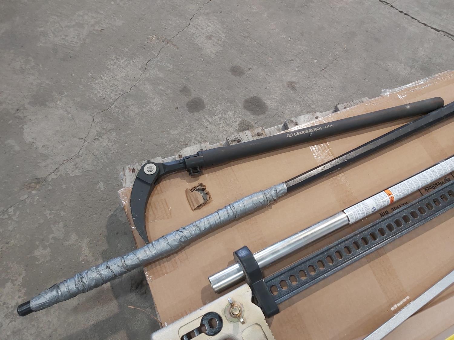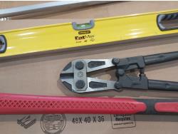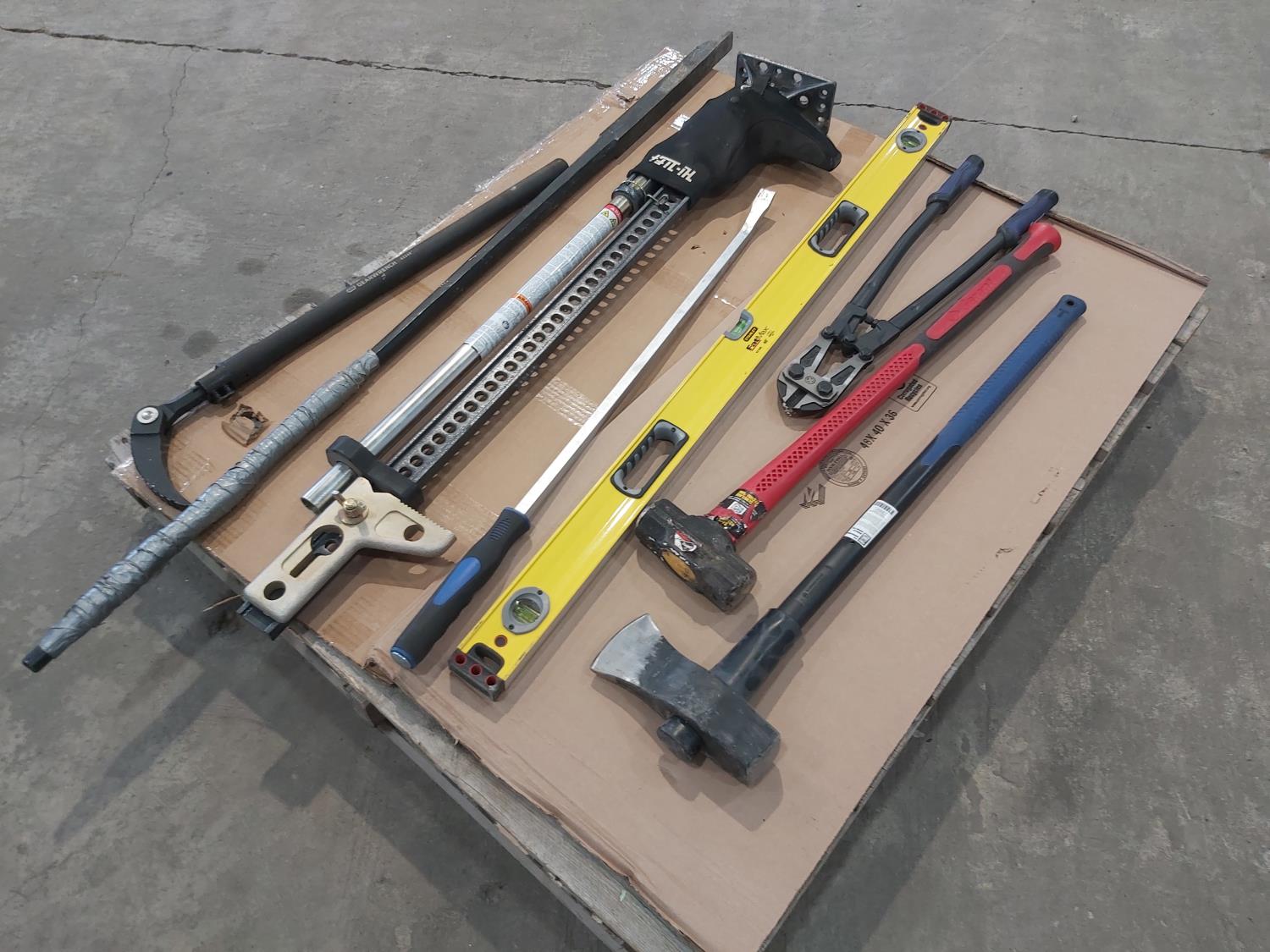 Hi-Lift jack-all, gear wrench bar, 48 inch level, 24 inch bolt cutters, sledge hammer, 8 lb splitting maul, (2) pry bars