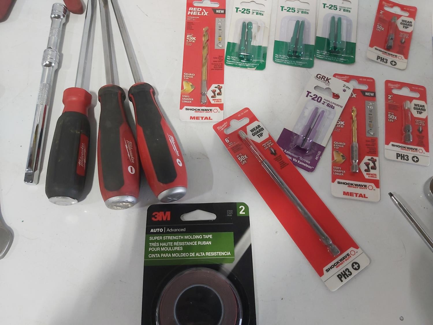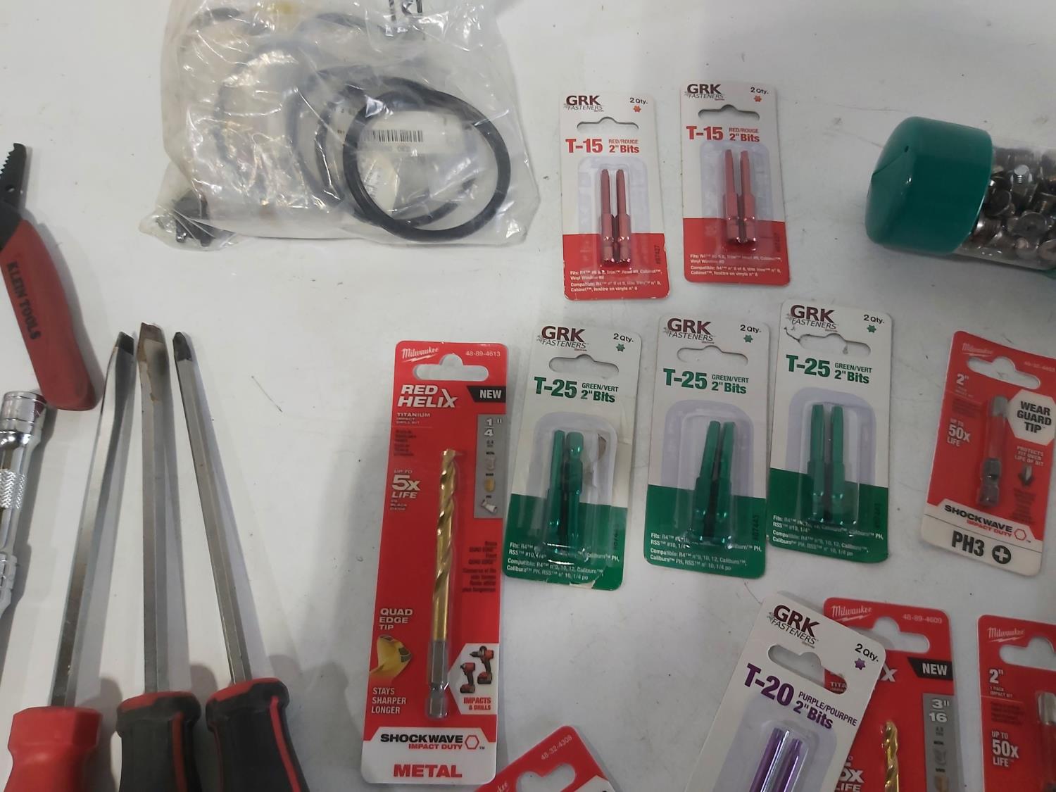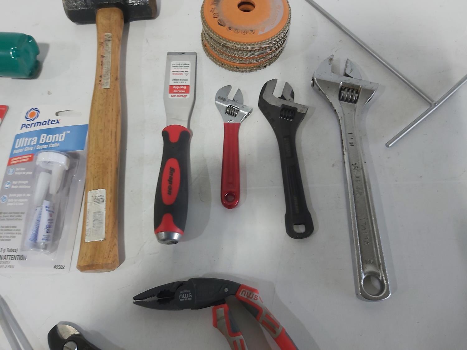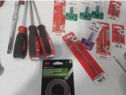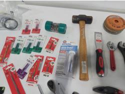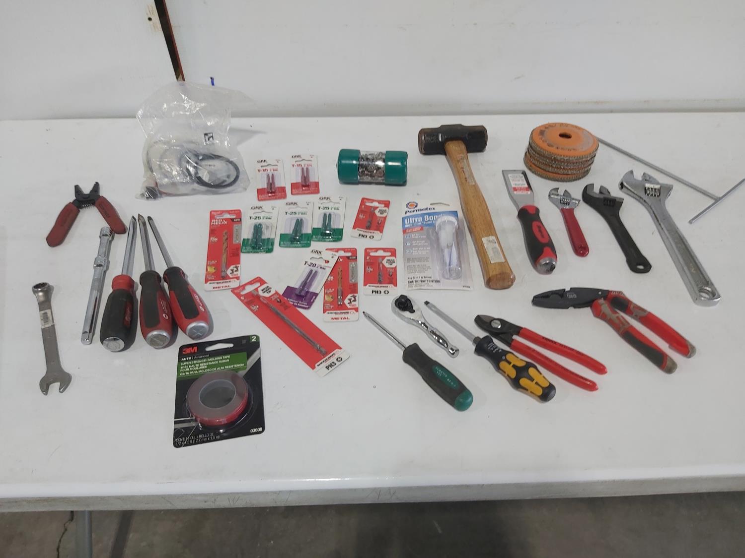 (5) screwdrivers, T-handle screwdriver, (3) adjustable wrenches, 1-1/2 inch chisel, 48 oz hammer, ergonomic pliers, snips, wire strippers, driver bits