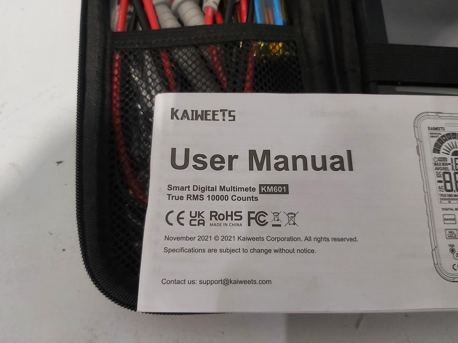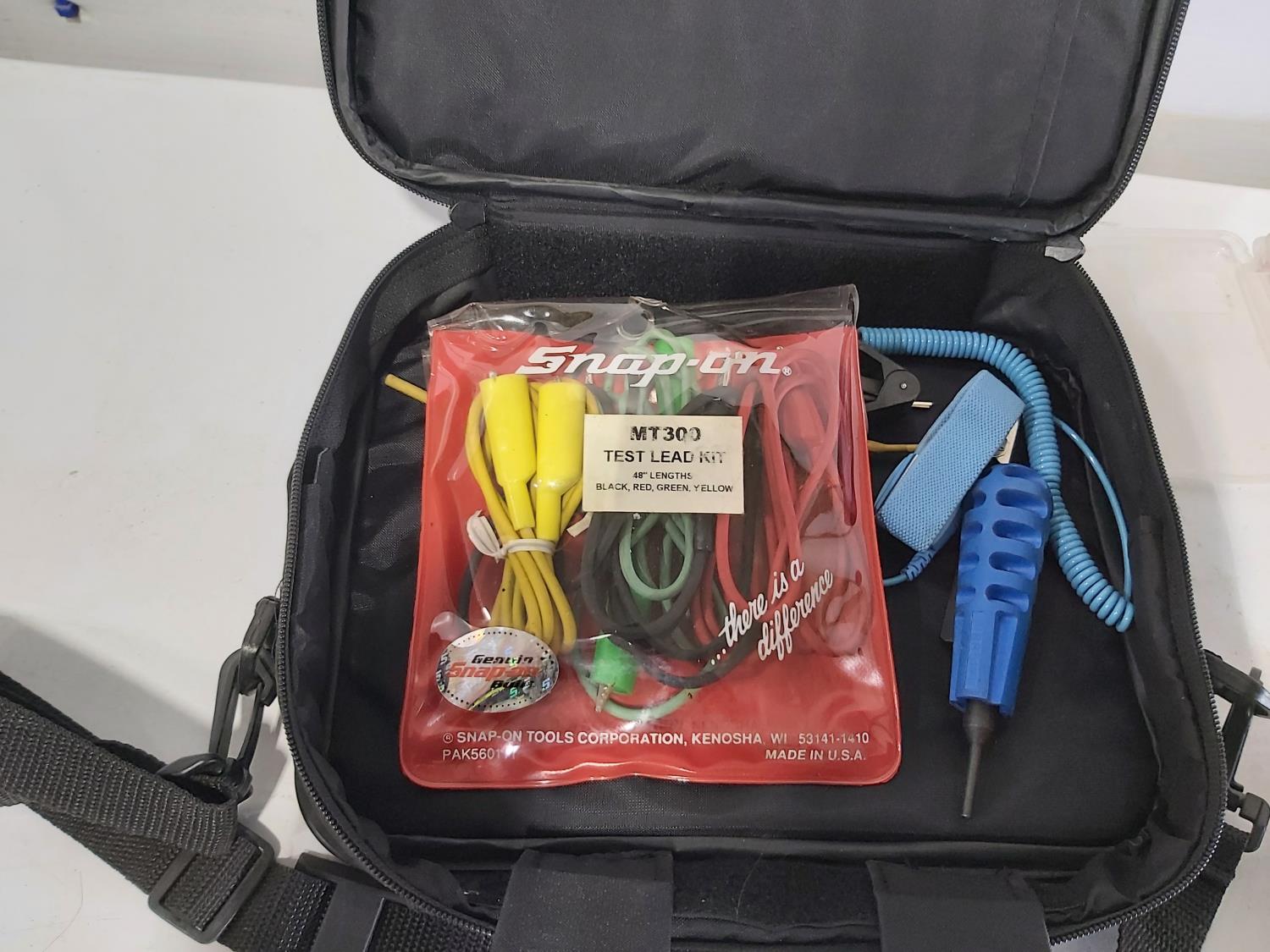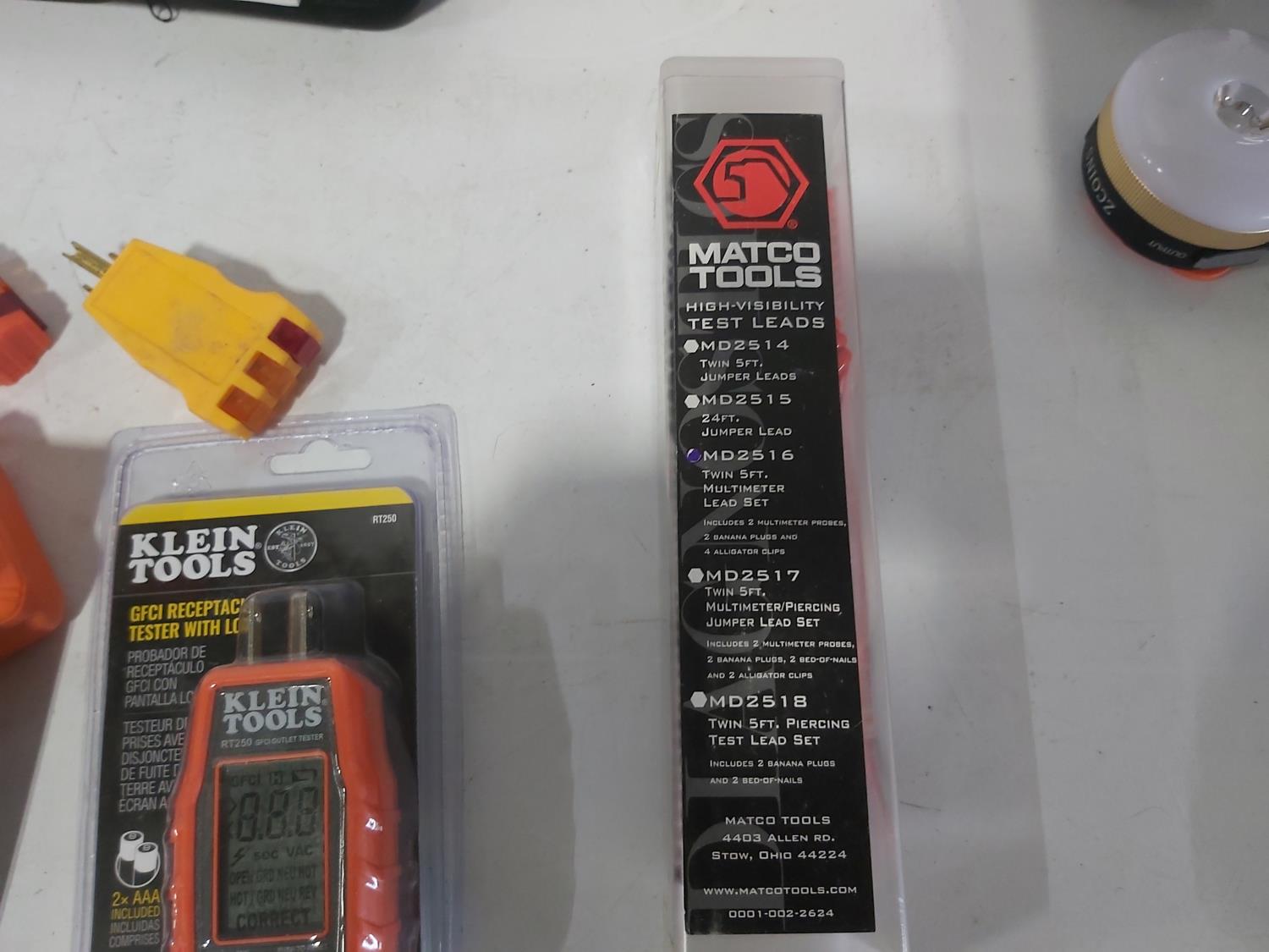(4) work lamps, Matco Tools test leads, Klein Tools receiver, Klein Tools GFCI receptacle tester, Klein Tools digital level, Kaiweets digital multimeter, Klein digital angle gauge, Snap-on test lead kits, (3) outlet testers, (3) voltage detectors