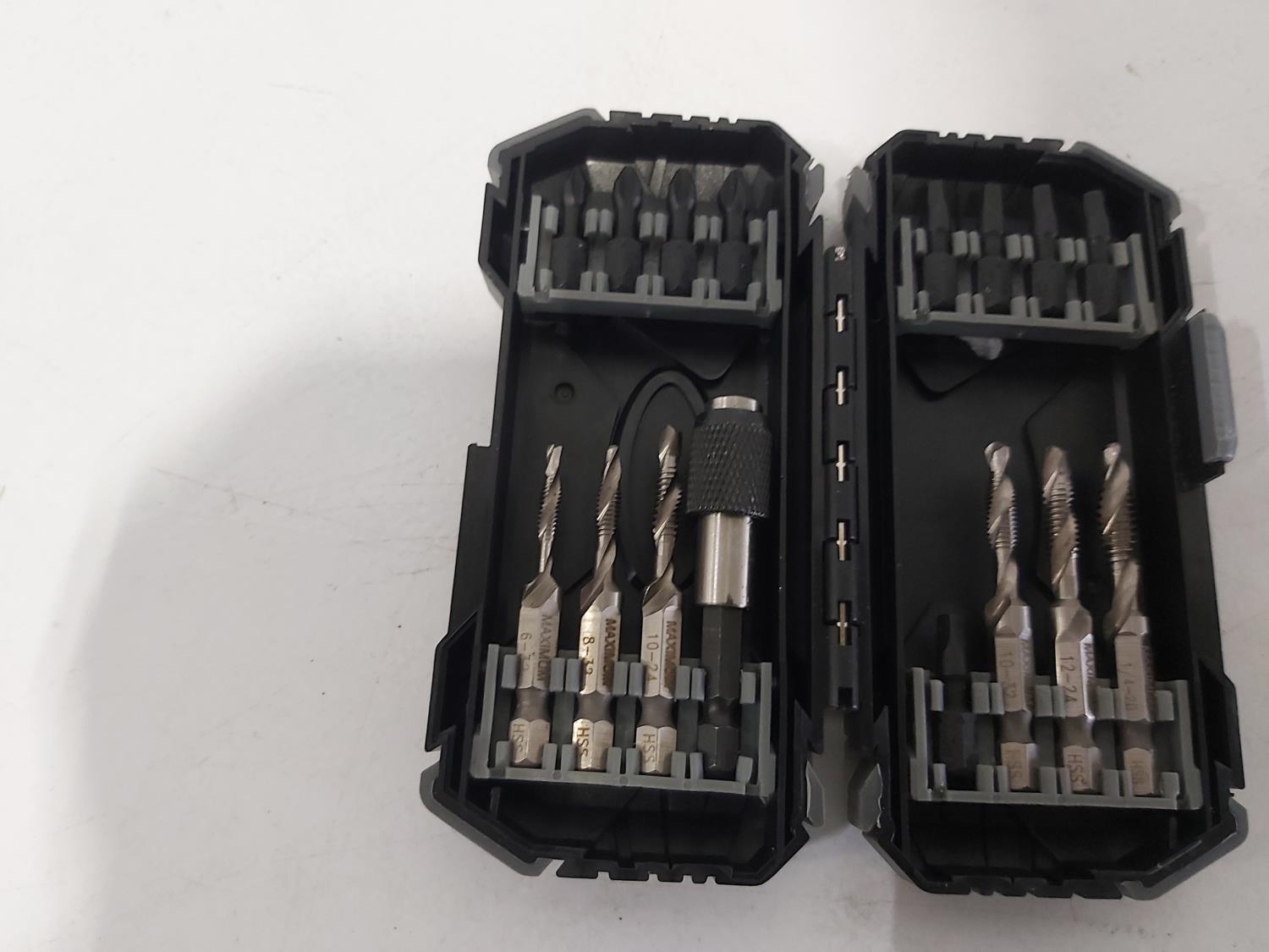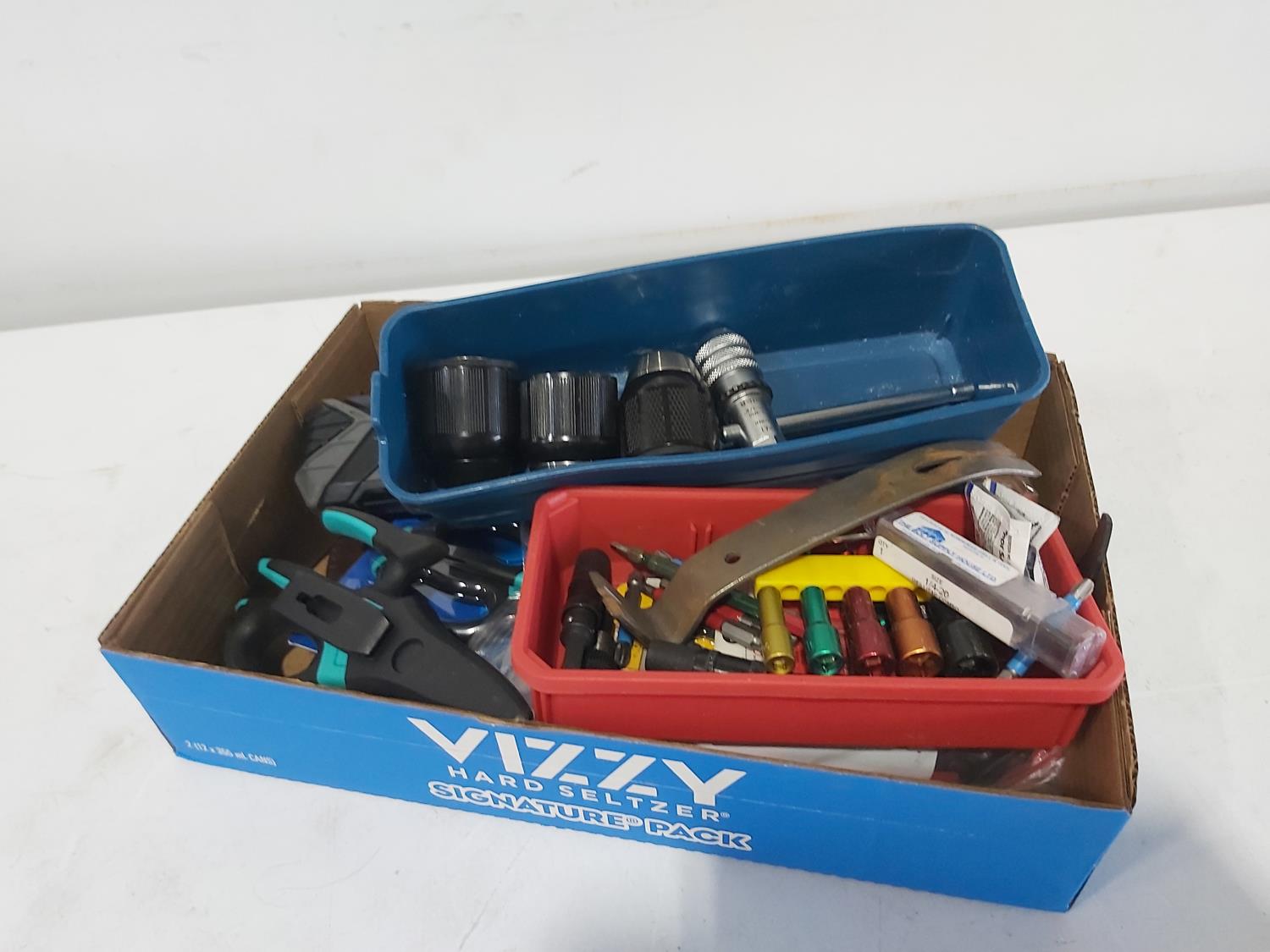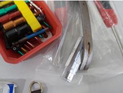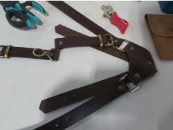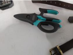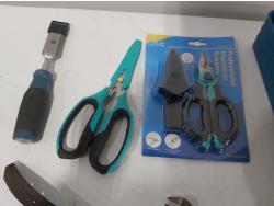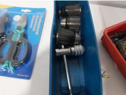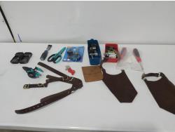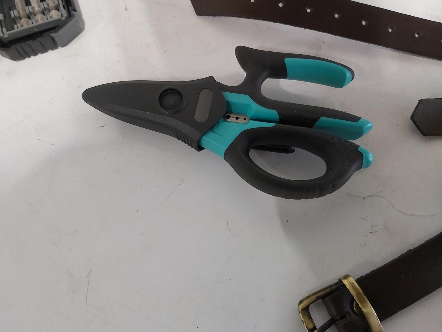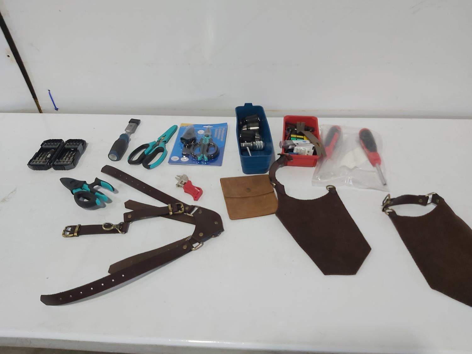 leather tool belts, leather wallet, industrial scissors, mini adjustable wrench, drill drive set, chisel, (4) chucks, (2) screwdrivers