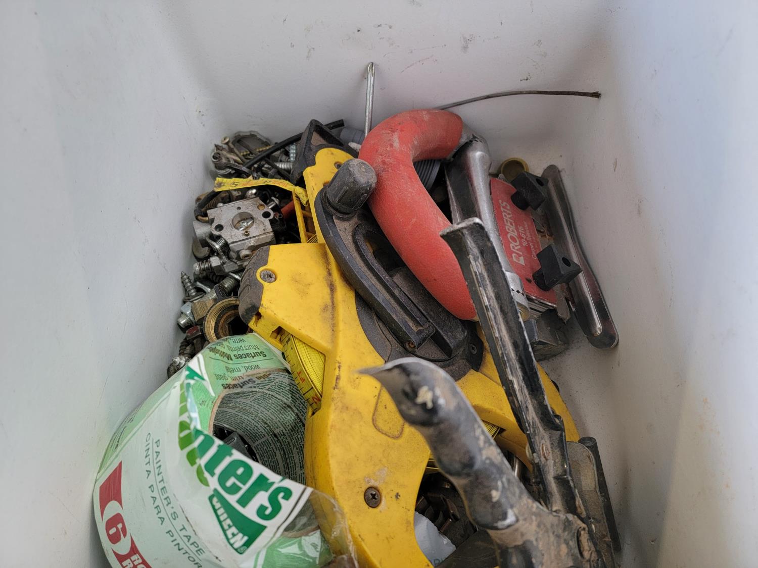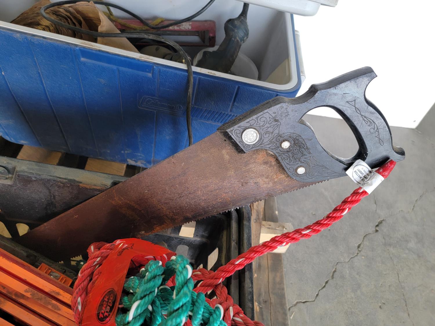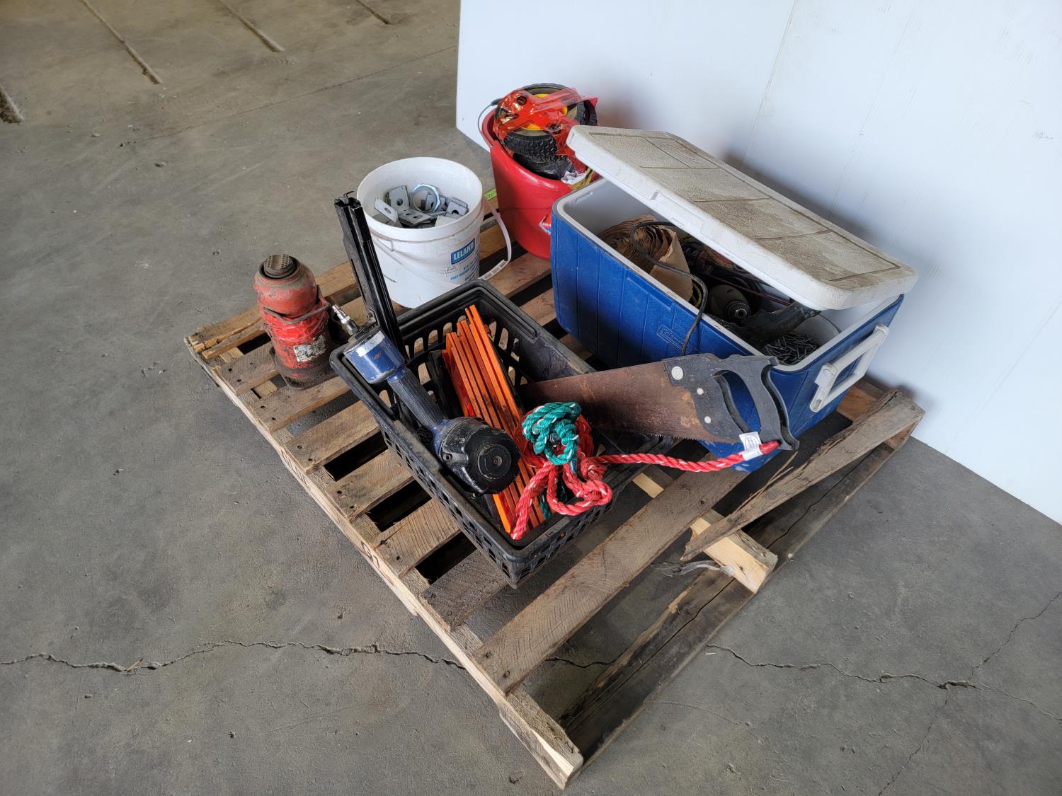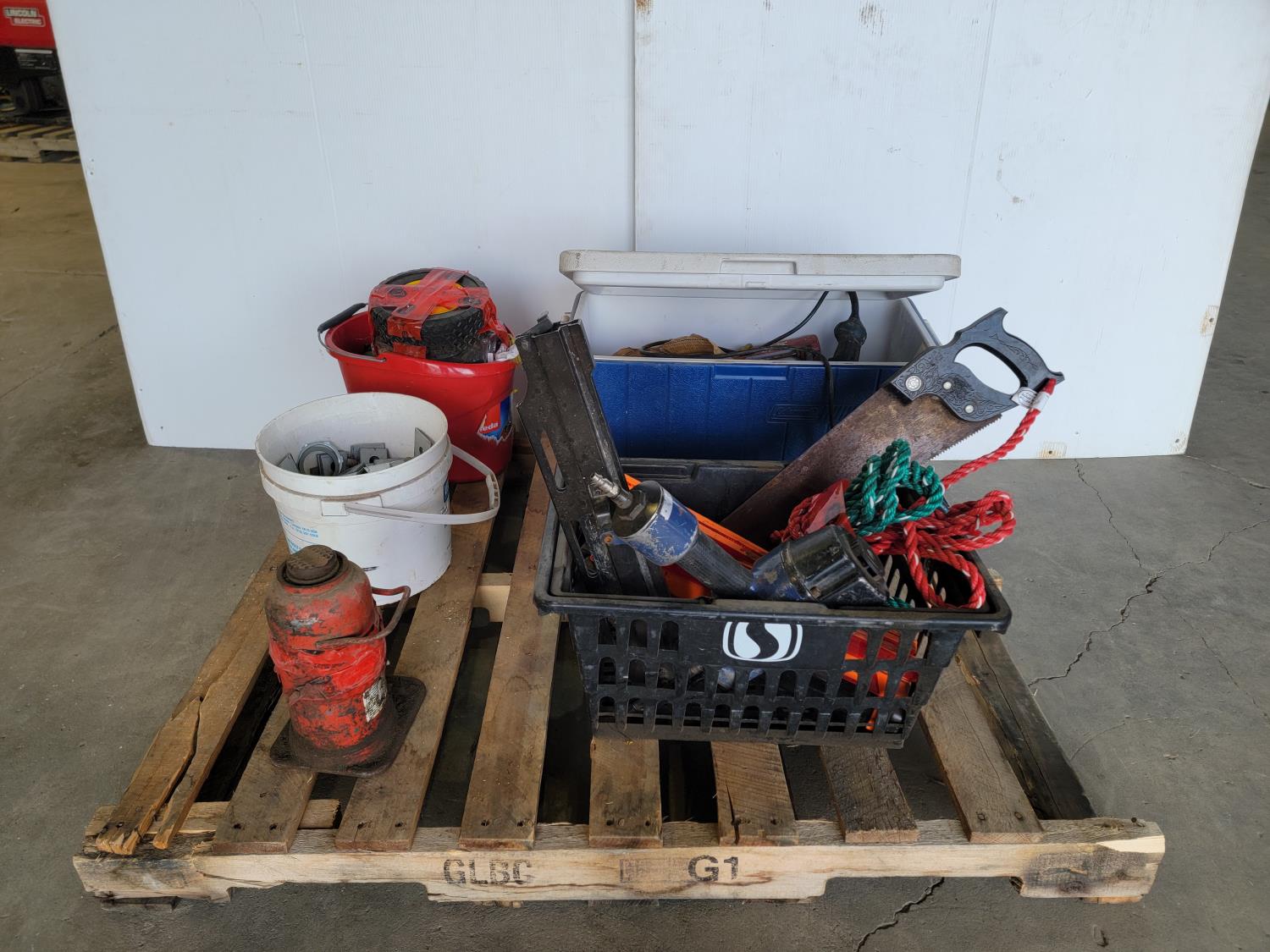 bottle jack, brad nailer, hand saw, triangle road flares, Mastercraft 1/2 inch impact wrench