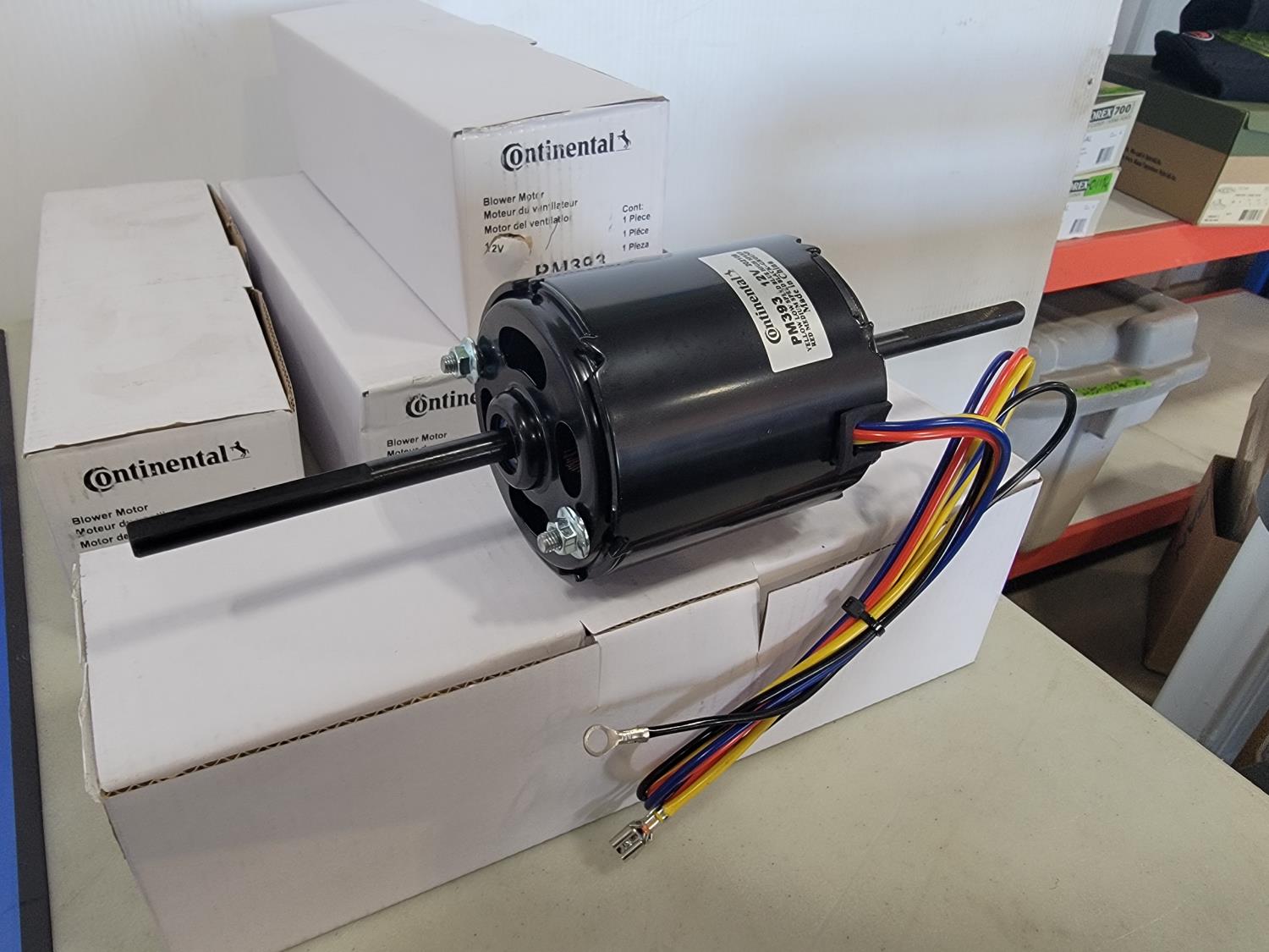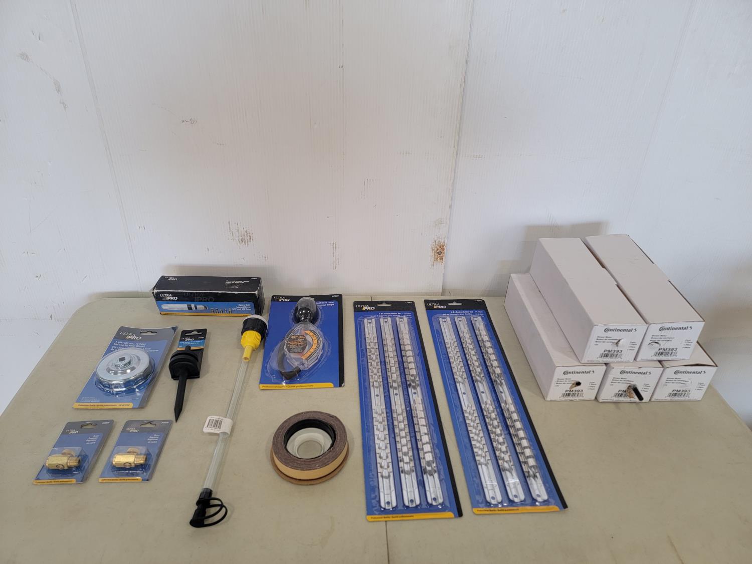 (5) Continental 12V blower motors, (2) 3 piece socket set holders, antifreeze tester, 1 inch x 10 yard handy roll, heavy duty 3/8 inch and 1/2 inch impact driver, 6 inch sharp point taper punch, 3-1/4 inch end cap oil filter wrench, (2) brass regulators