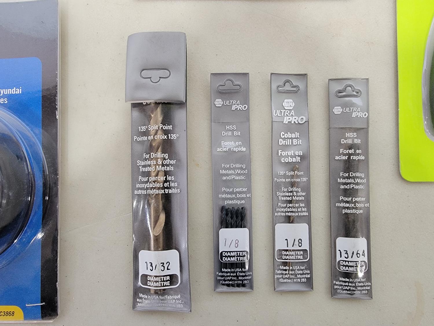 (5) Continental 12V blower motors, (2) 16 inch socket holders, antifreeze tester, locking ring pliers, 11 piece 3/8 inch drive socket set, drum brake adjustment tool, drill bits, oil filter cap wrench