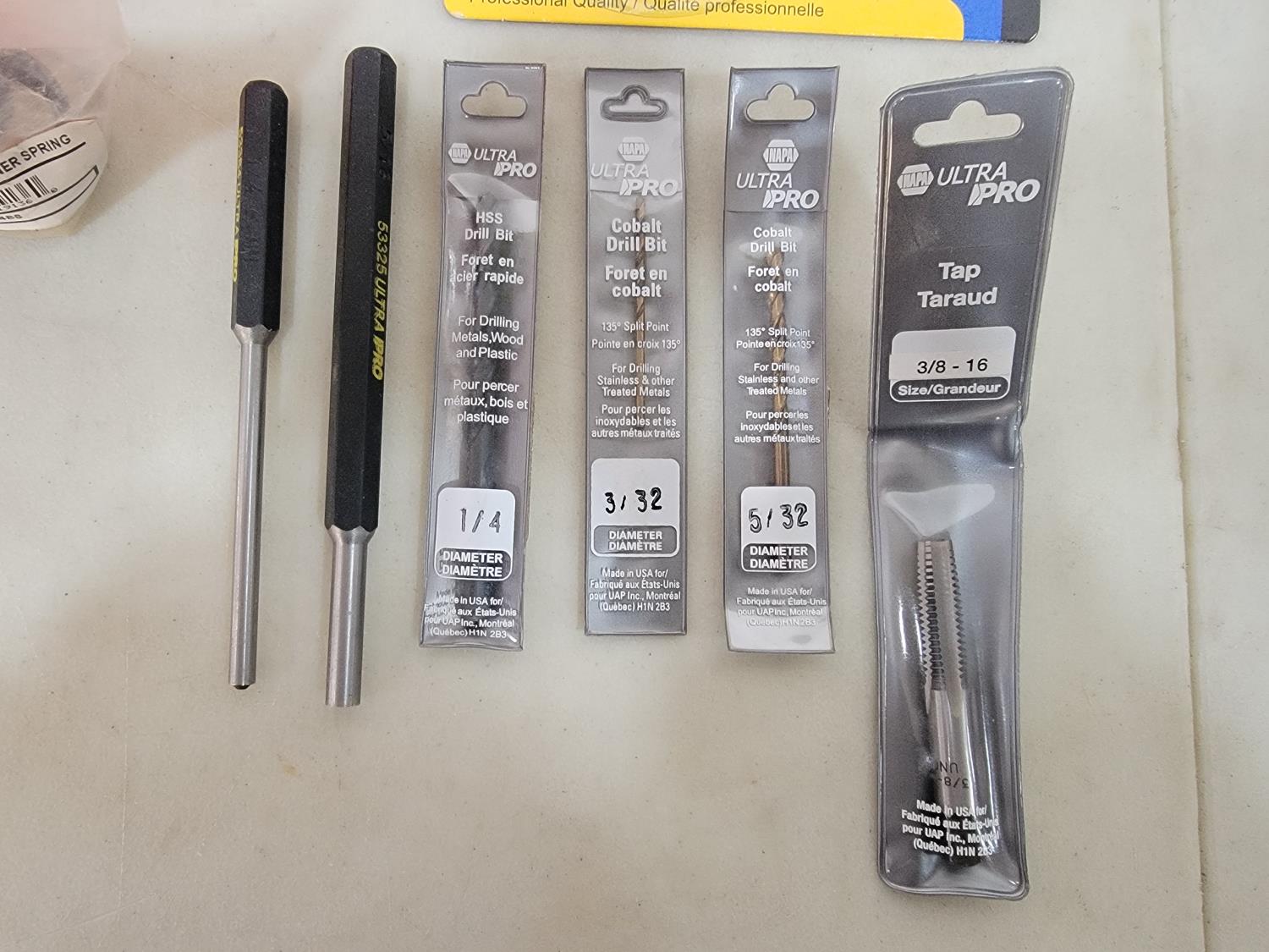 (5) Continental 12V blower motors, oil filter cap wrench, 3/8 inch drive flare nut crow foot, stones for brake cylinder hone, gravity feed paint spray gun, drill bits, antifreeze tester, air hammer retainer springs