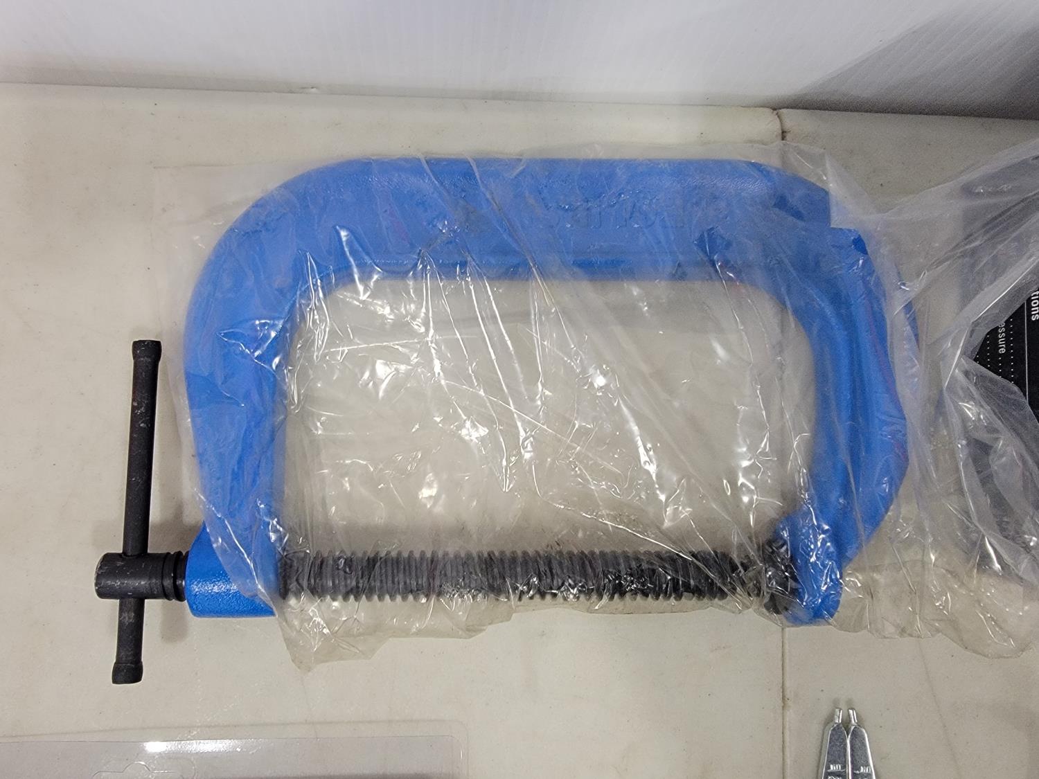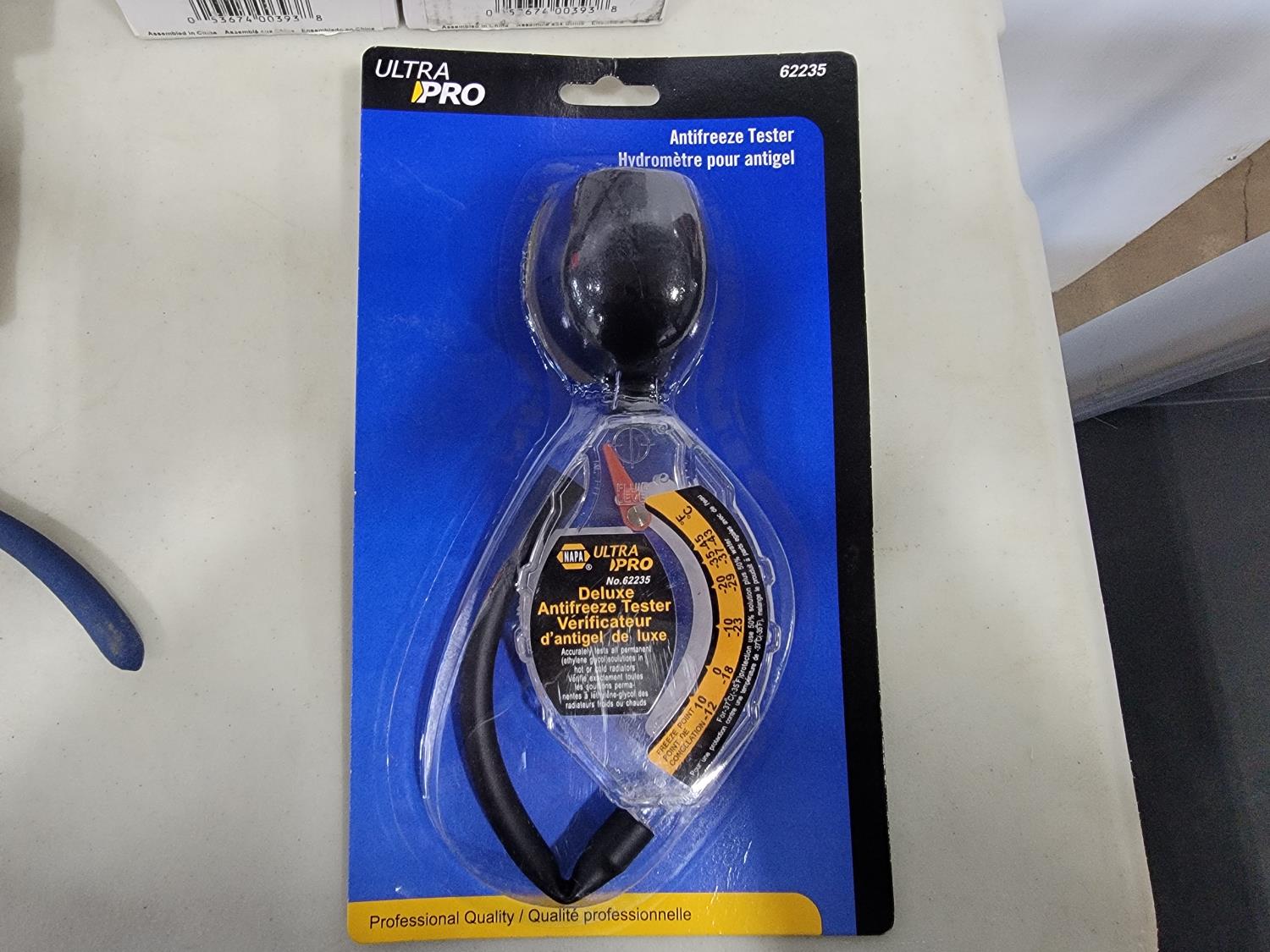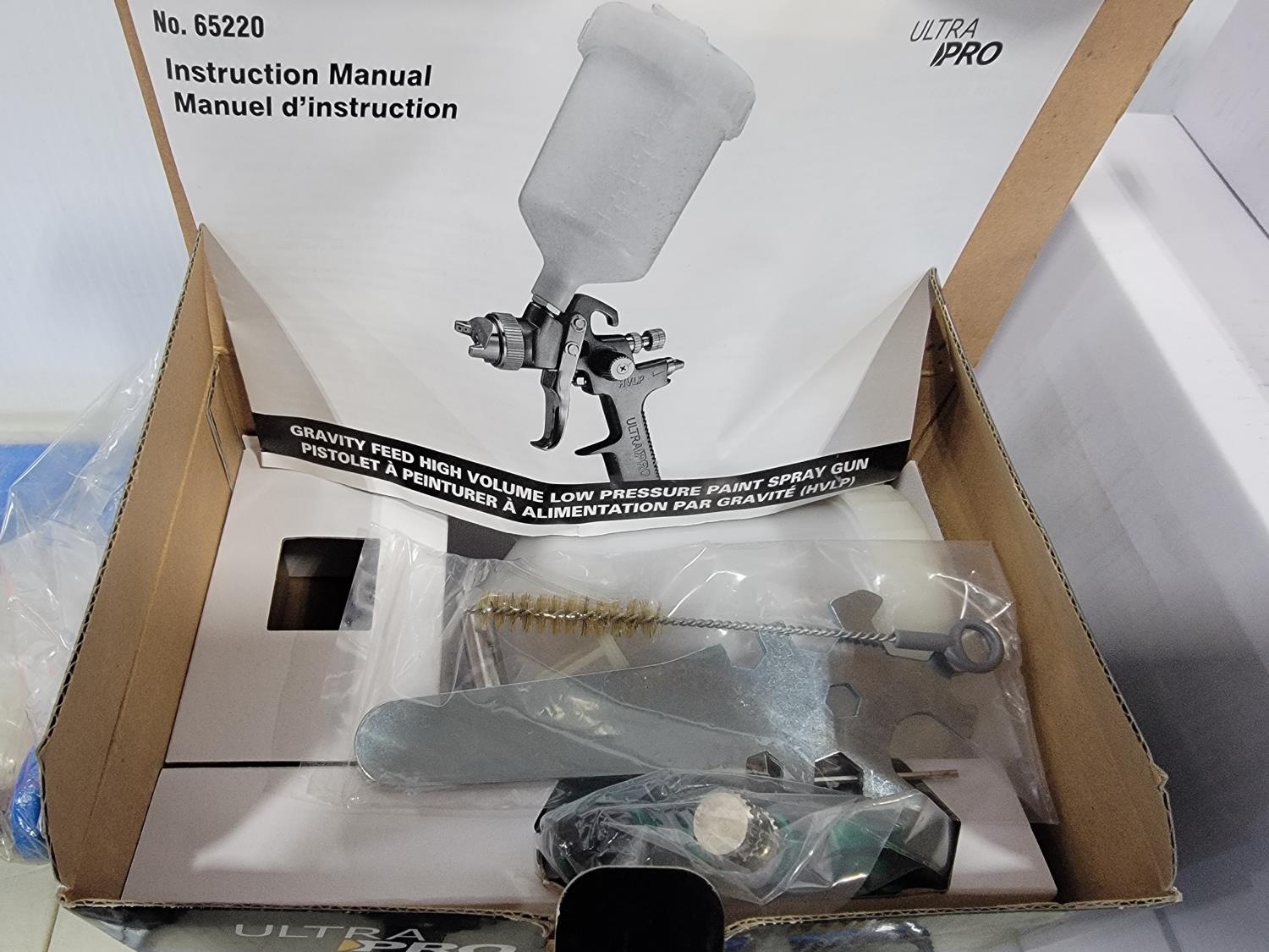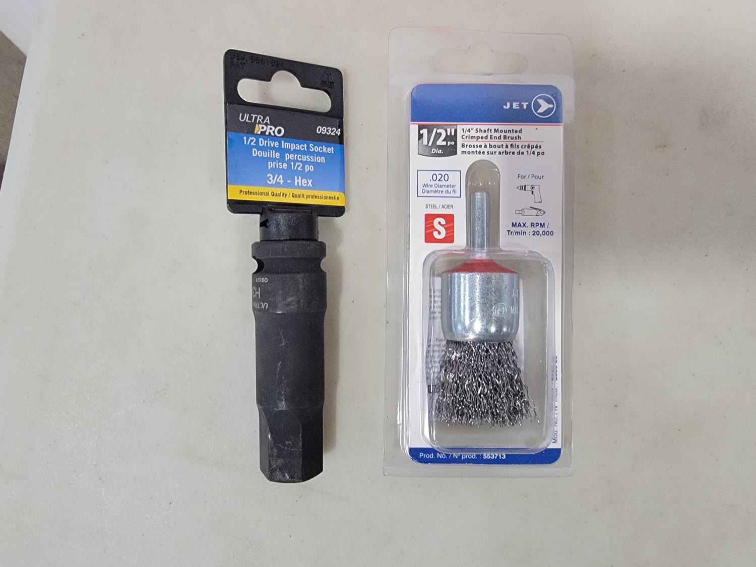 (5) Continental 12V blower motors, antifreeze tester, gravity feed HVLP paint spray gun, snap ring pliers, C-clamp, 8 inch crimped wire wheel brush, 1/2 inch drive impact socket, 1/4 inch shaft mounted crimped end brush