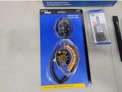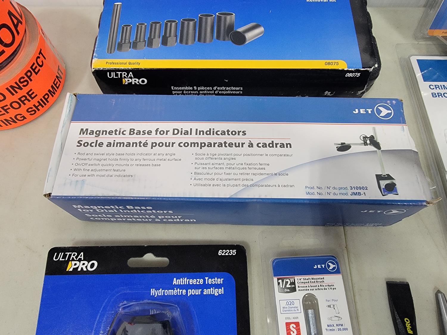 (5) Continental 12V blower motors, laser tachometer, 8 inch crimped wire wheel brush, snap ring pliers, 1/4 inch shaft mounted crimped end brush, antifreeze tester, magnetic base for dial indicators, 9 piece hubcap and wheel lock removal kit