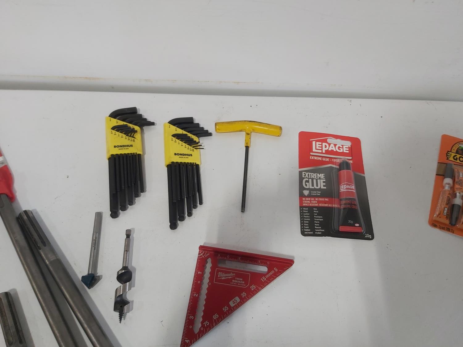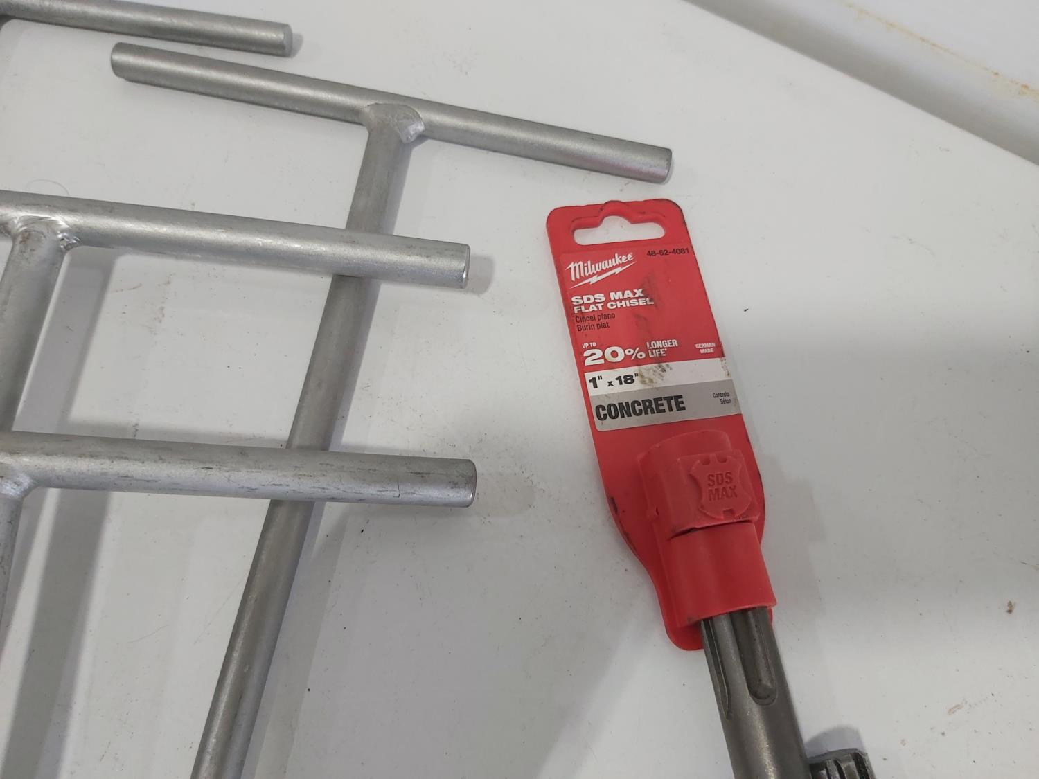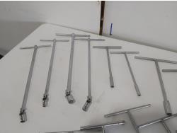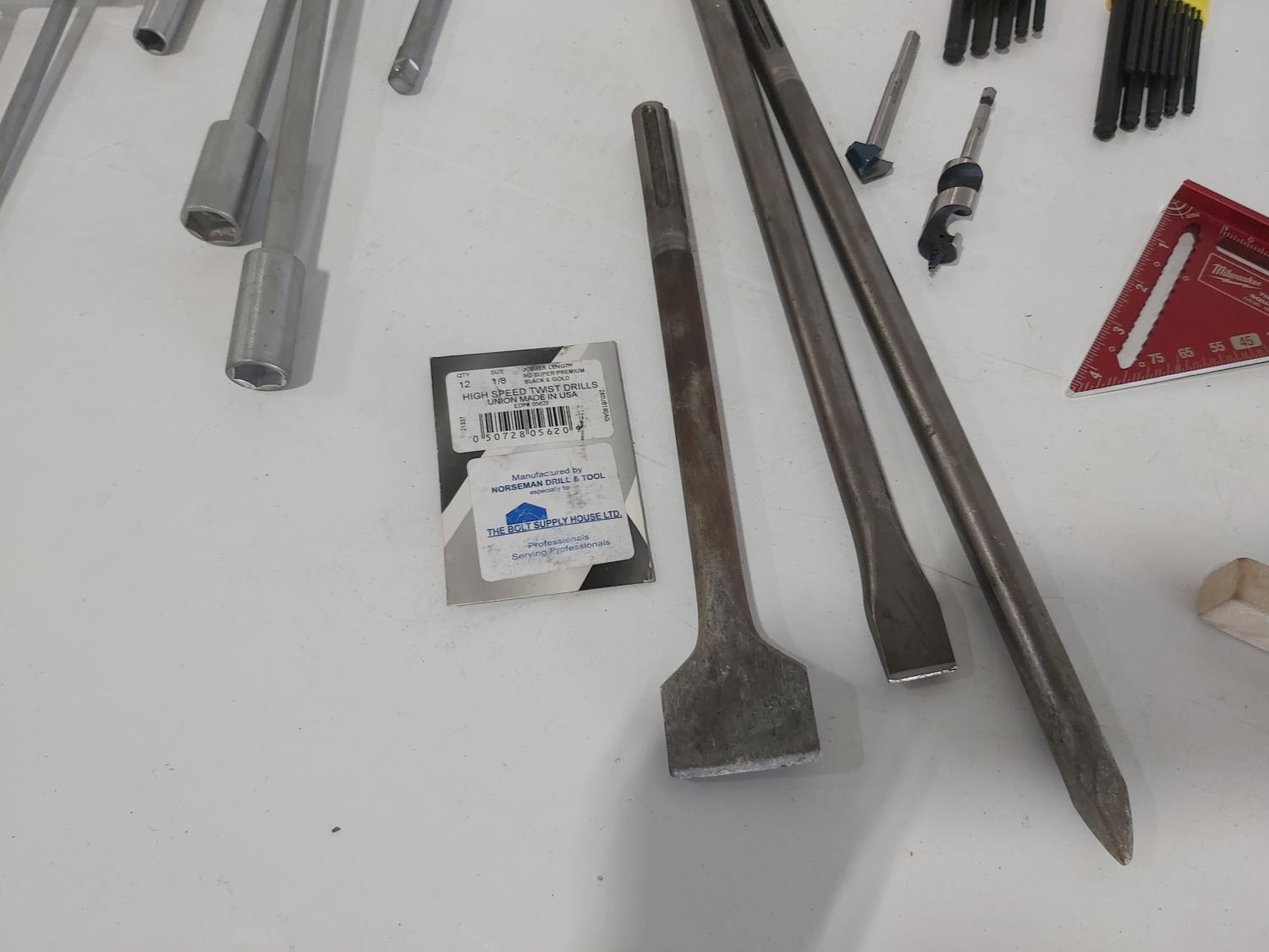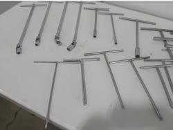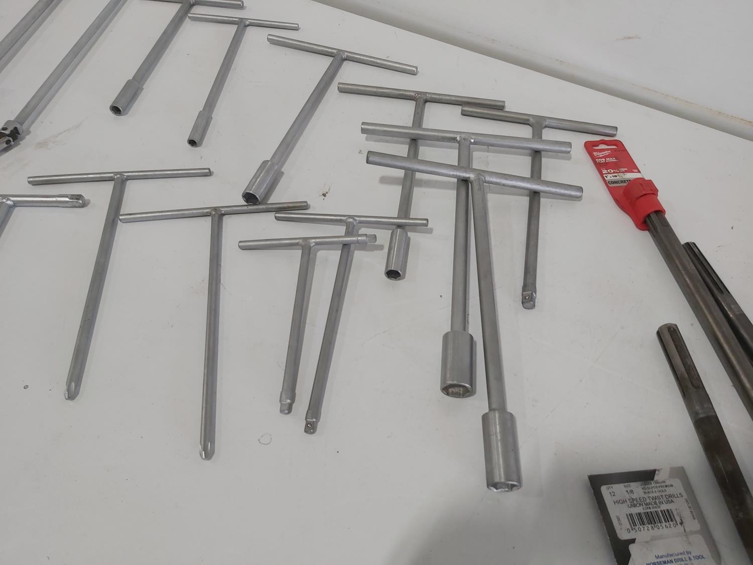 (17) T-handle socket wrenches and drivers, wire brush, Milwaukee 1 inch x 18 inch flat concrete chisel (unused), quick attach flat chisel, (2) sets of Allen keys
