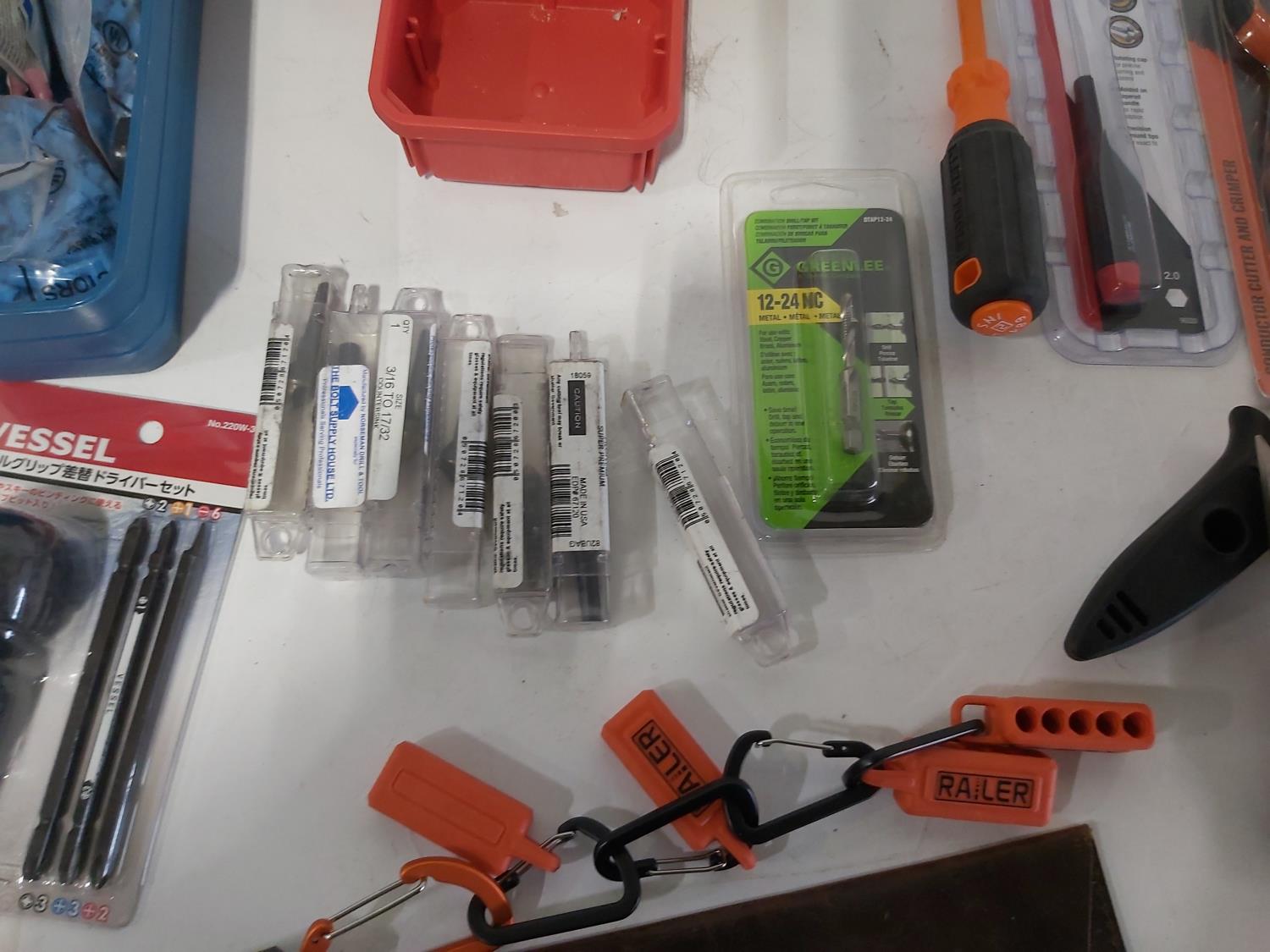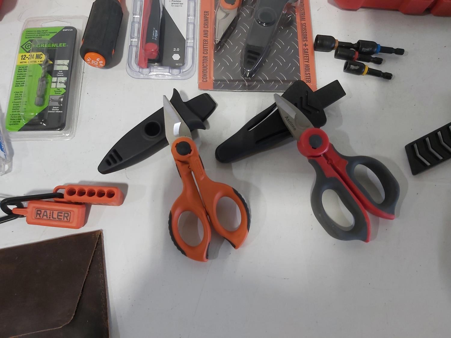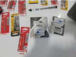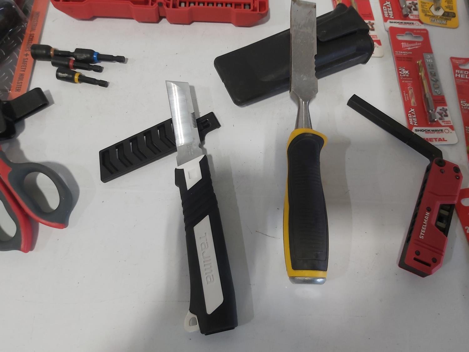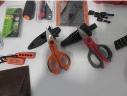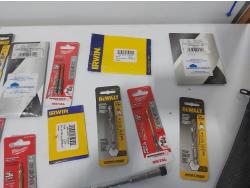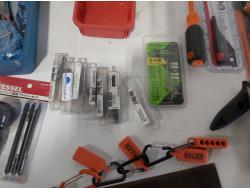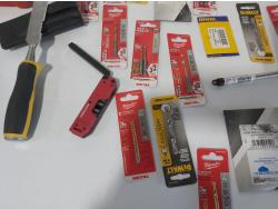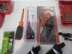 (3) industrial scissors, DeWalt mobile USB charger (usused), (2) wallets, (2) chisels, Steelman driver kit, vessel screwdriver kit (usused)
