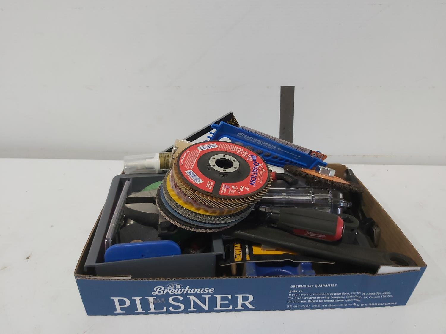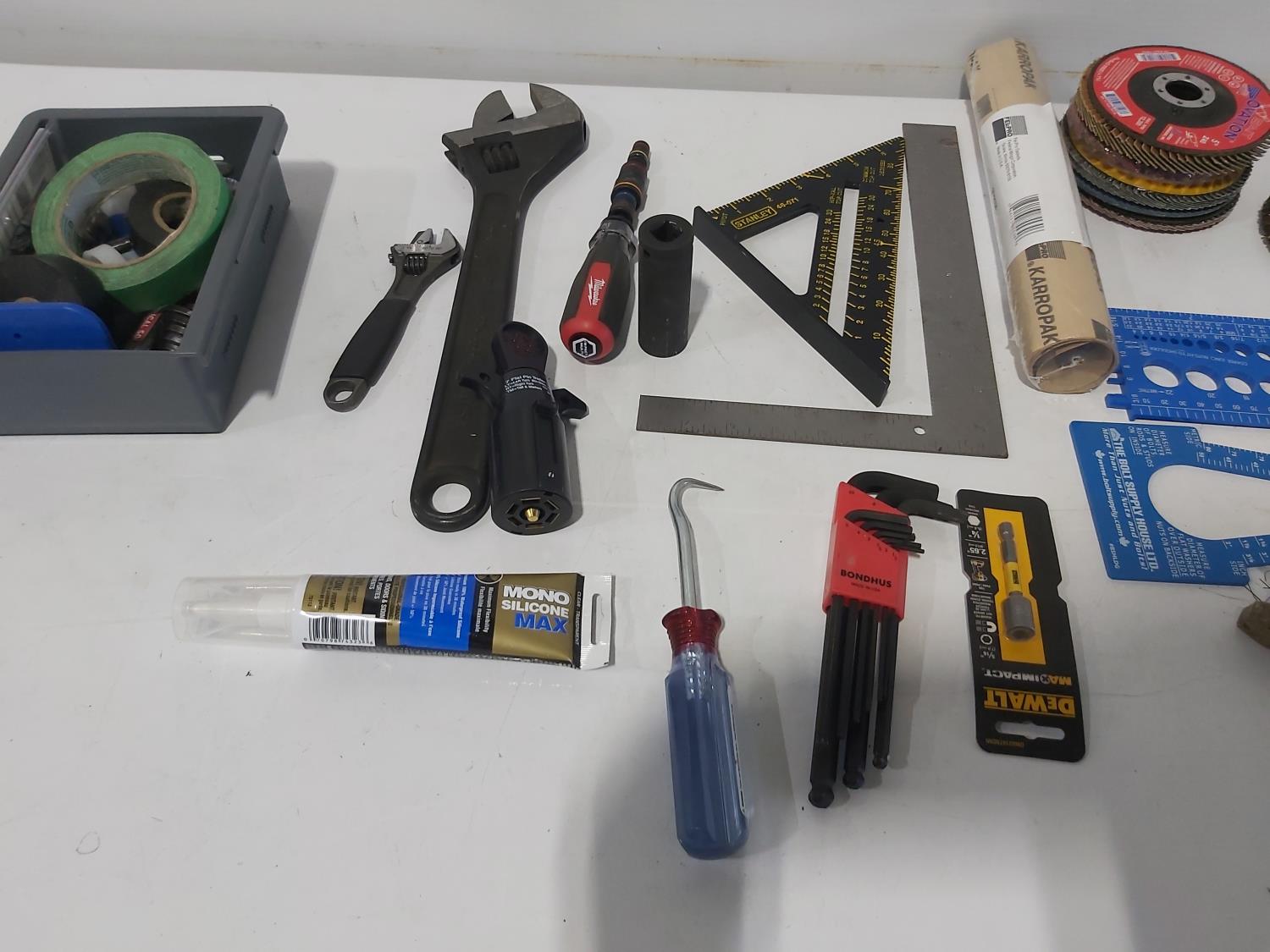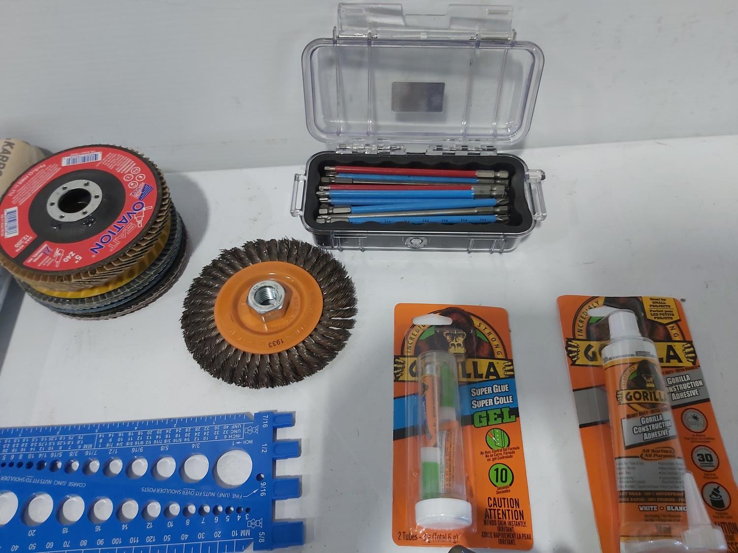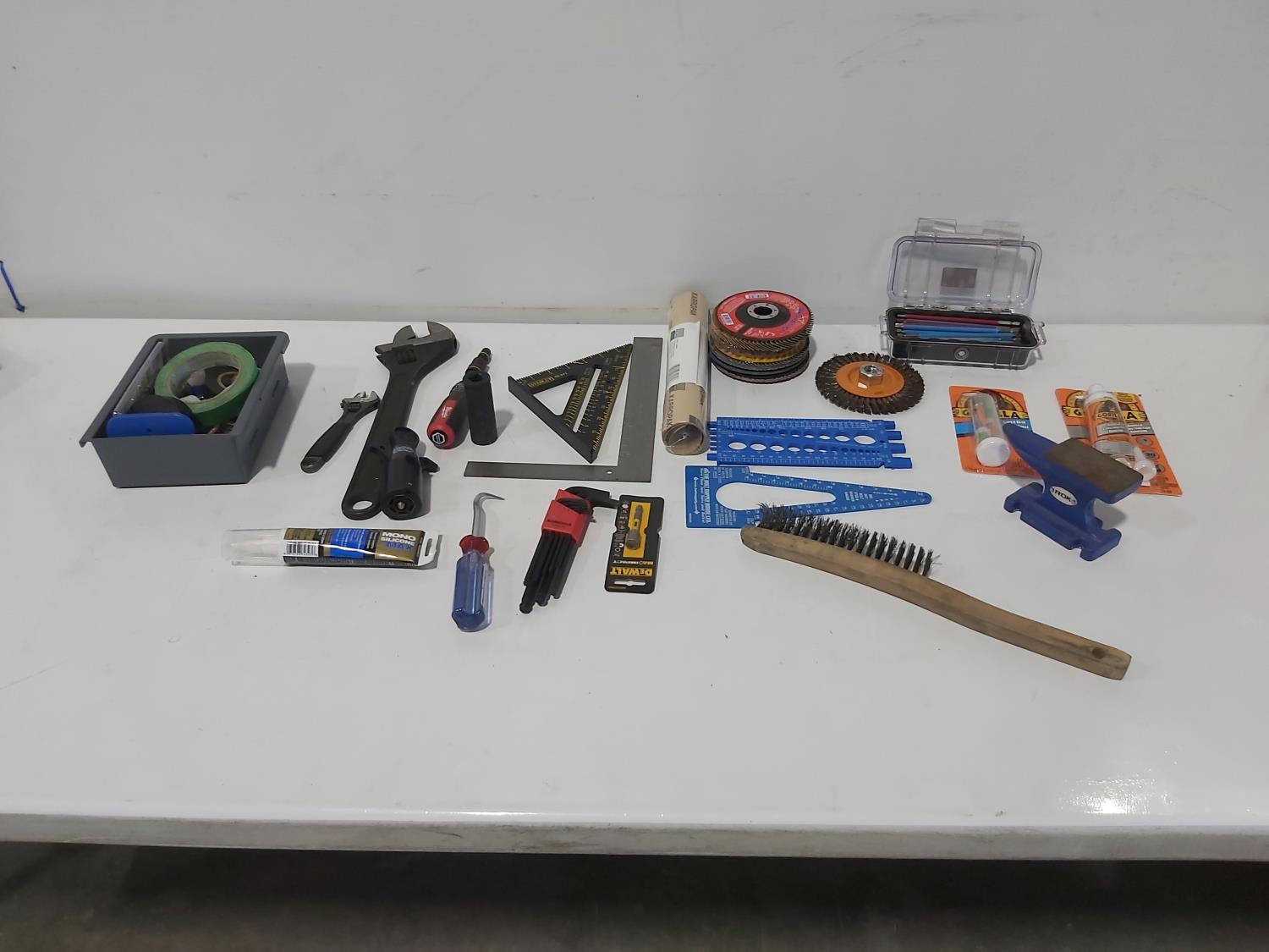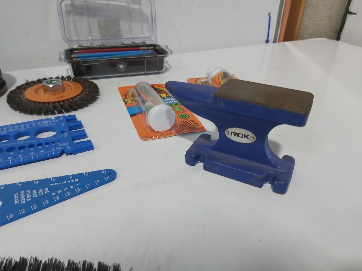mni anvil, (6) 5 inch grinding discs, Gorilla glue, wire brush, bits, adjustable wrenches