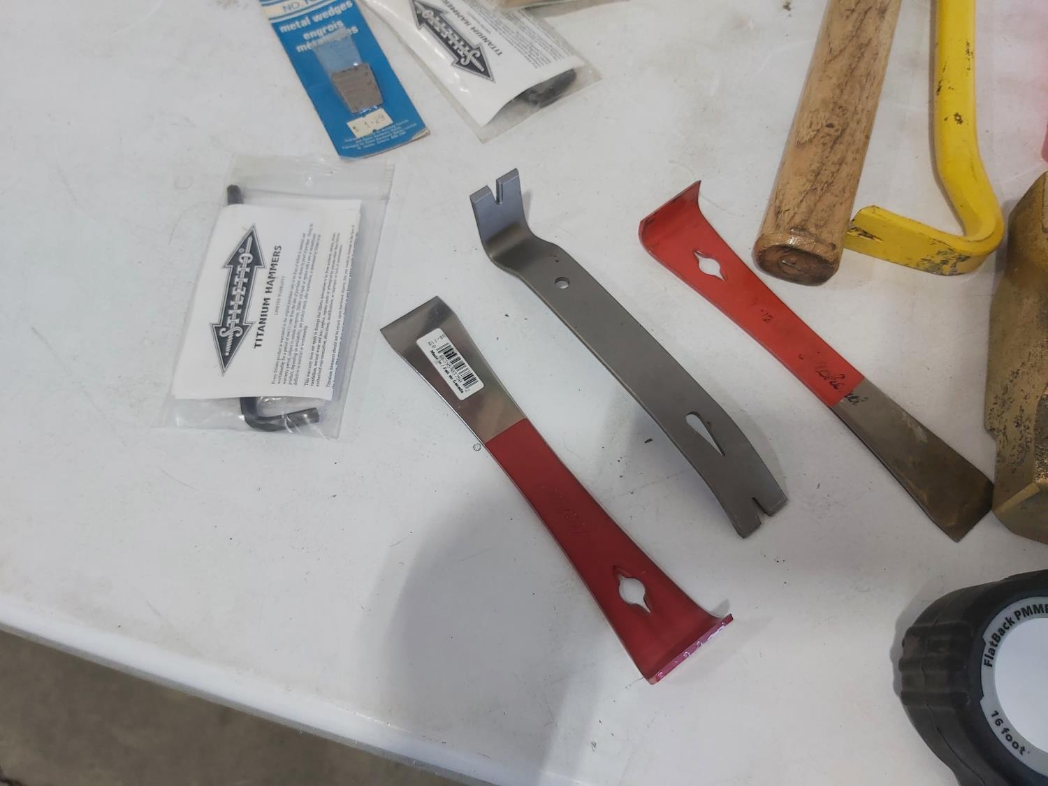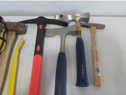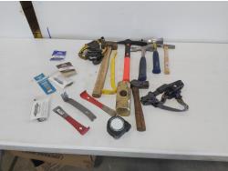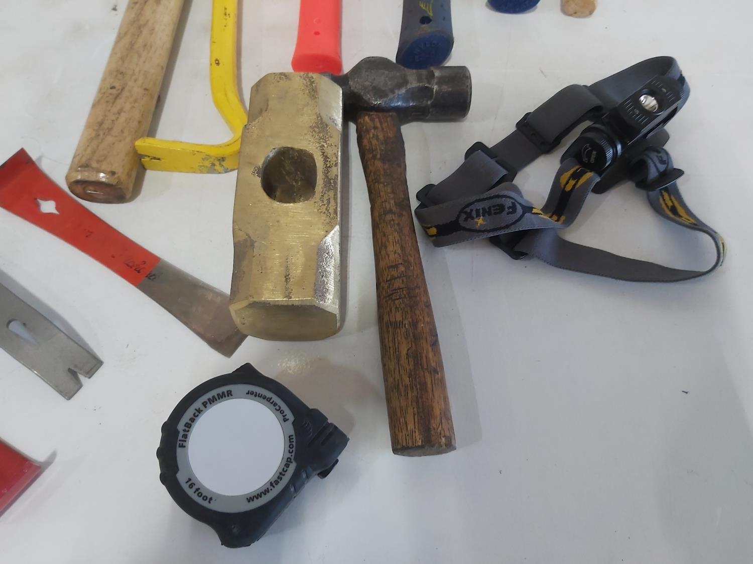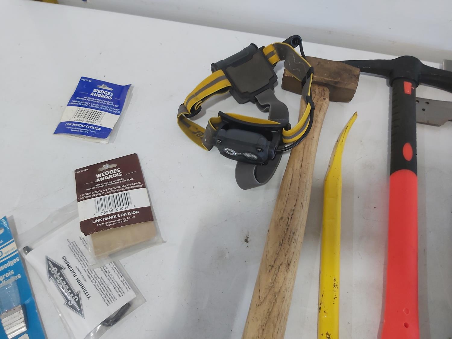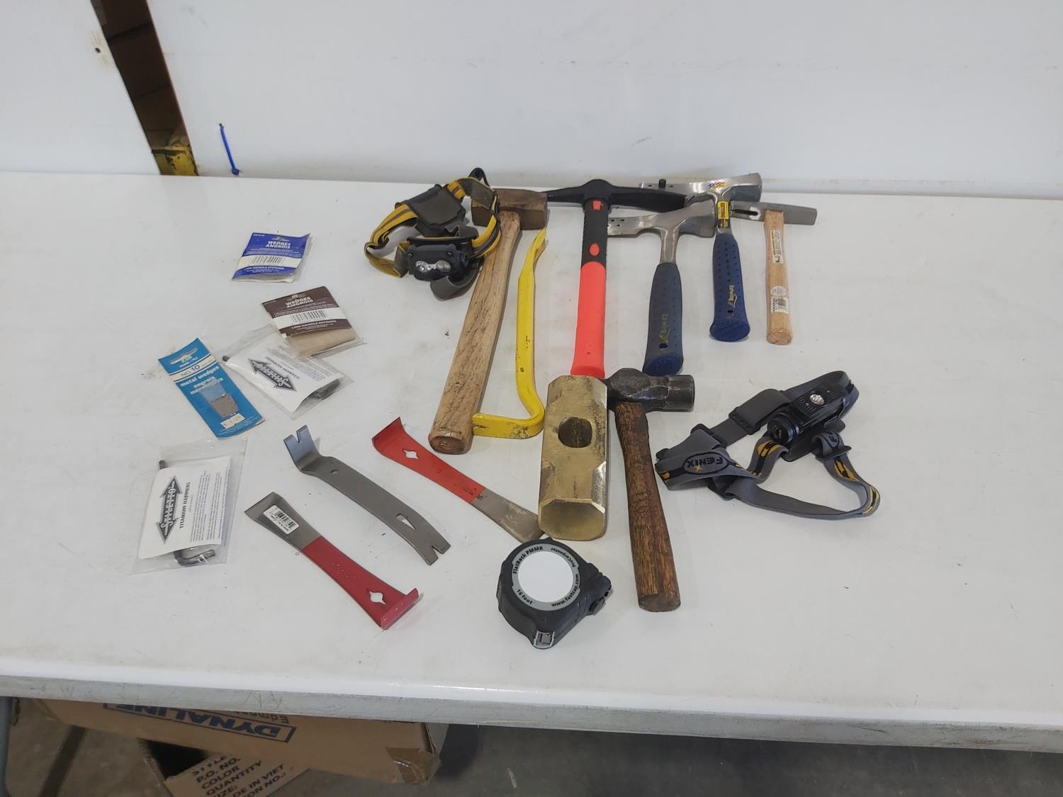 tool vest with attachments, (2) tool belts with attachments, hammers, axes, (2) headlamps, (3) lever scrapers, sledge hammer head, 16 ft measuring tape, axe head wedges, pry bar