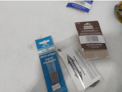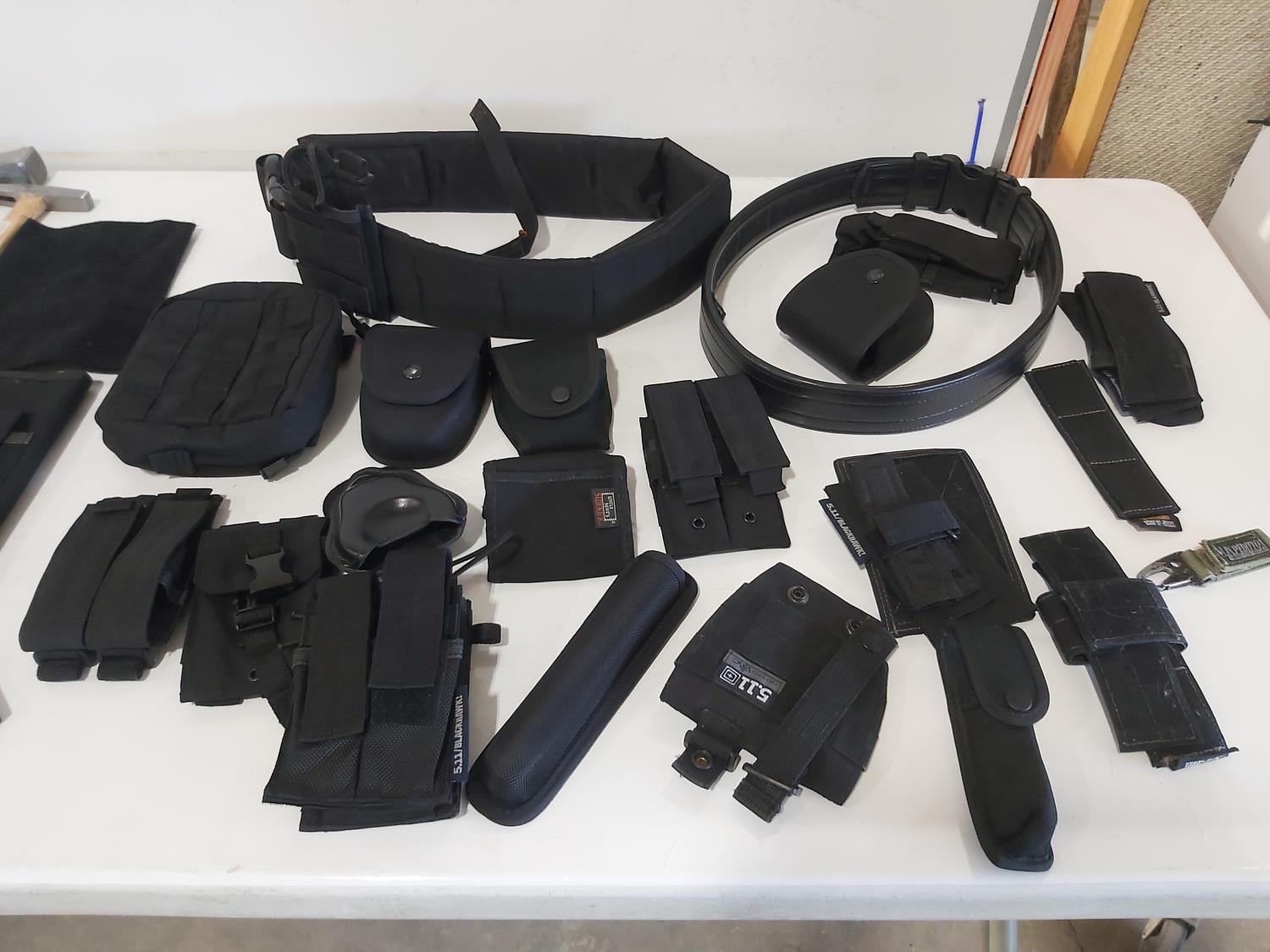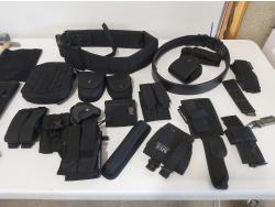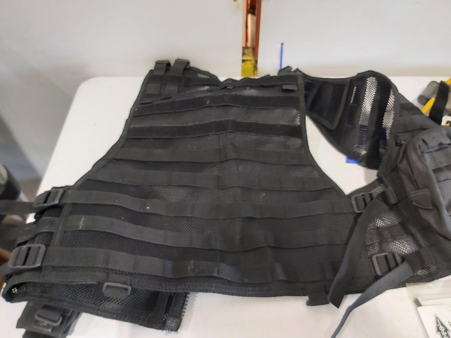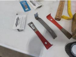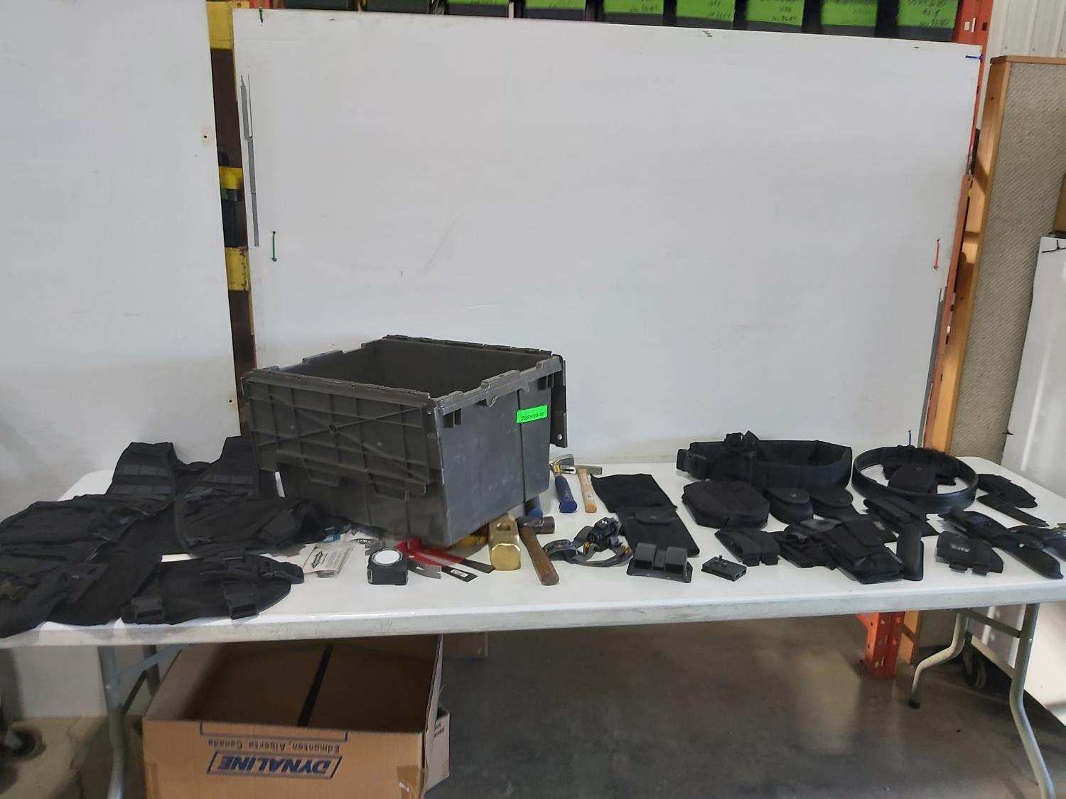 tool vest with attachments, (2) tool belts with attachments, hammers, axes, (2) headlamps, (3) lever scrapers, sledge hammer head, 16 ft measuring tape, axe head wedges, pry bar