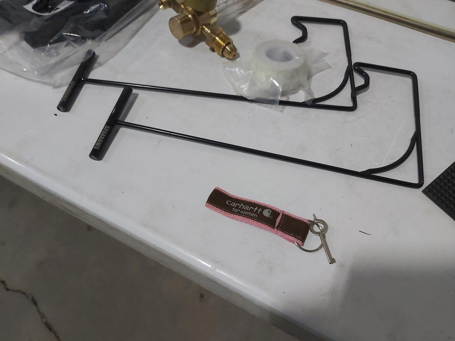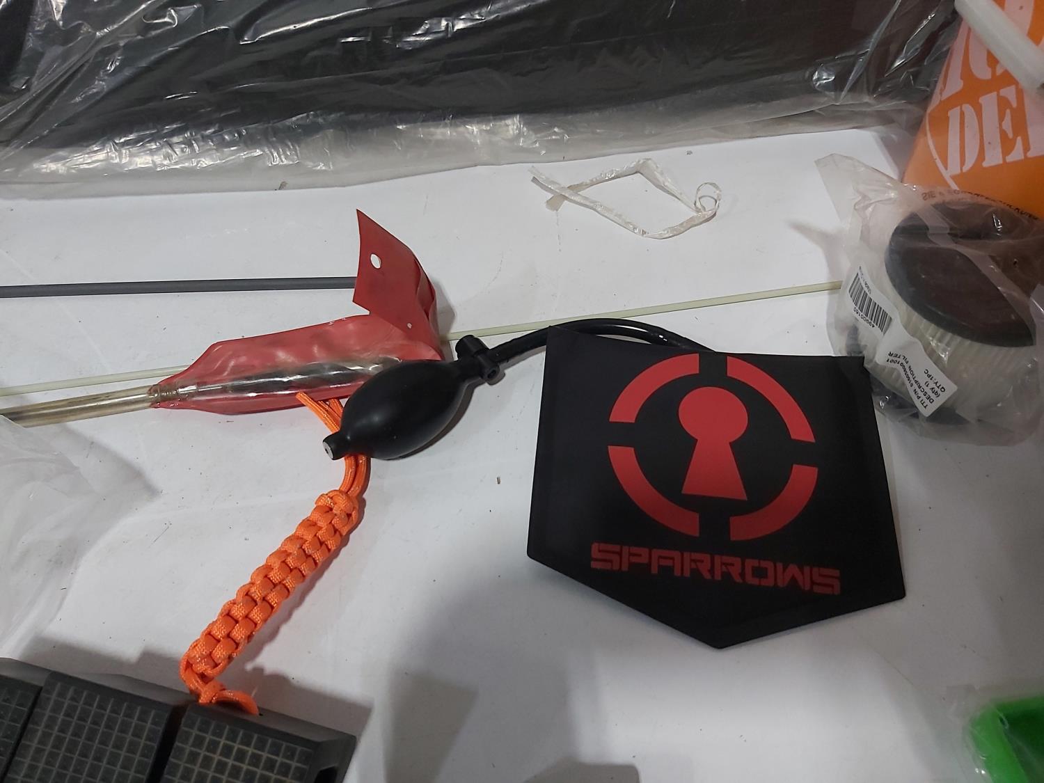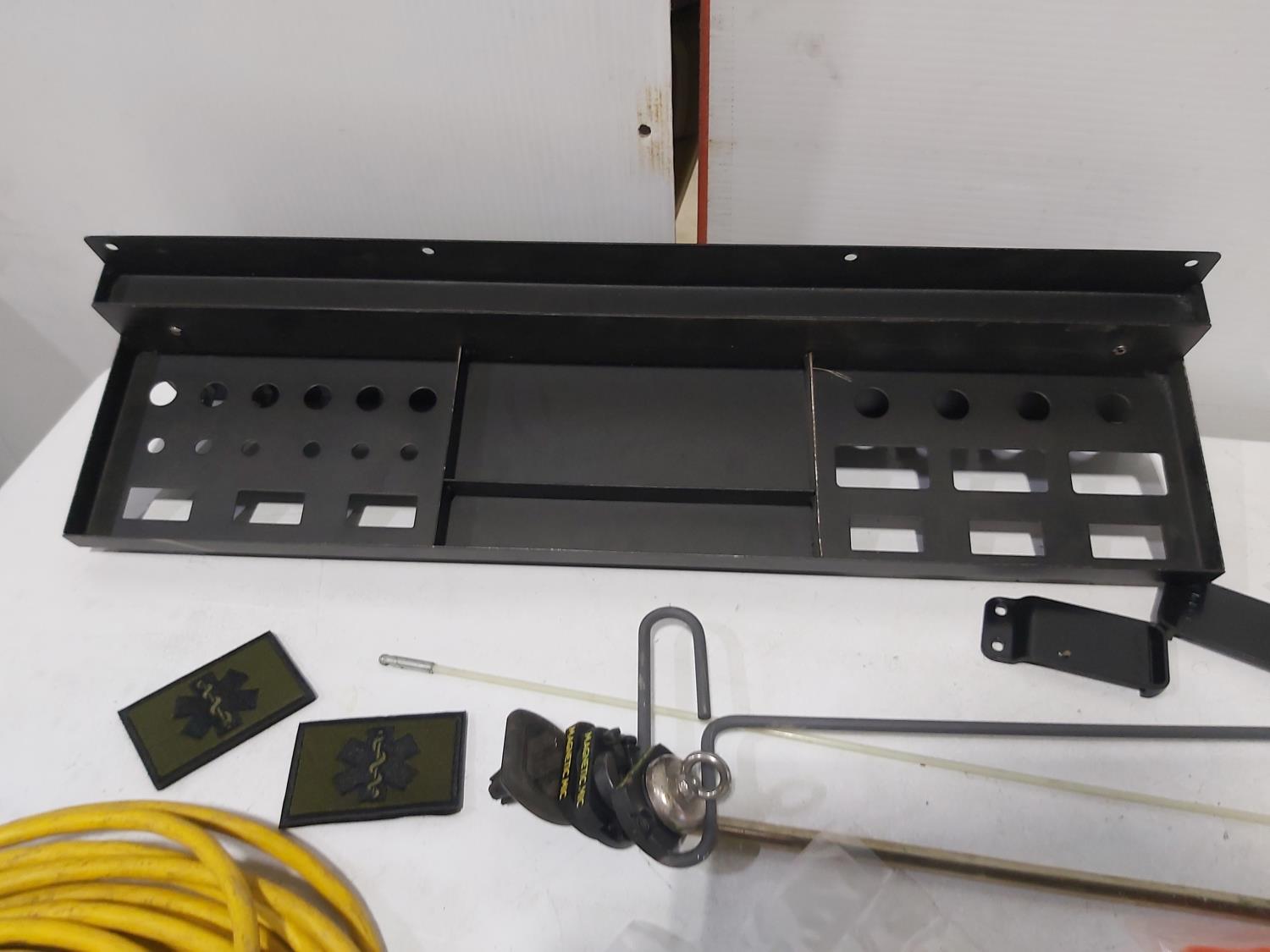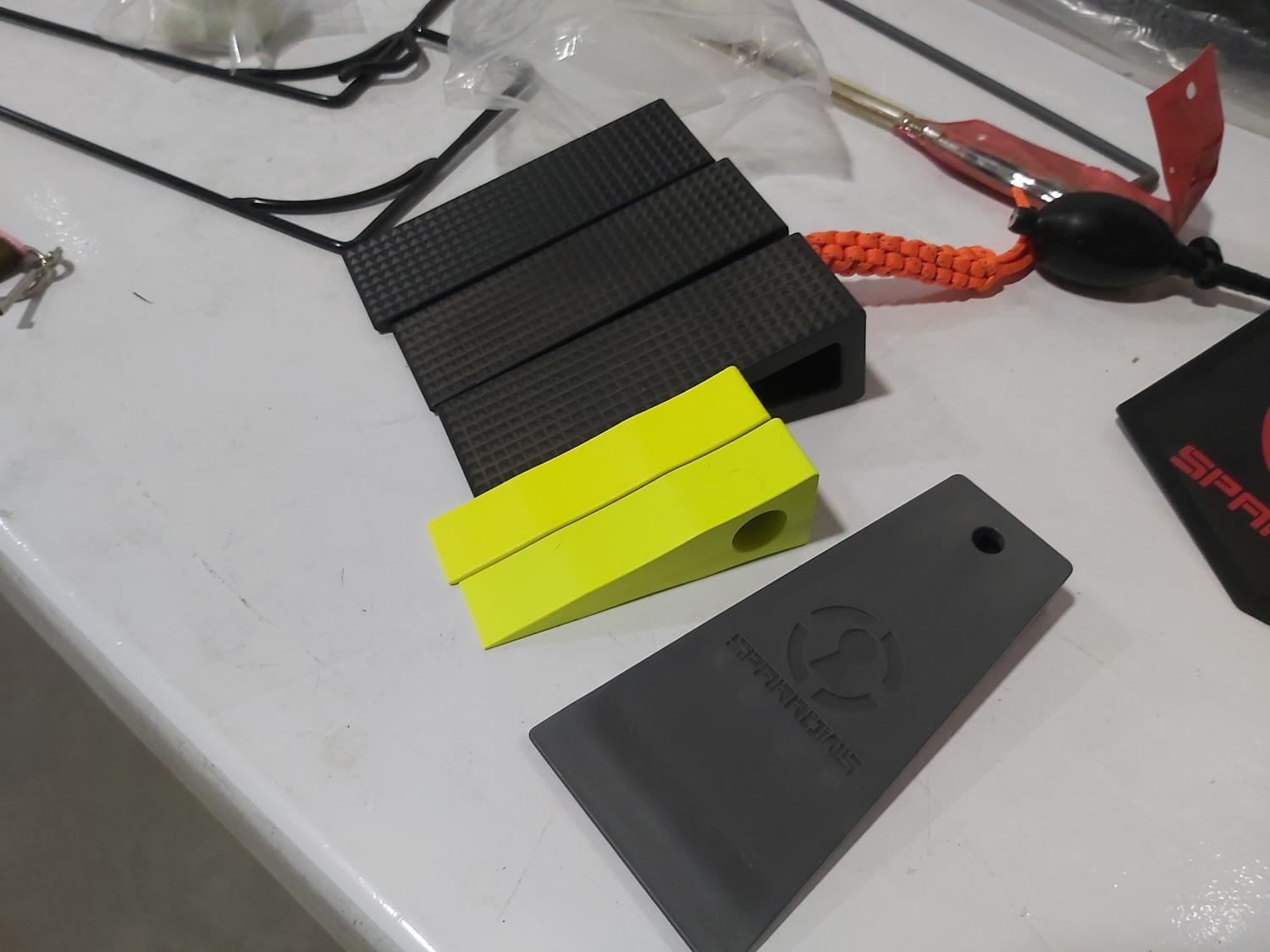 48 inch x 15 ft auto carpets, (2) air filters, (3) rubber parts trays, (6) small wedges, cable bits, 6 ft flag whip, 3500 PSI pressure gauge, pen knife, air bag jack, 2 ft metal tool storage shelf, various Precision Tools