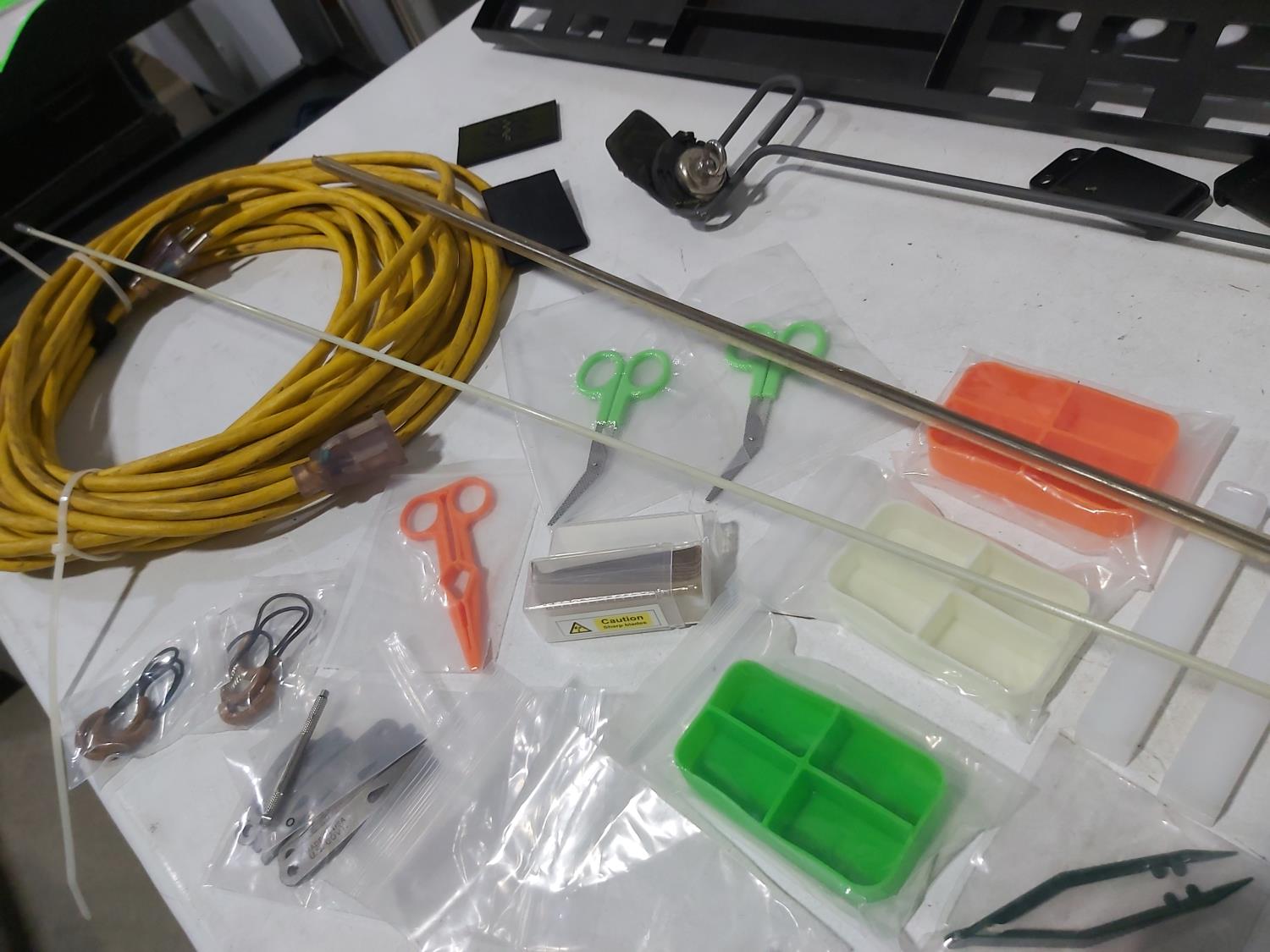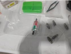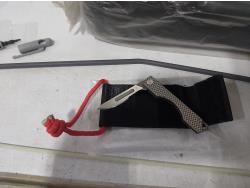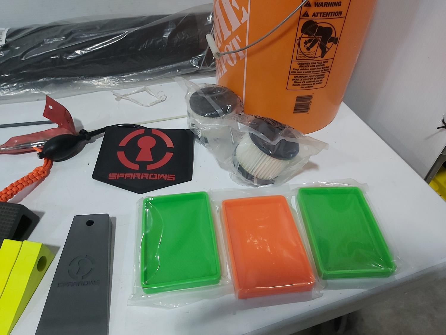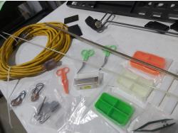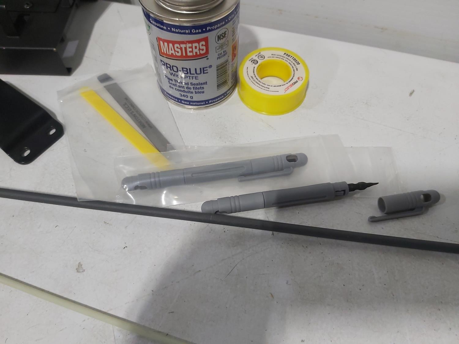 48 inch x 15 ft auto carpets, (2) air filters, (3) rubber parts trays, (6) small wedges, cable bits, 6 ft flag whip, 3500 PSI pressure gauge, pen knife, air bag jack, 2 ft metal tool storage shelf, various Precision Tools