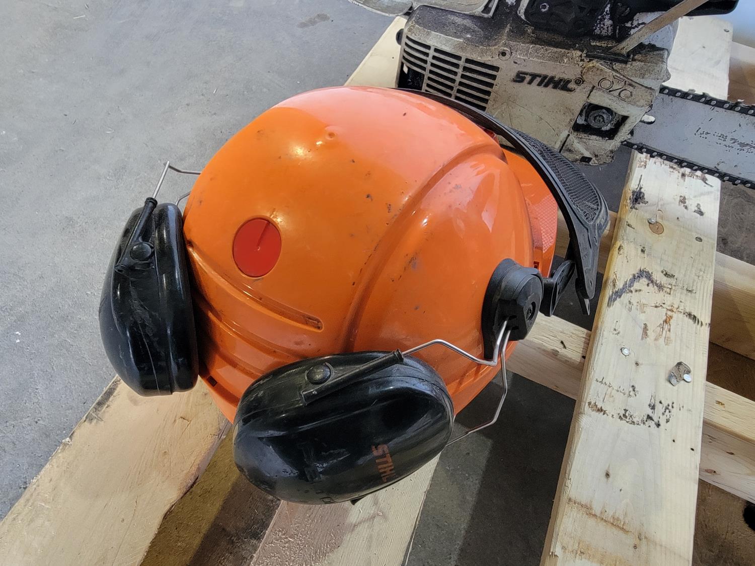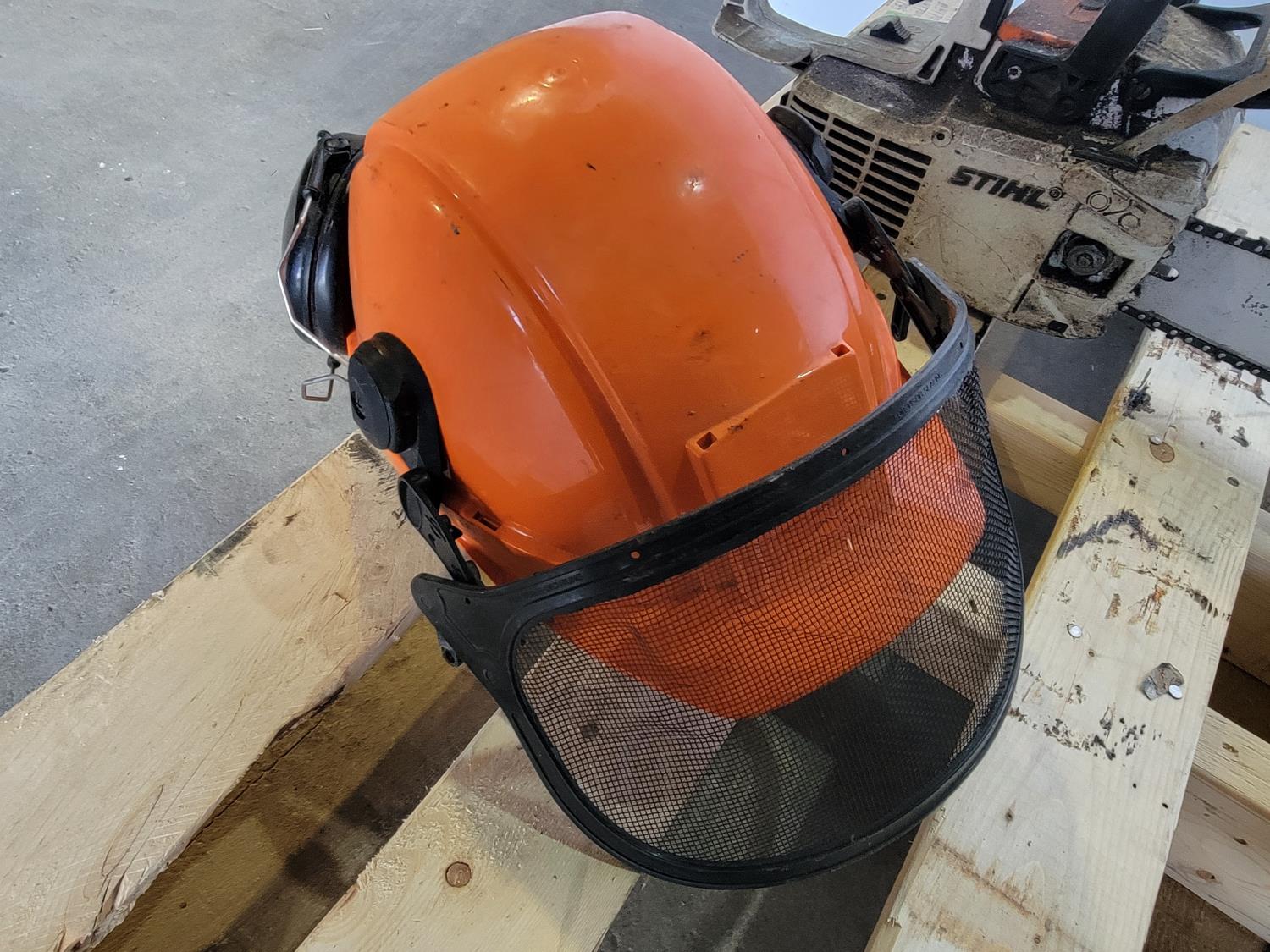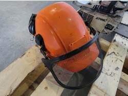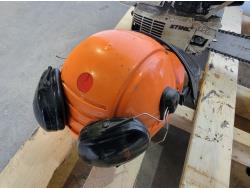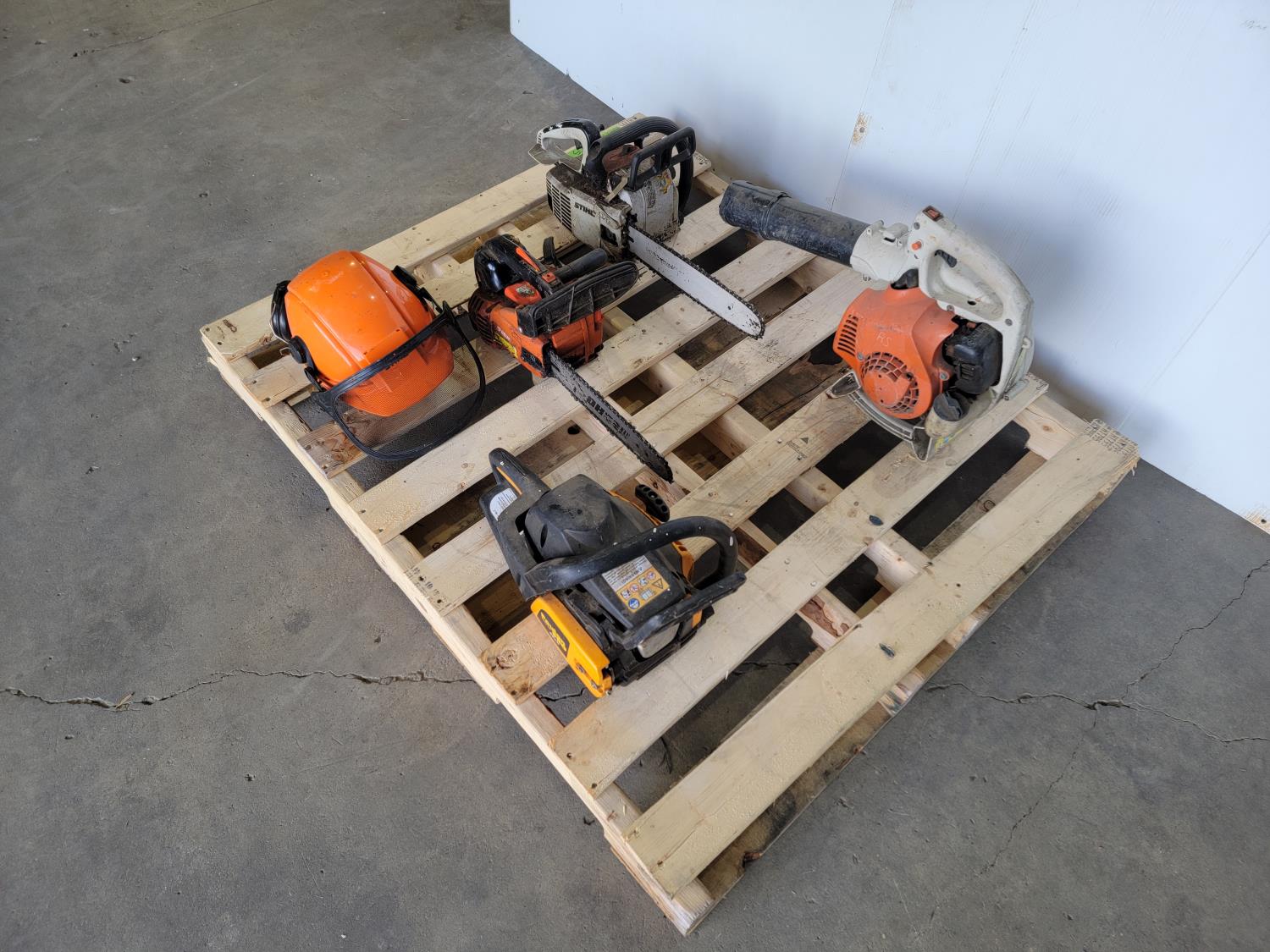 1198 Safety Helmet with Mesh Screen, Gas Blower and (3) Gas Chainsaws (Inoperable)