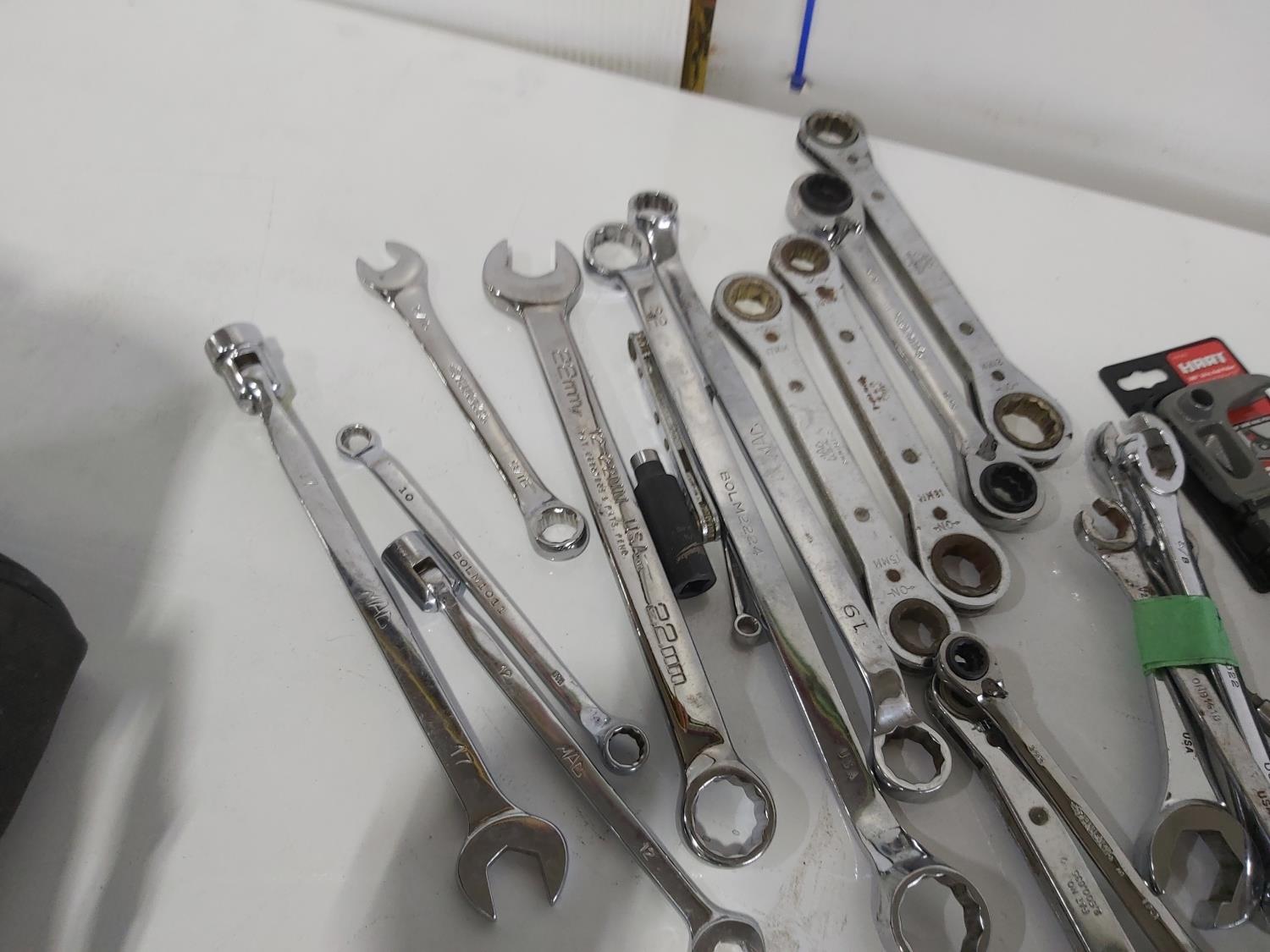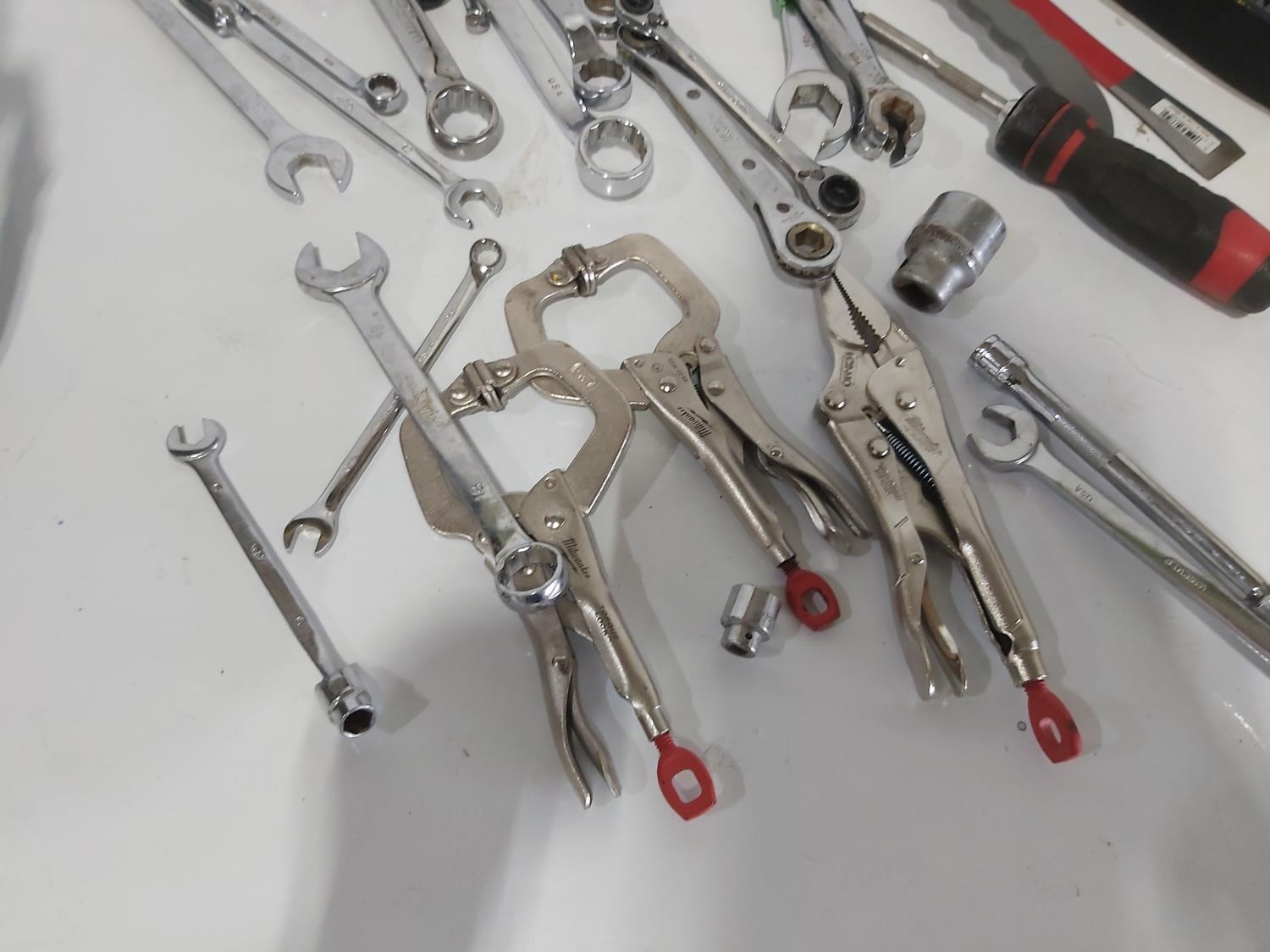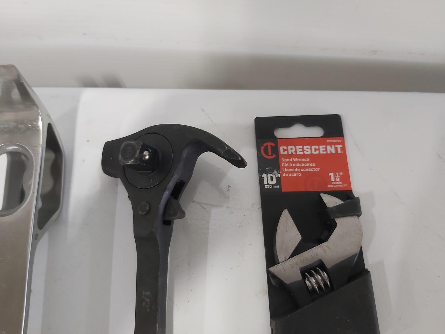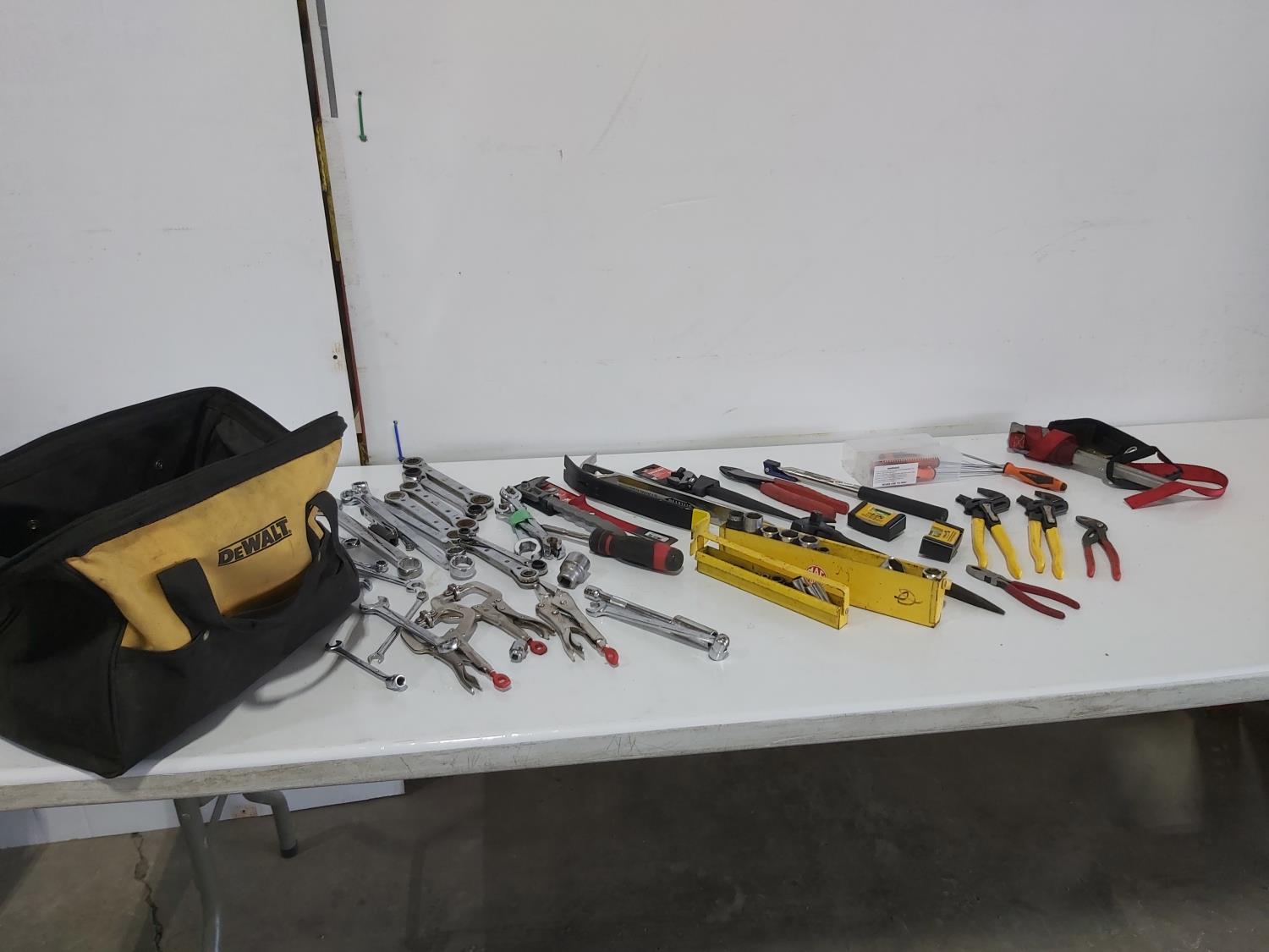 wrenches, sockets, nail pullers, (2) pocket levels, (3) adjustable pliers