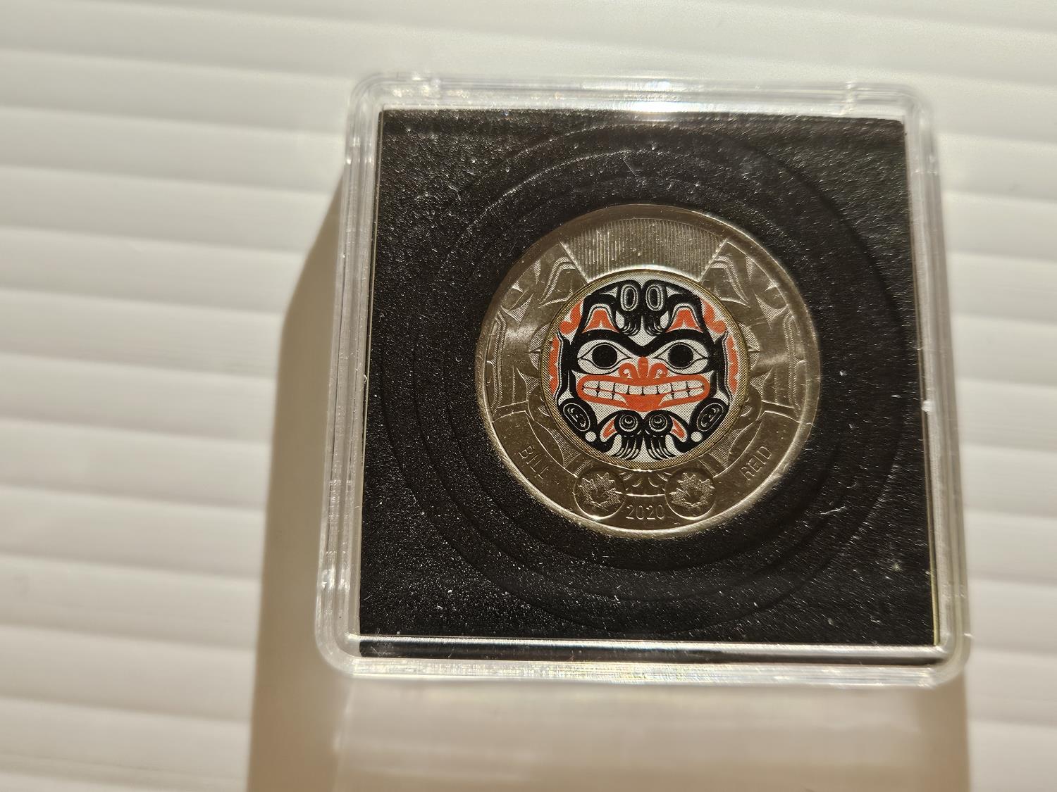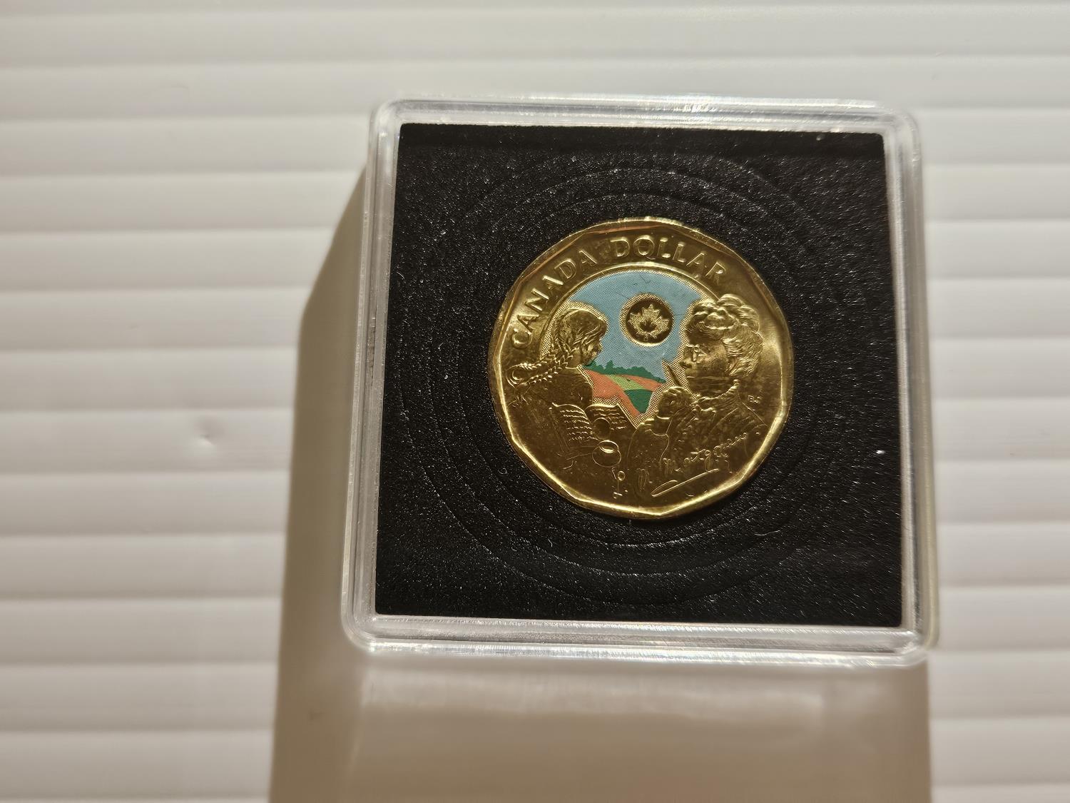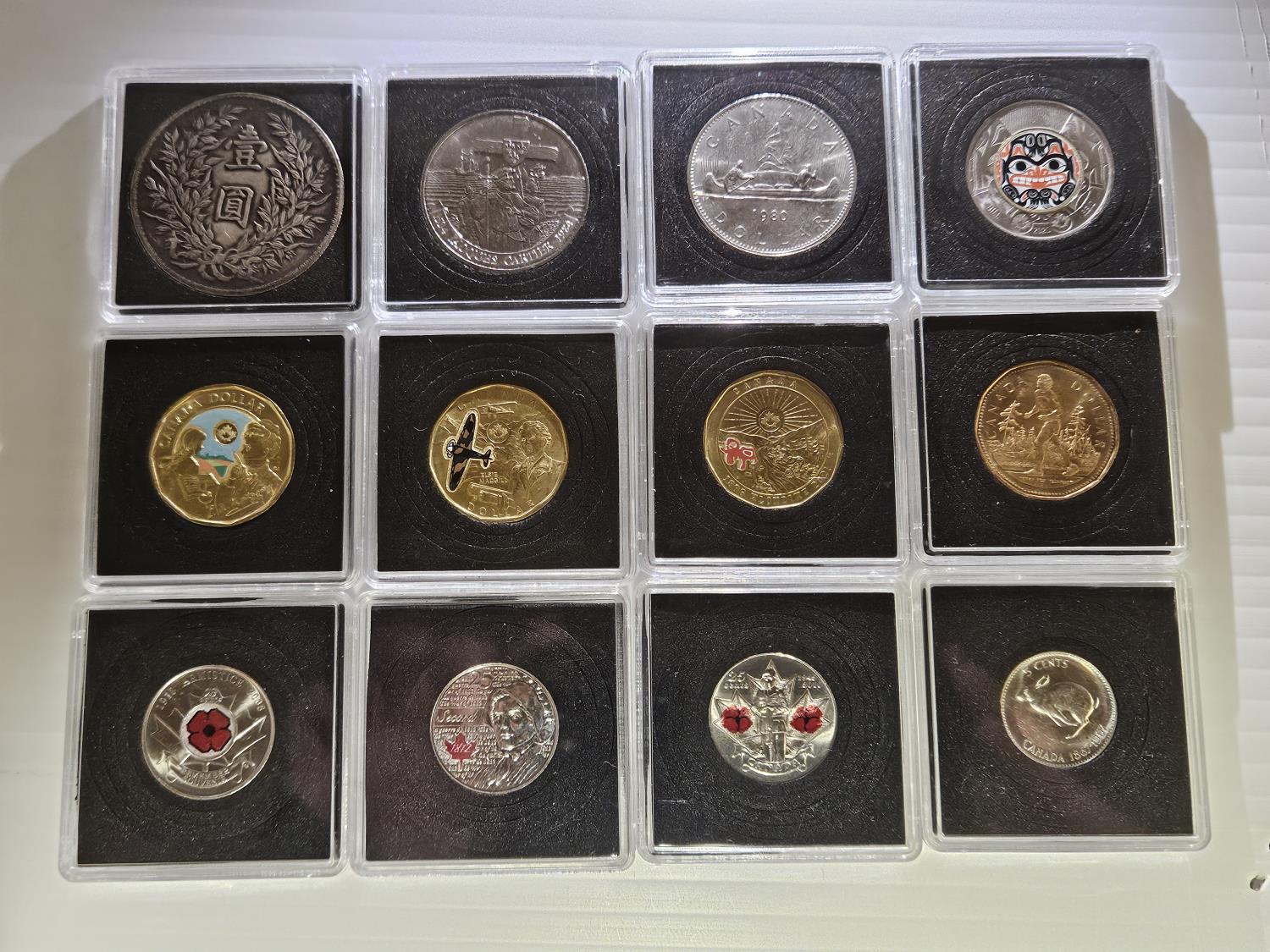includes (1) large Chinese coin, (6) $1 Canadian coins, (1) $2 Canadian coin, (3) Canadian $0.25 coins, (1) $0.05 Canadian coin