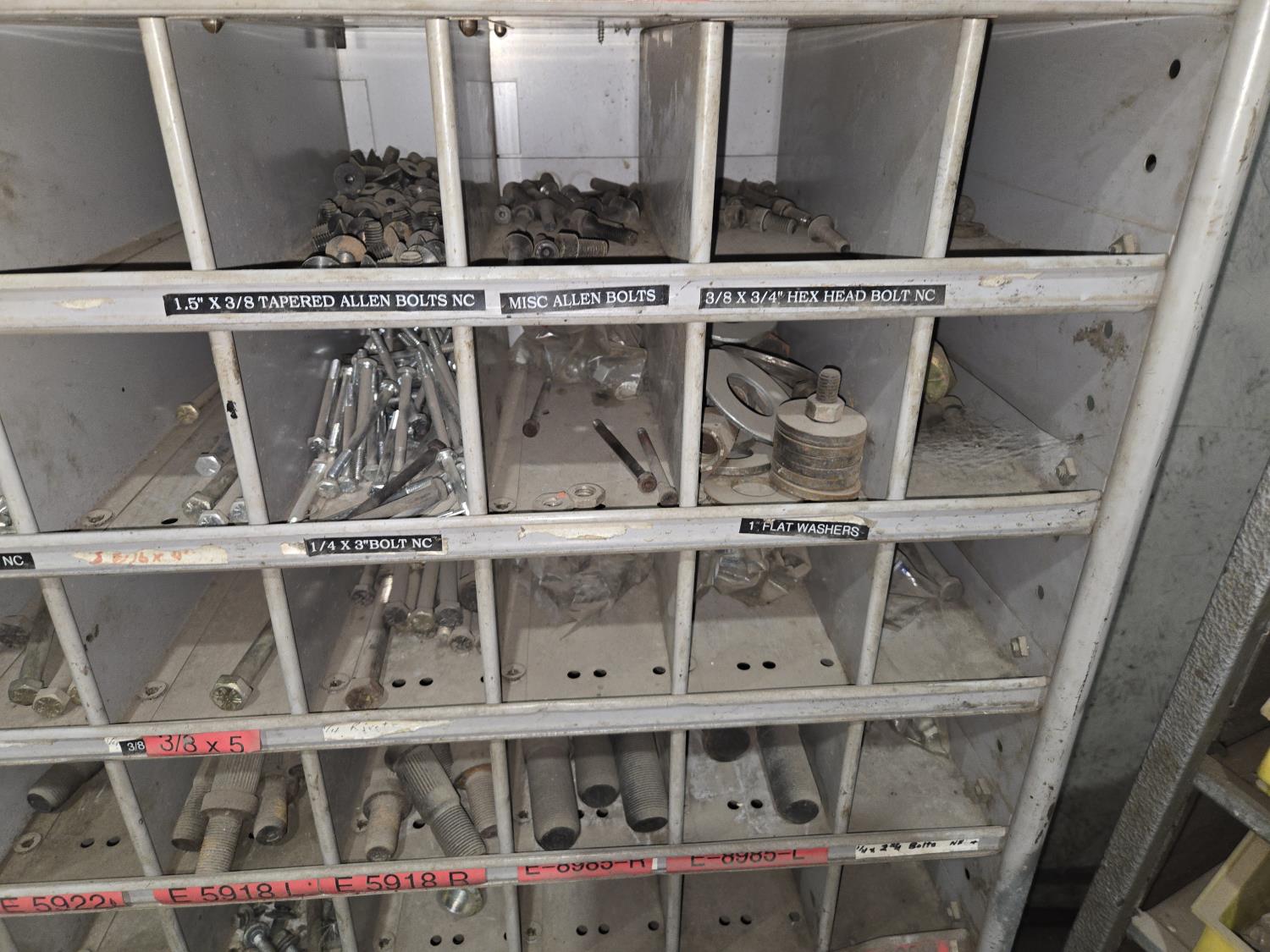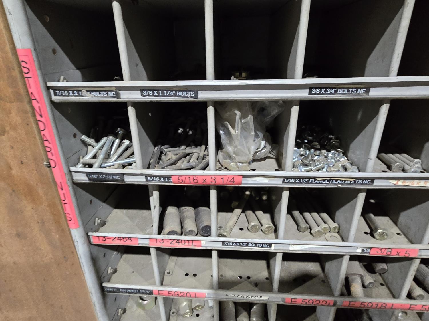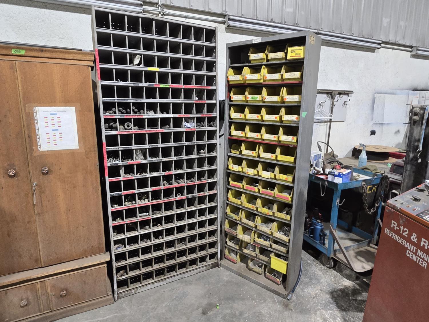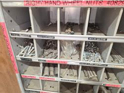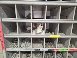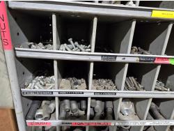 includes heavy truck wheel studs, wheel nuts, miscellaneous bolts, nuts and washers, pop rivets, lag screws, wire clamps, crimp-on hydraulic hose fittings, bin measurements 12 inch deep X 32 inch wide X 84 inch high, 10 inch deep X 26 inch wide X 79 inch high