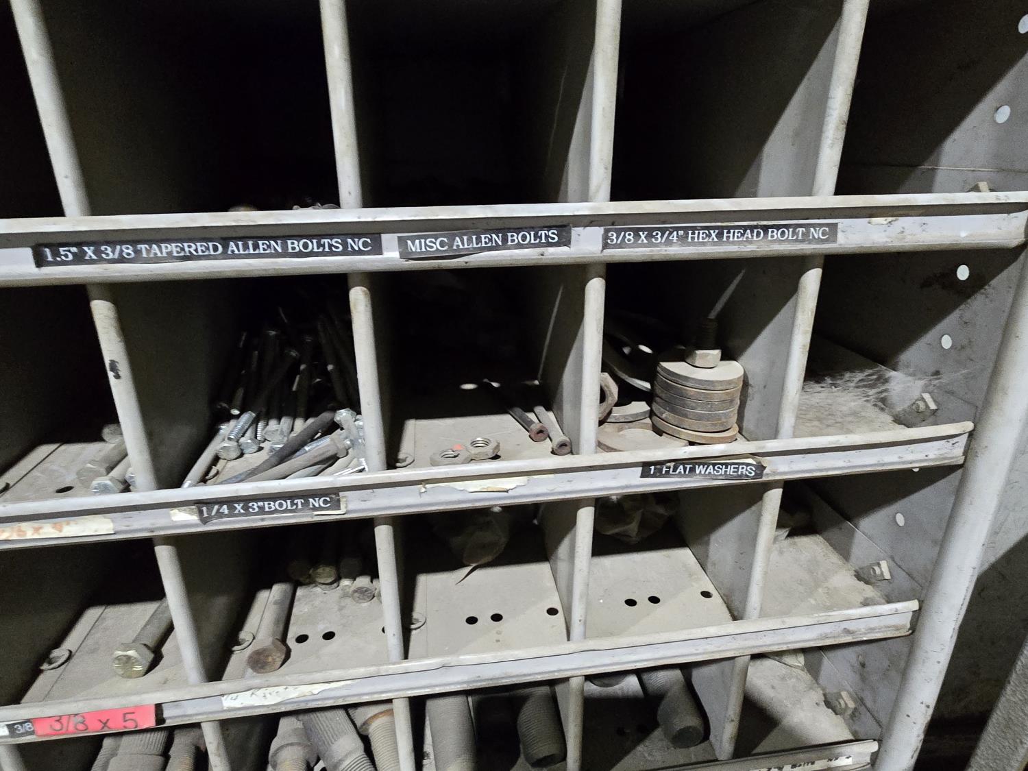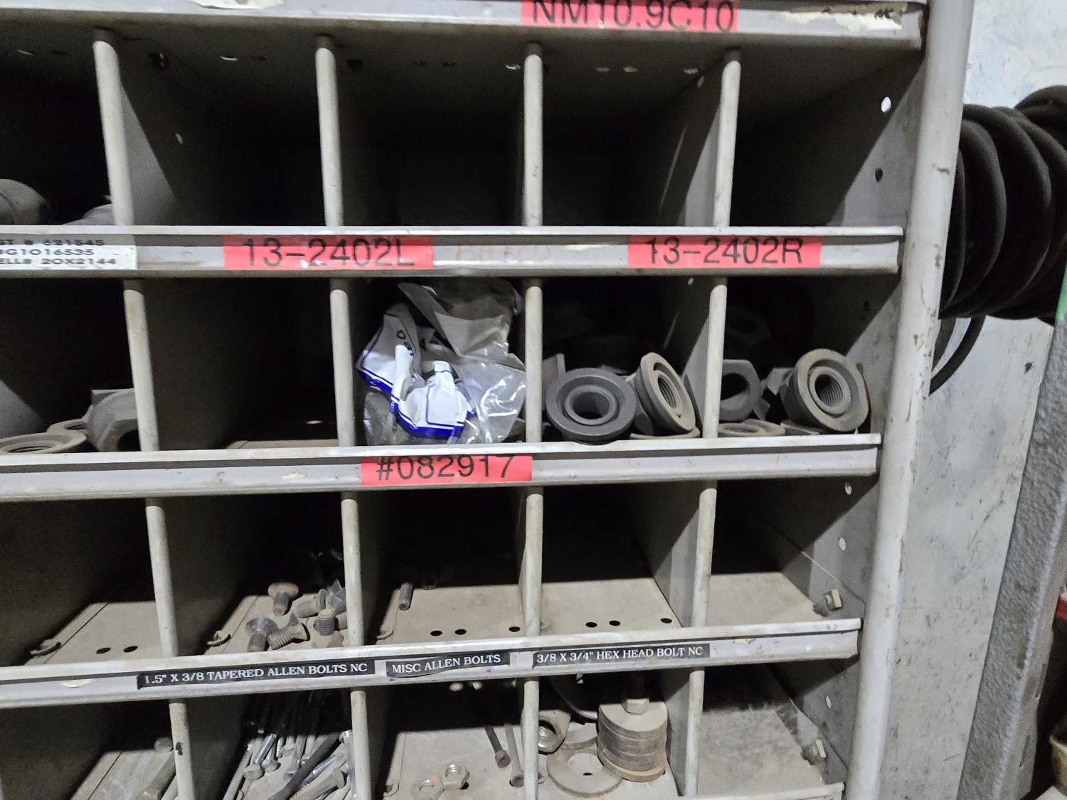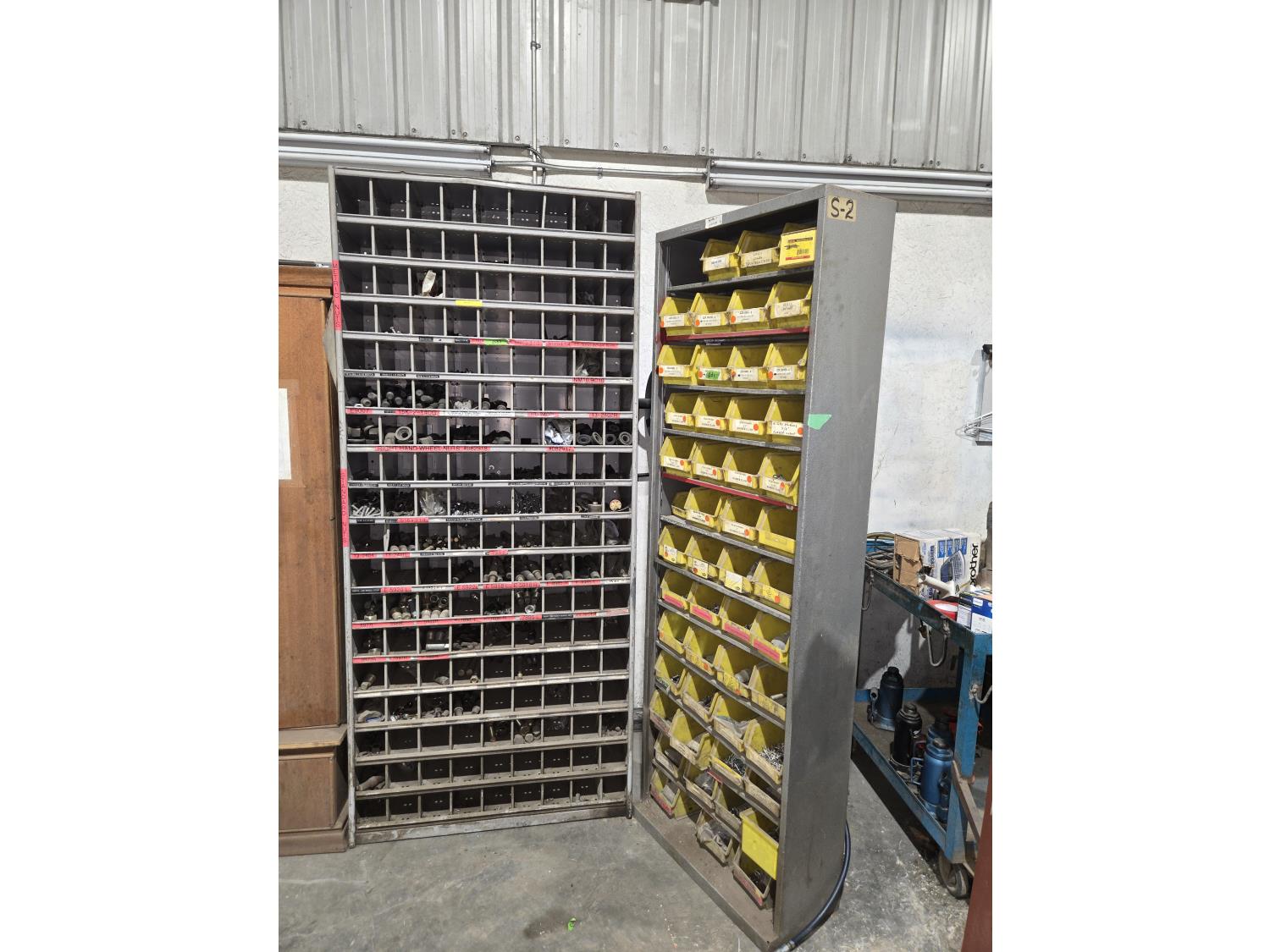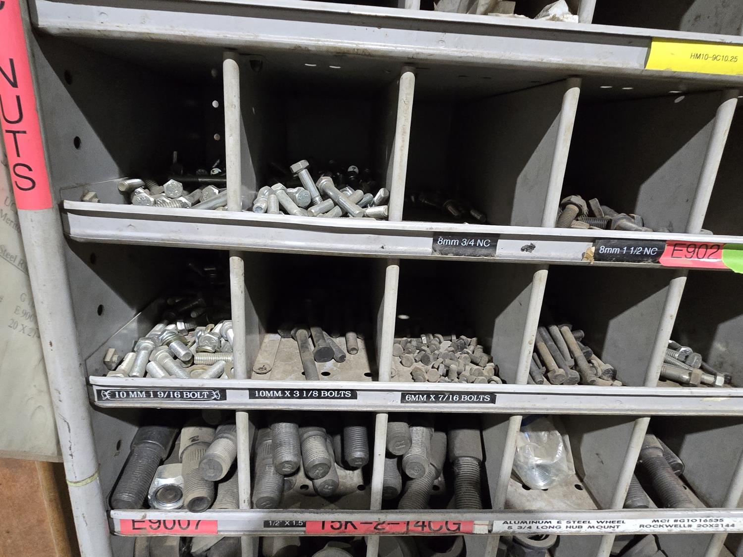 includes heavy truck wheel studs, wheel nuts, miscellaneous bolts, nuts and washers, pop rivets, lag screws, wire clamps, crimp-on hydraulic hose fittings, bin measurements 12 inch deep X 32 inch wide X 84 inch high, 10 inch deep X 26 inch wide X 79 inch high