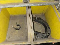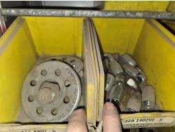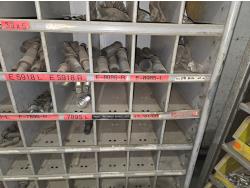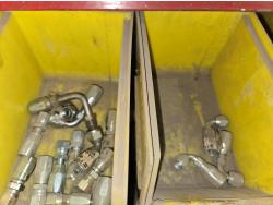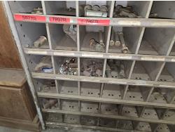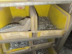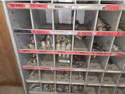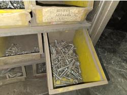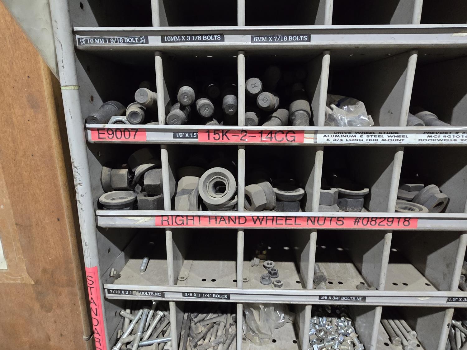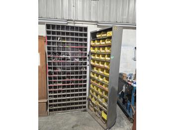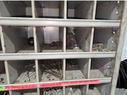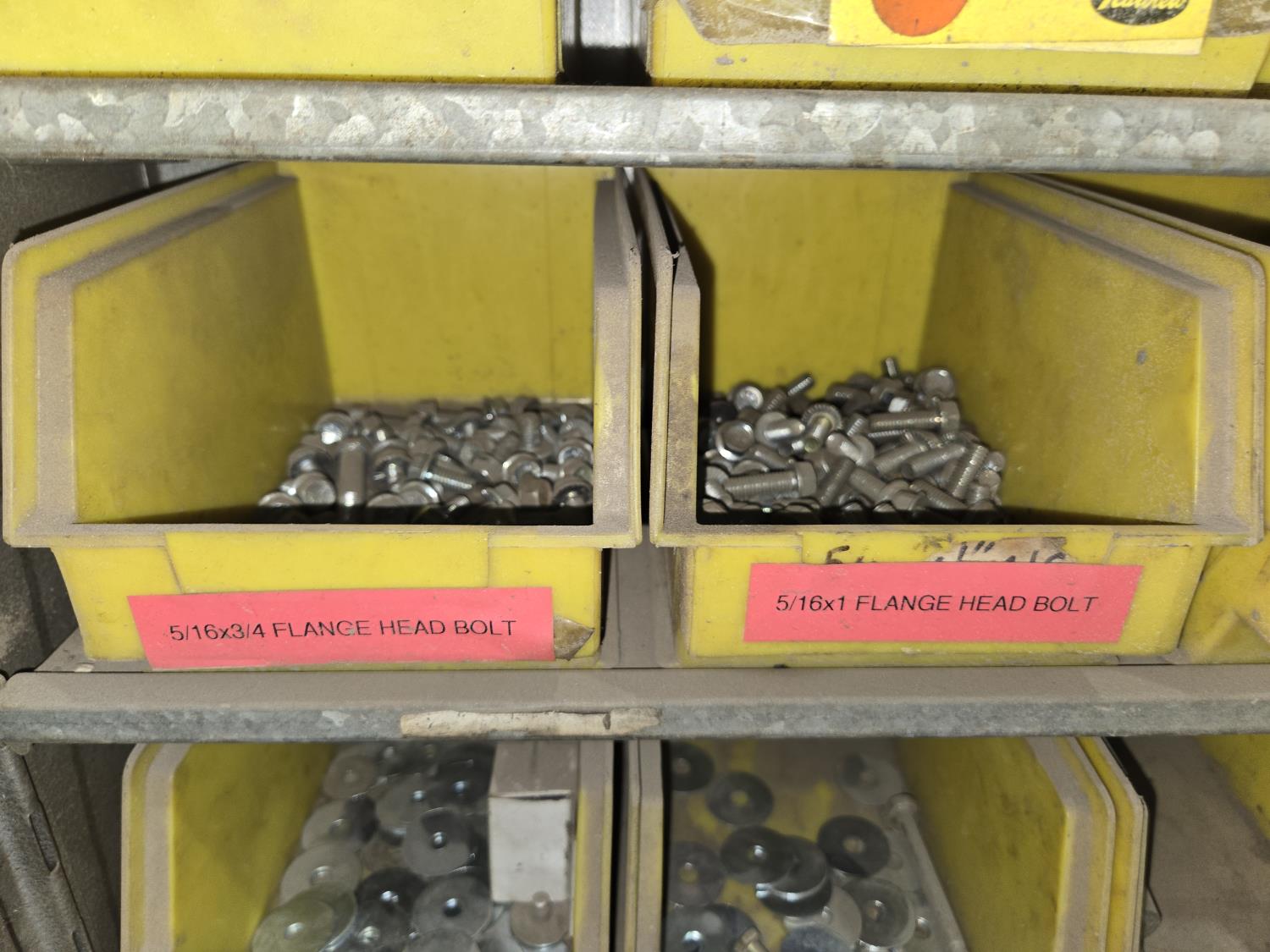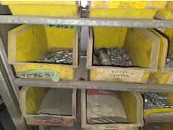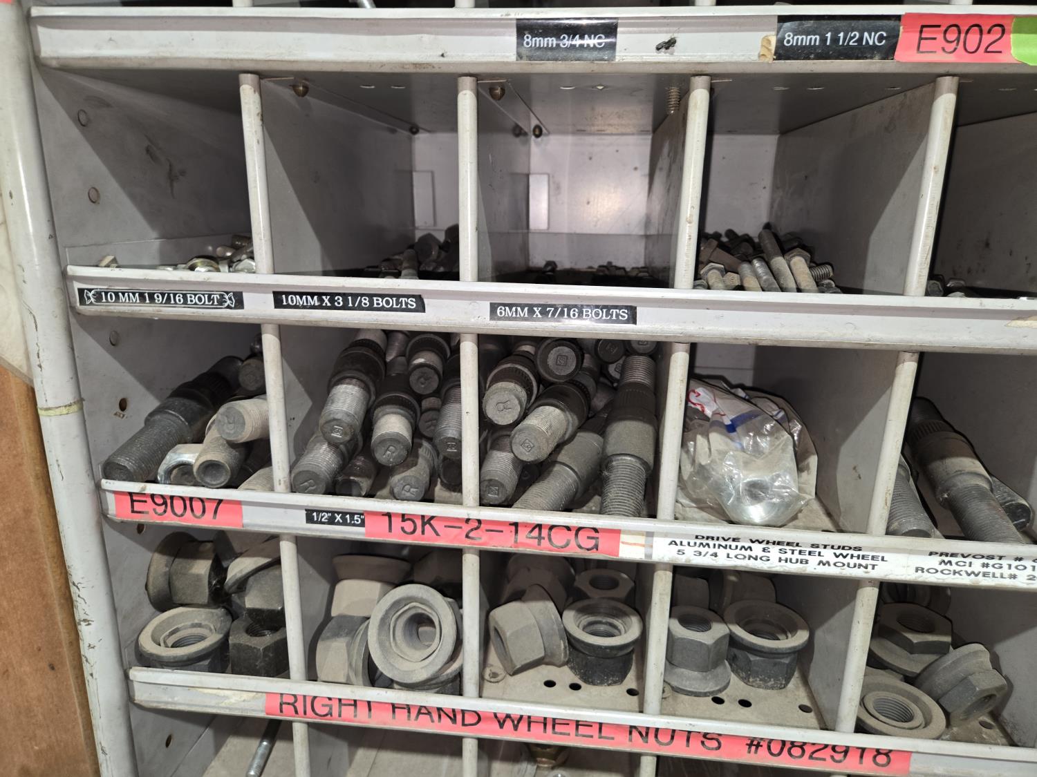 includes heavy truck wheel studs, wheel nuts, miscellaneous bolts, nuts and washers, pop rivets, lag screws, wire clamps, crimp-on hydraulic hose fittings, bin measurements 12 inch deep X 32 inch wide X 84 inch high, 10 inch deep X 26 inch wide X 79 inch high