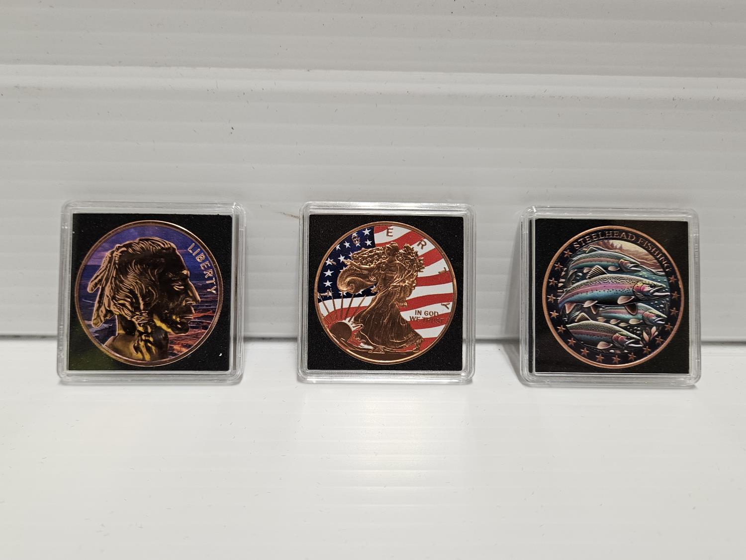 includes (1) USA buffalo coin, (1) USA liberty coin, (1) Canada steelhead coin
