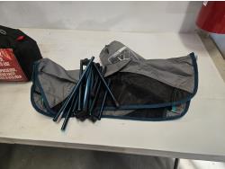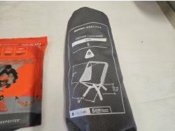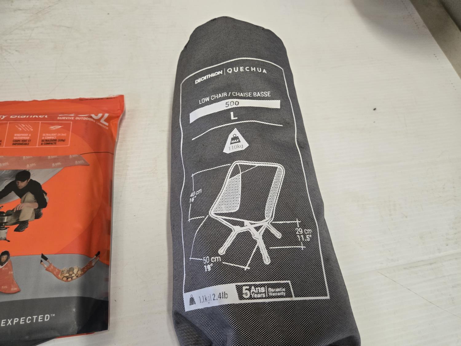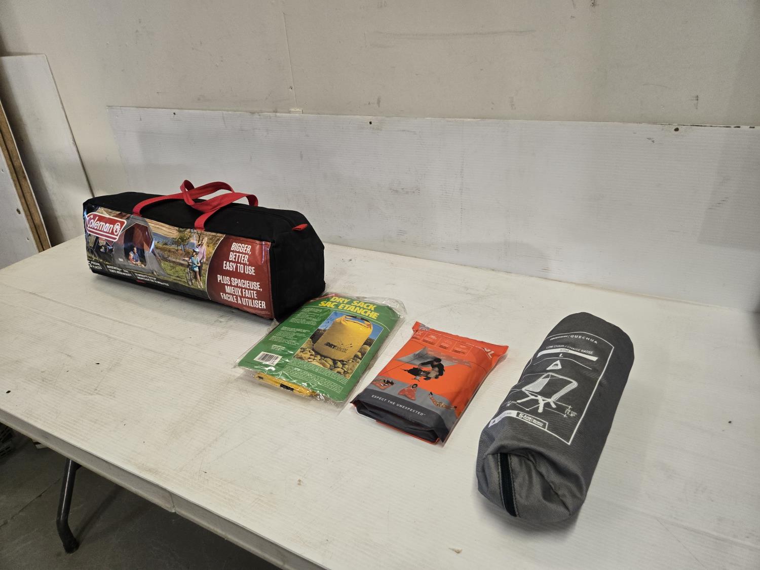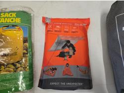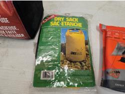 (1) dry sack, (1) low collapsible camping chair, sport utility blanket