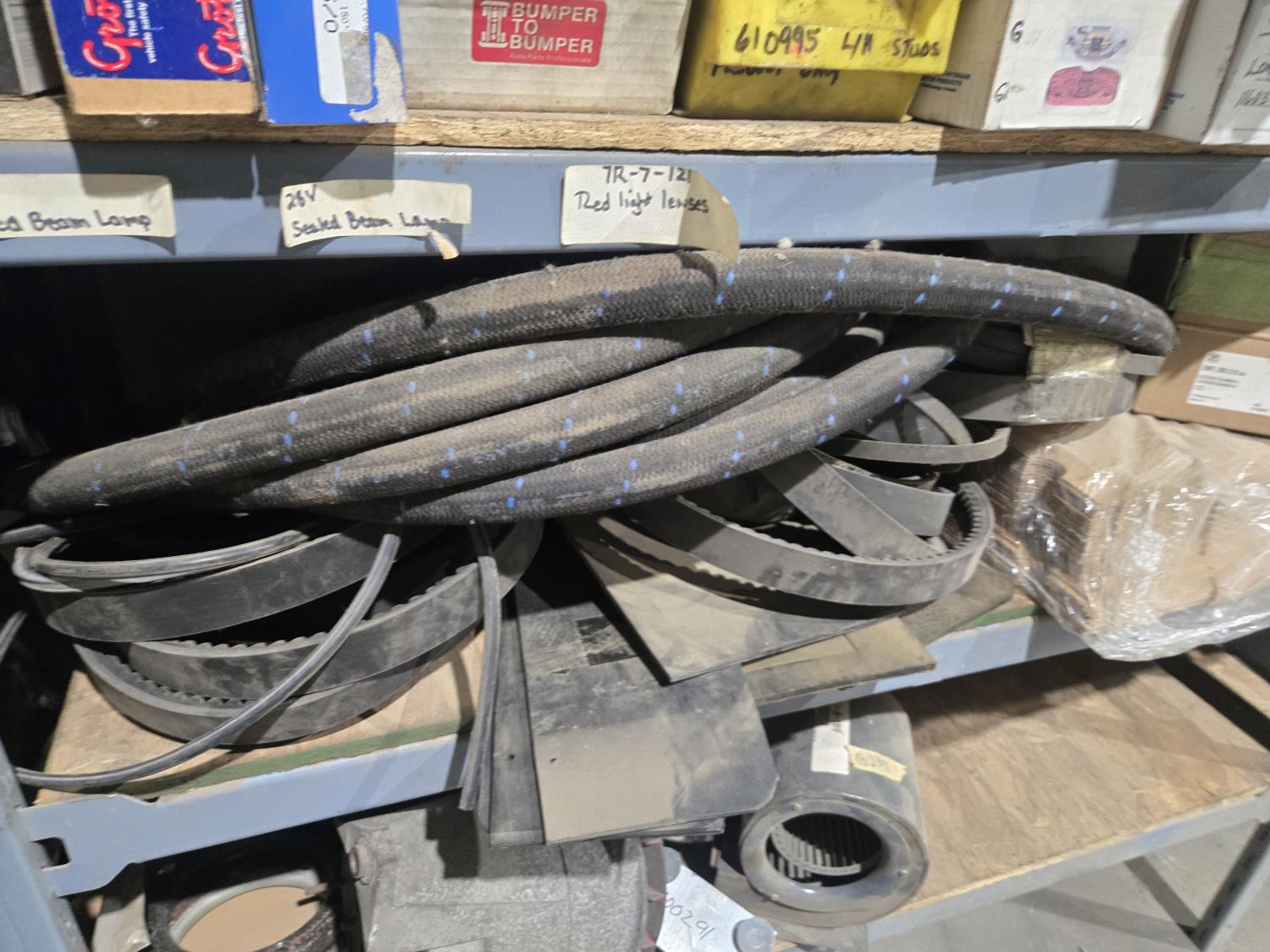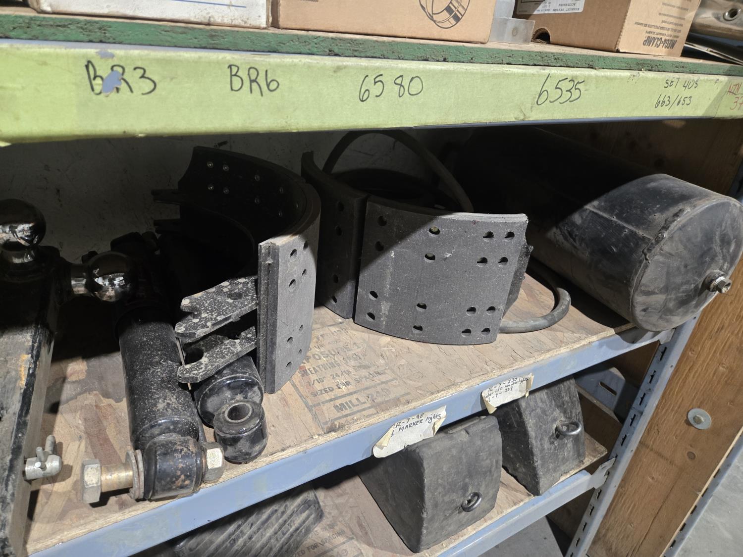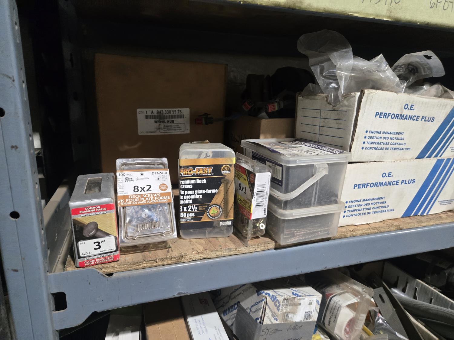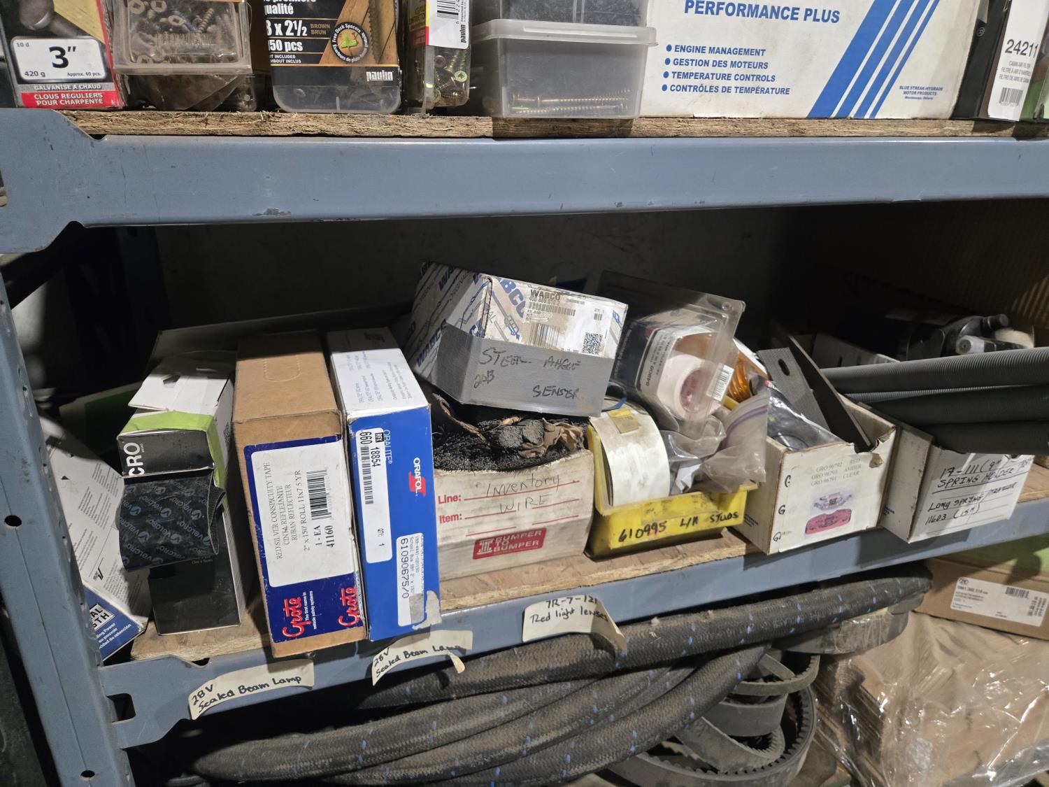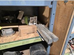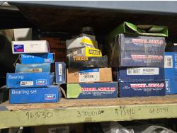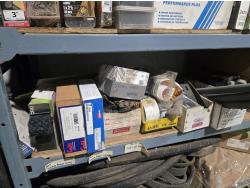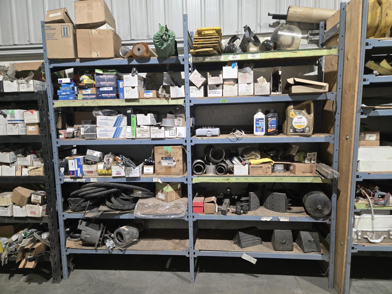 qty of unused & used heavy truck and bus parts, wheels seals, bearing kits, wheel chocks, shock absorbers, alternator, belts, miscellaneous hardware and small parts, shelf unit measures 18 inch deep X 96 inch wide X 96 inch high, shelf can easily be disassembled