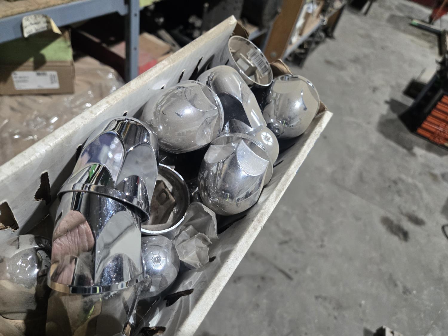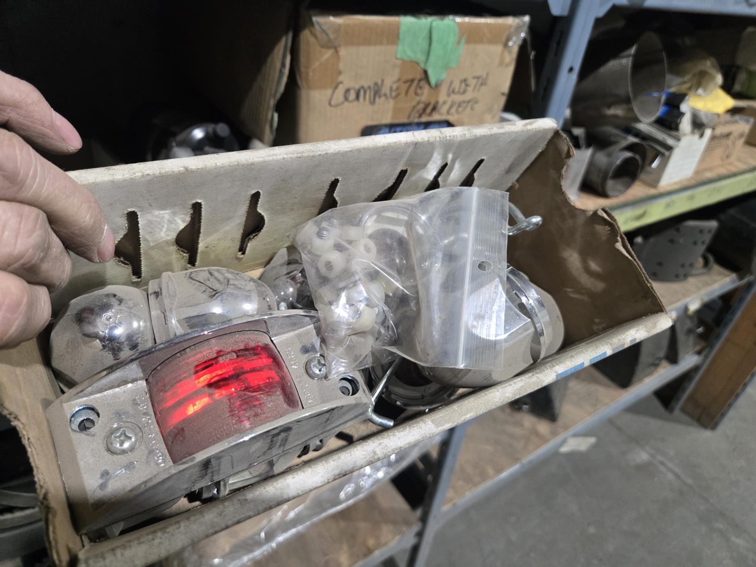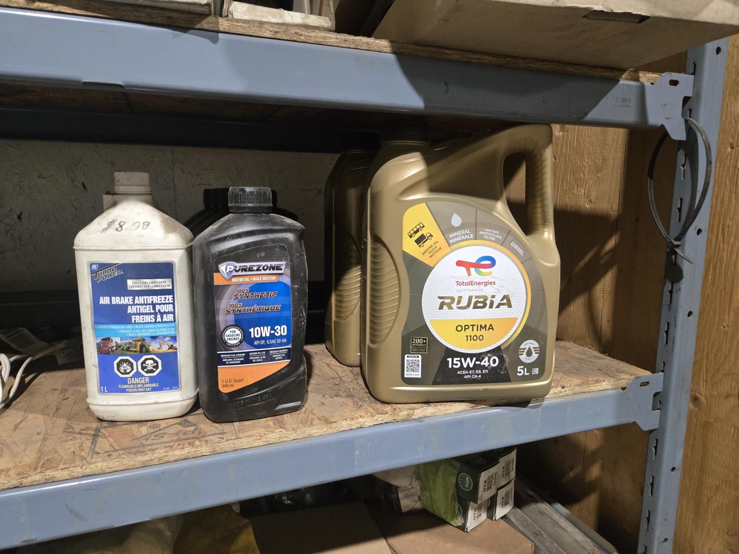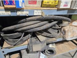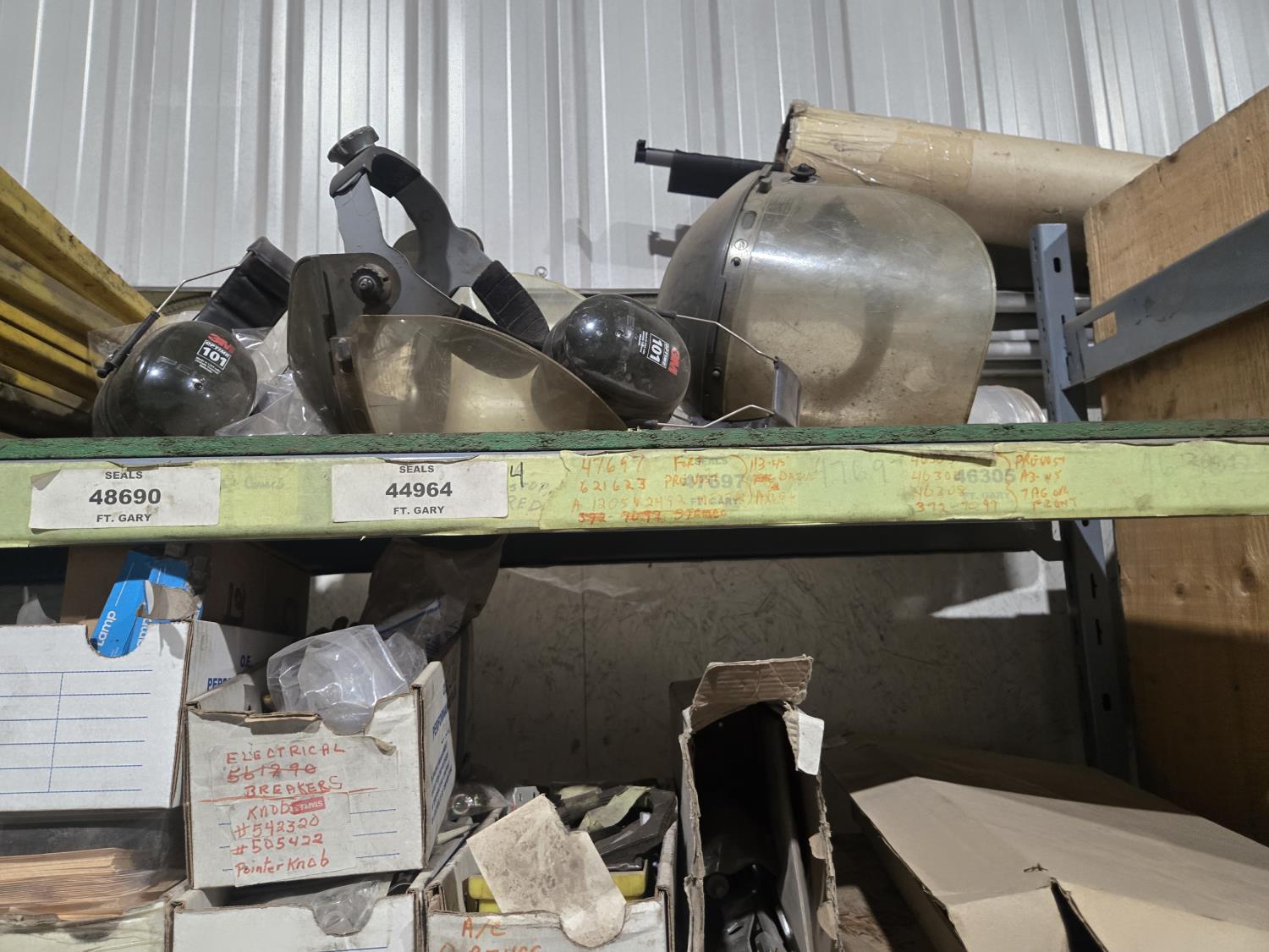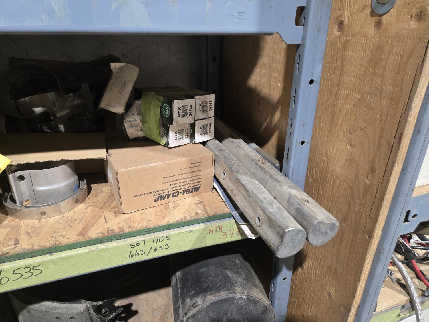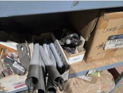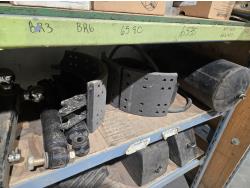 qty of unused & used heavy truck and bus parts, wheels seals, bearing kits, wheel chocks, shock absorbers, alternator, belts, miscellaneous hardware and small parts, shelf unit measures 18 inch deep X 96 inch wide X 96 inch high, shelf can easily be disassembled