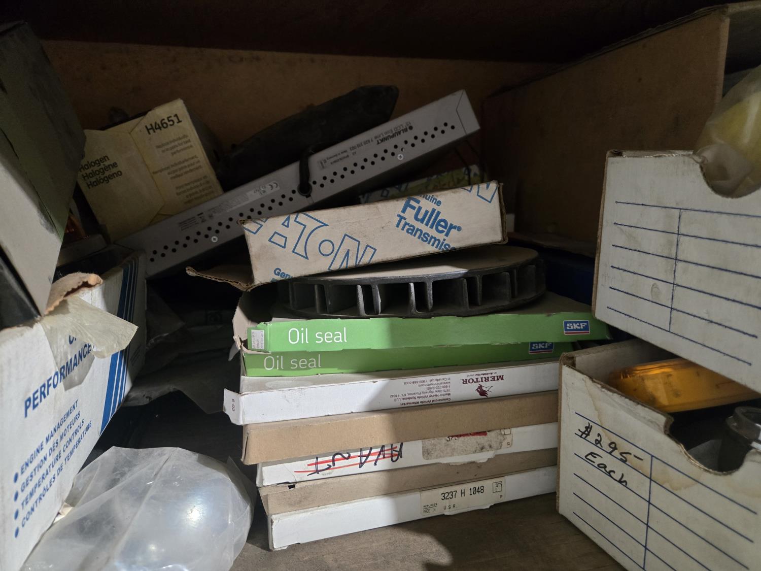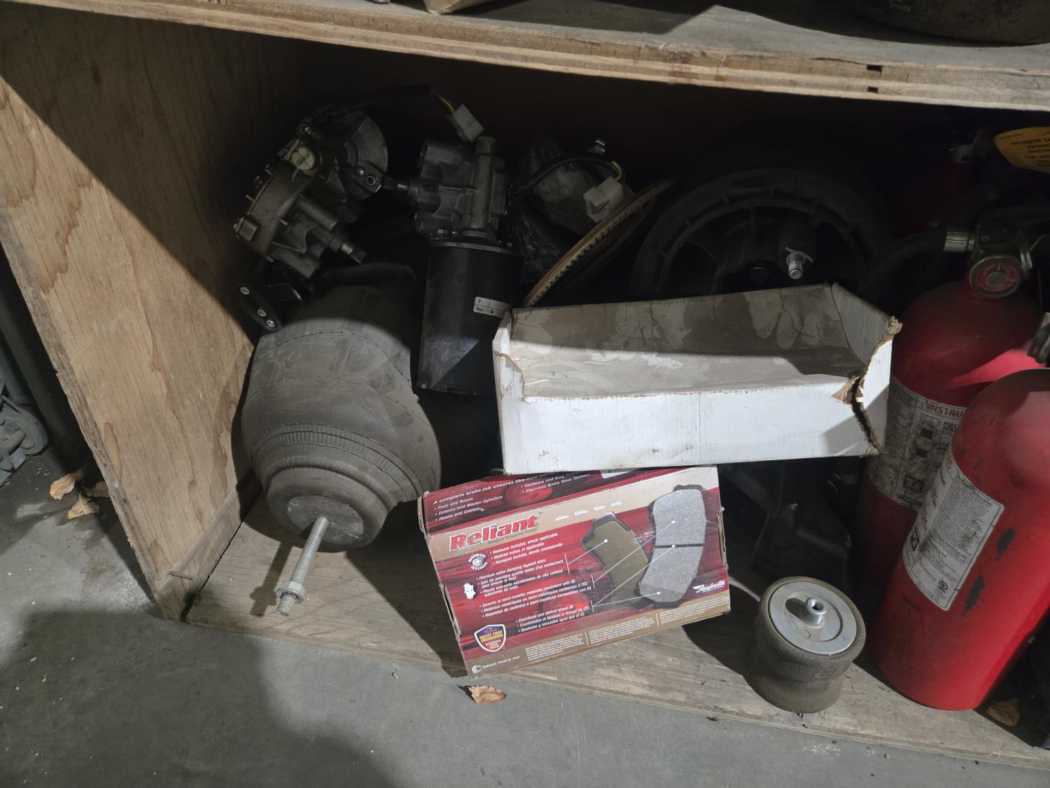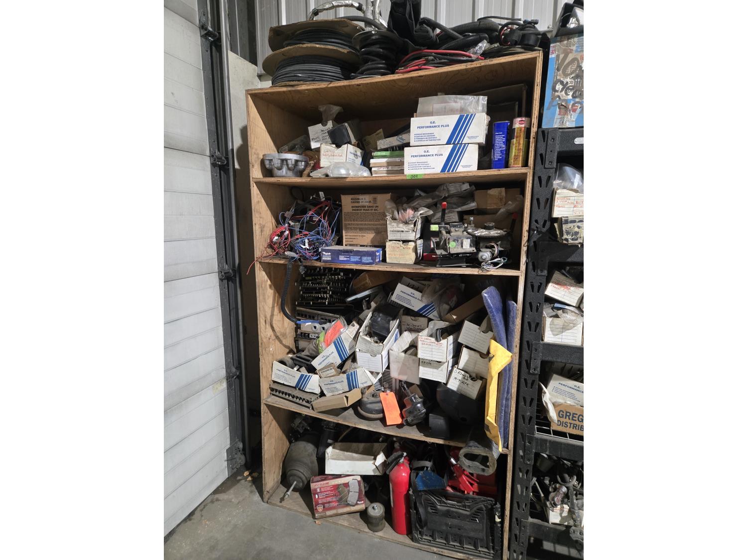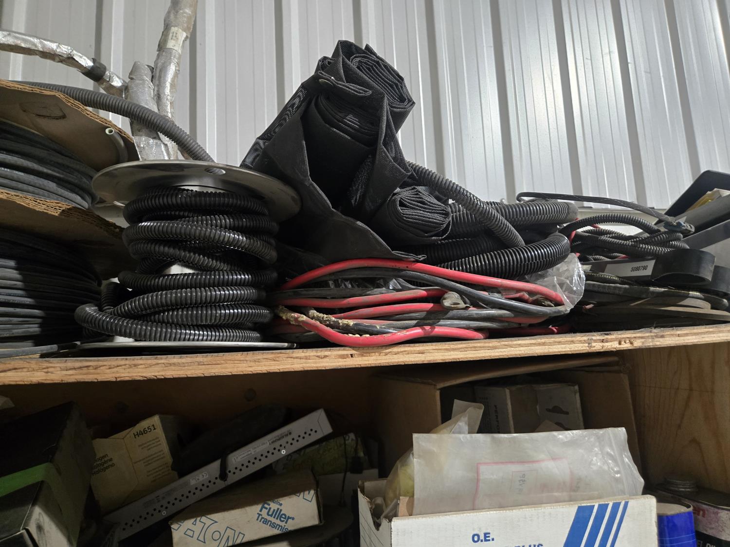 qty of assorted unused & used heavy truck & bus parts, includes loom, window motors, brake pads, electrical components, poly tubing, seals, hardware, fire extinguishers and more, shelf measures 24 inch deep X 48 inch wide X 82 inch high