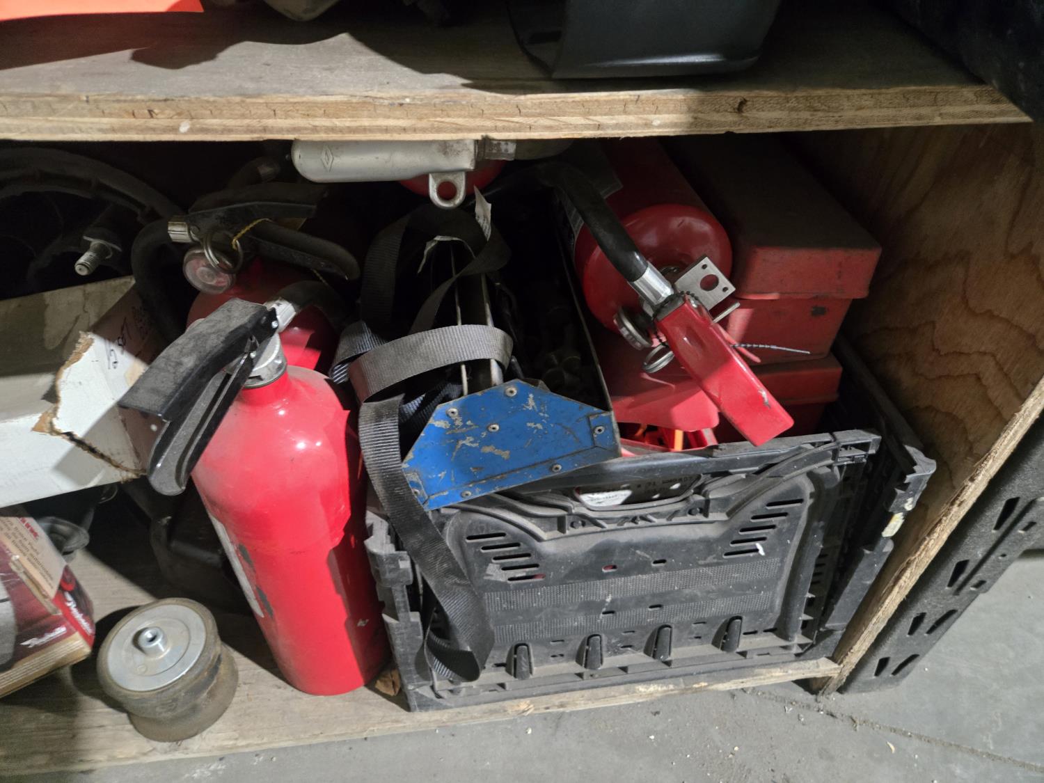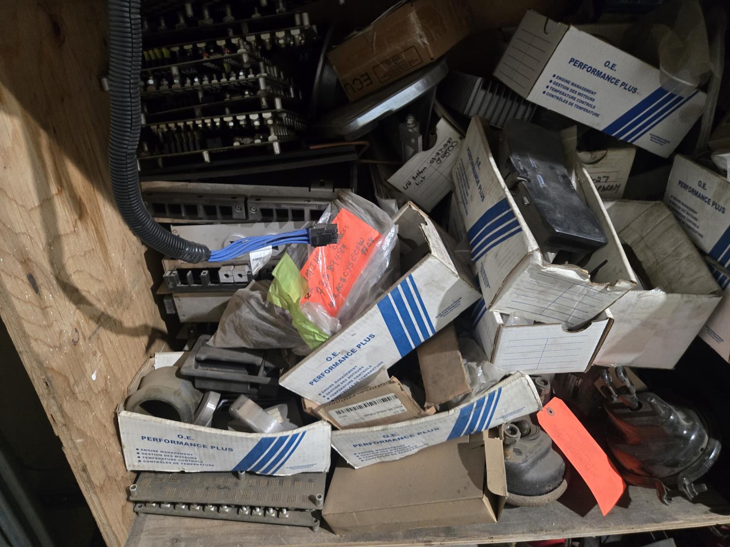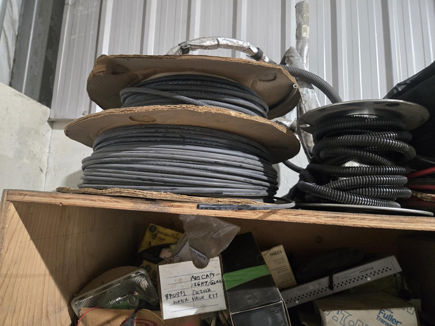 qty of assorted unused & used heavy truck & bus parts, includes loom, window motors, brake pads, electrical components, poly tubing, seals, hardware, fire extinguishers and more, shelf measures 24 inch deep X 48 inch wide X 82 inch high