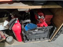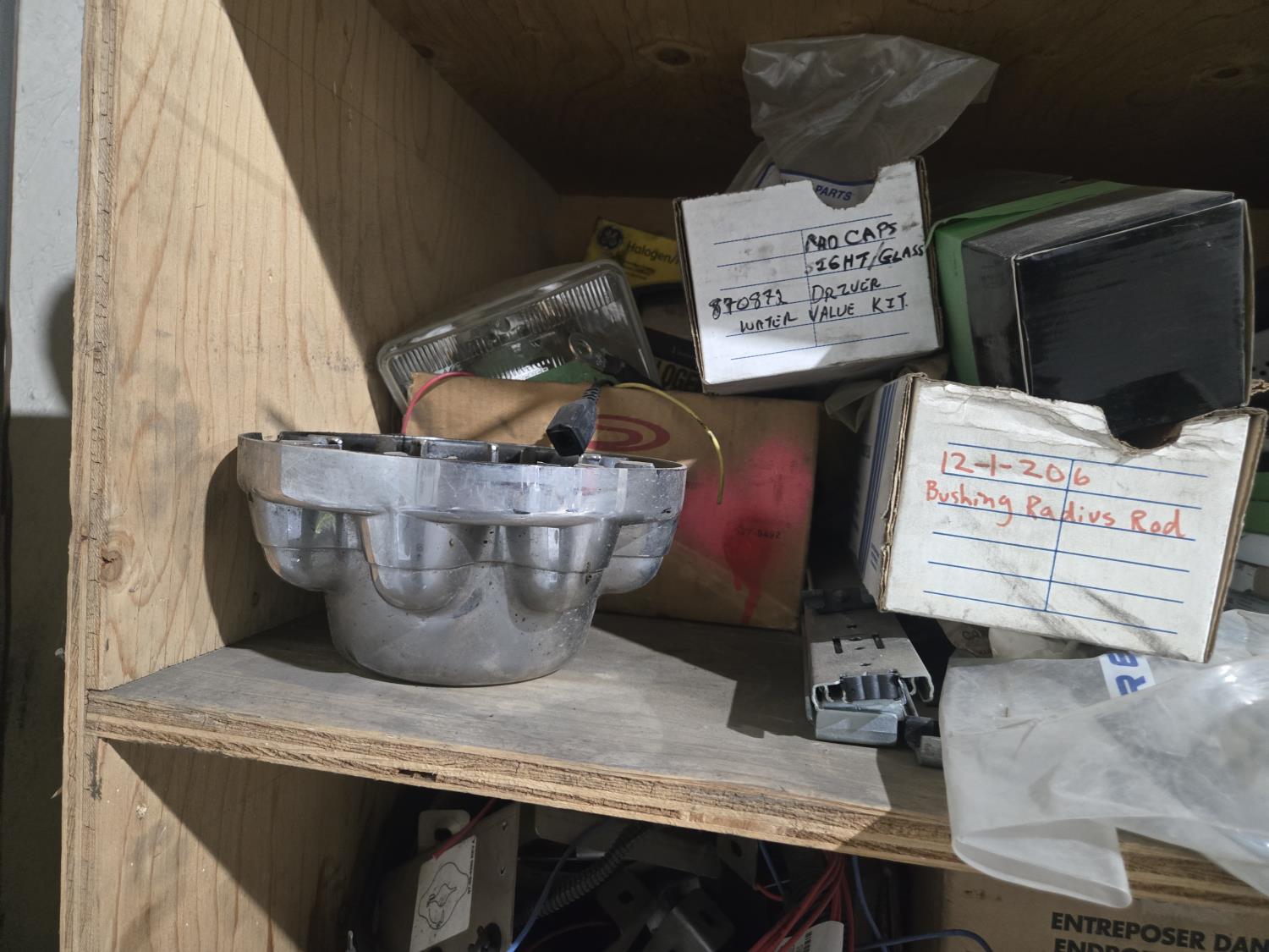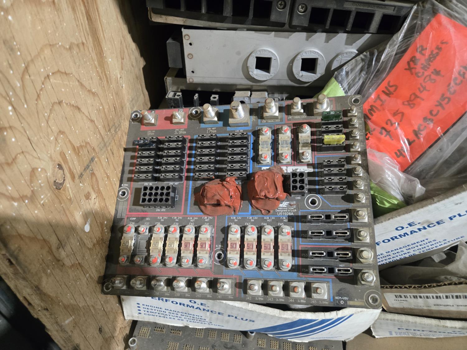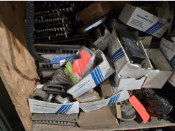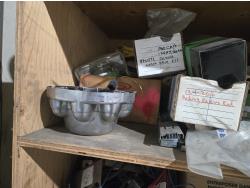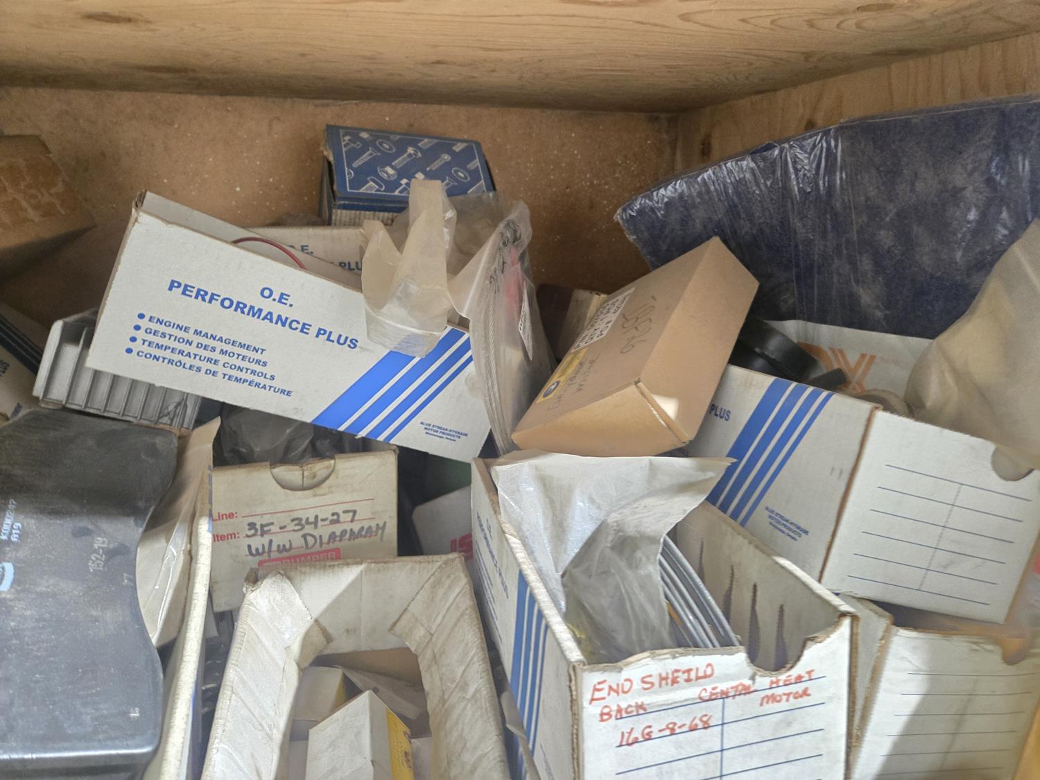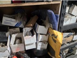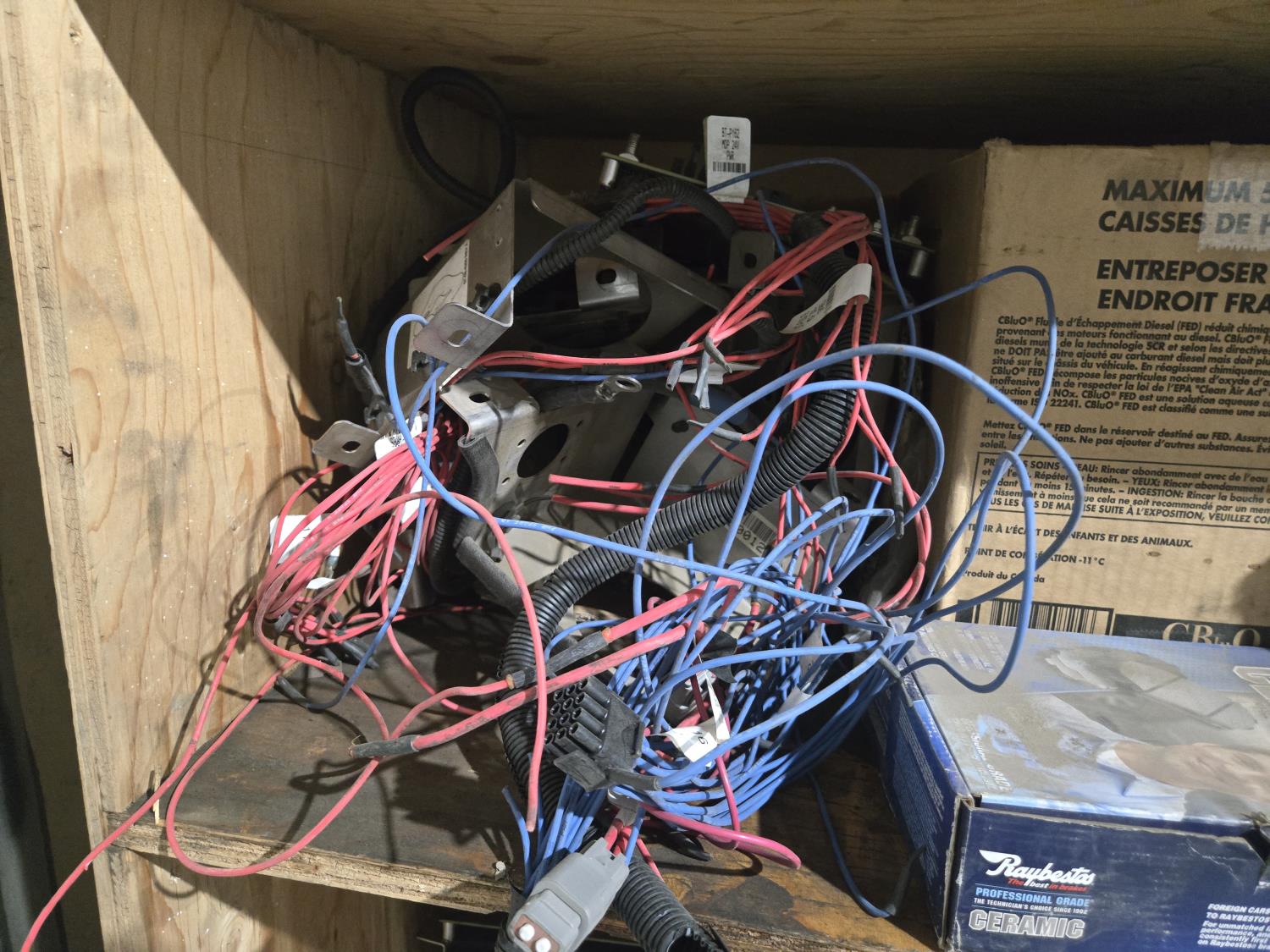 qty of assorted unused & used heavy truck & bus parts, includes loom, window motors, brake pads, electrical components, poly tubing, seals, hardware, fire extinguishers and more, shelf measures 24 inch deep X 48 inch wide X 82 inch high