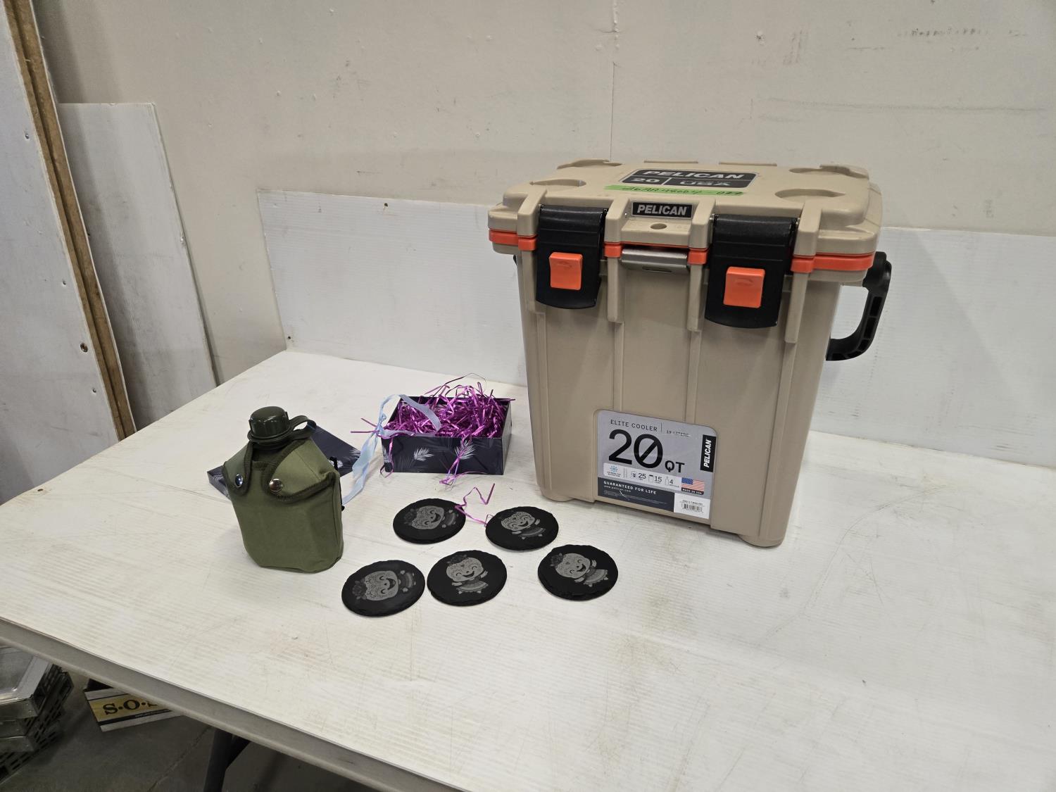 2102 Pelican 20 Qt Cooler, (5) Coasters & Canteen
