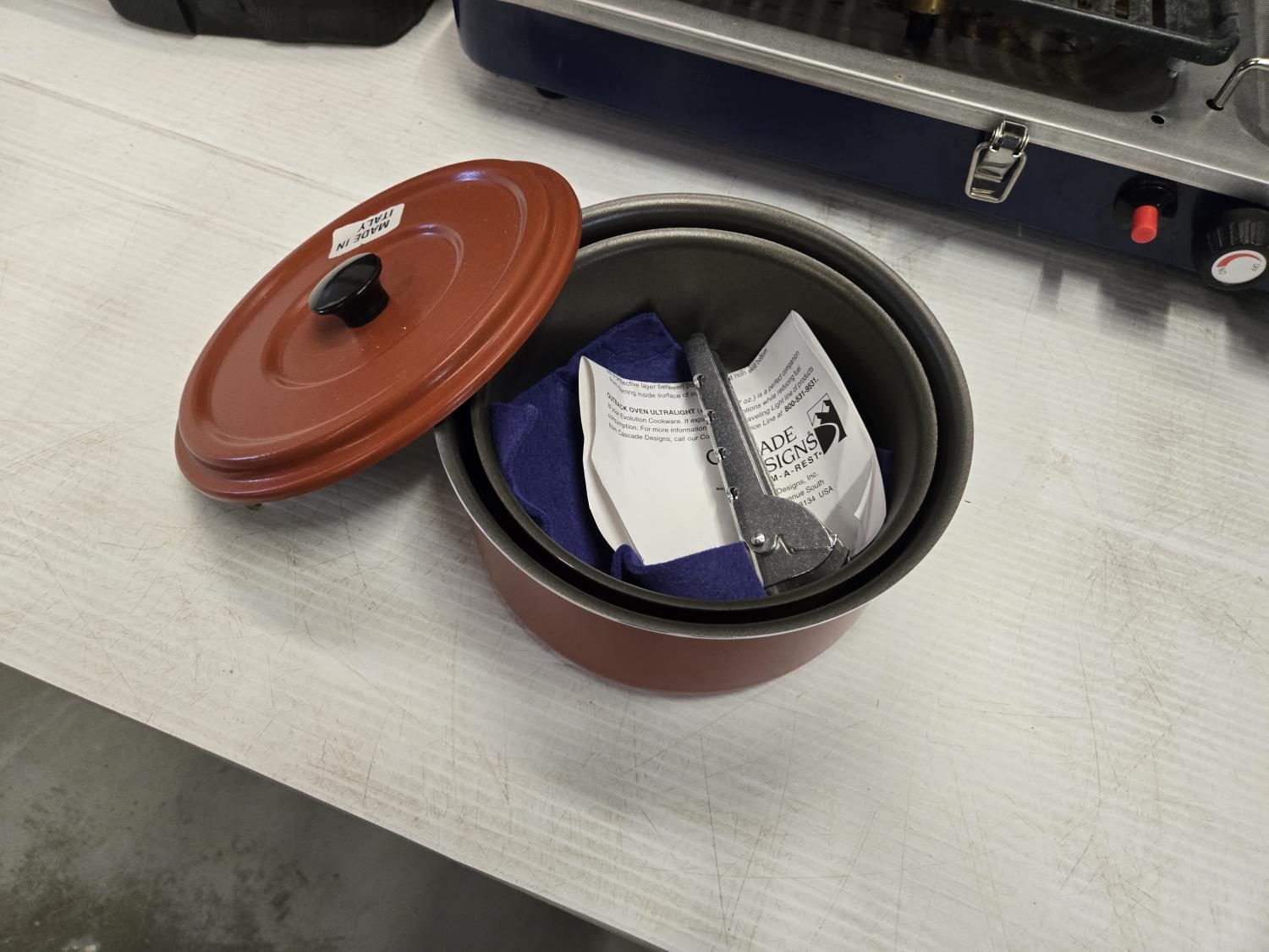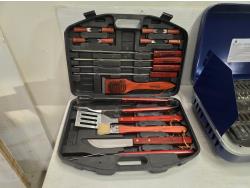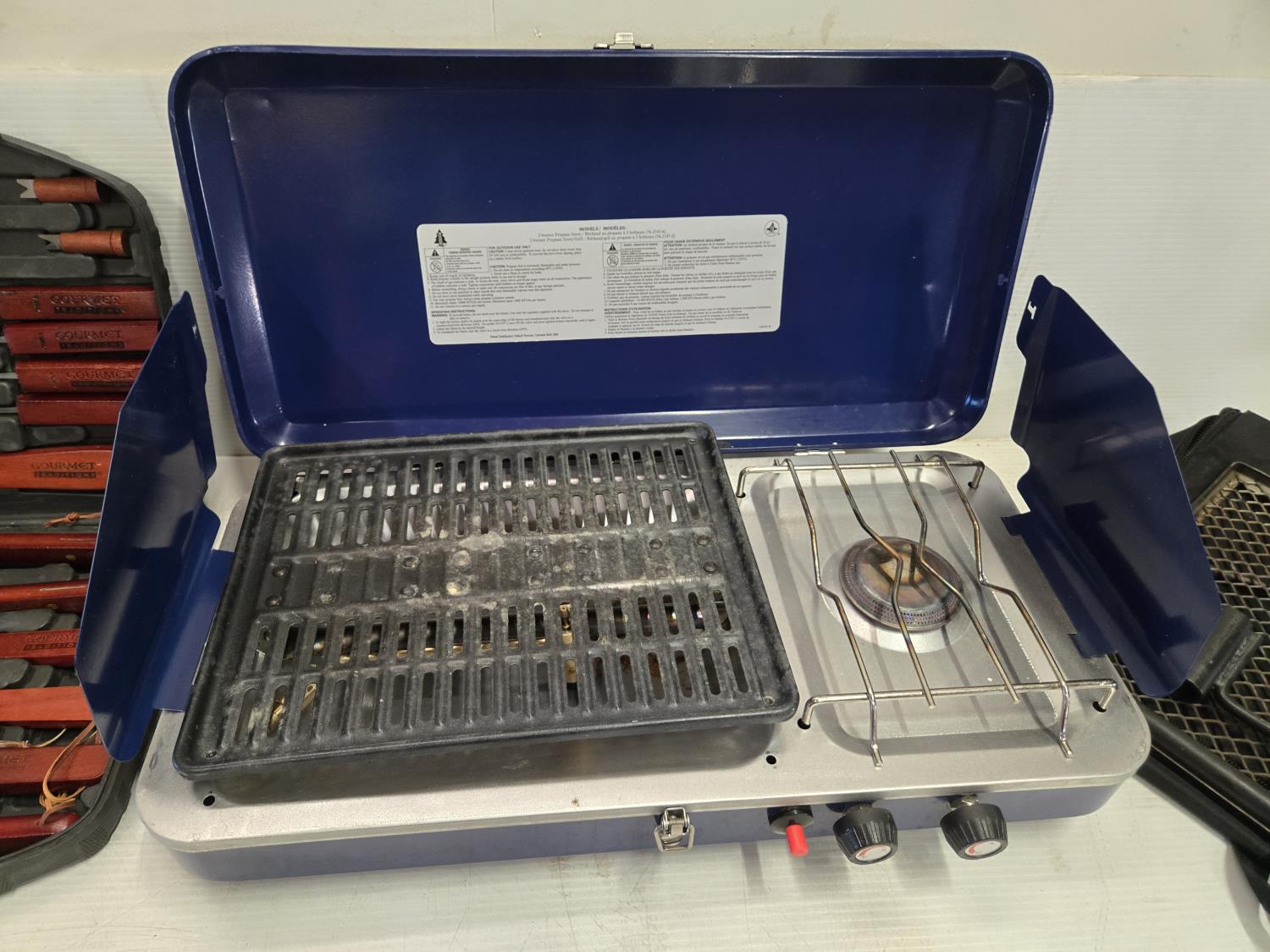 includes Woods 2 burner propane camp stove, (2) pot set, BBQ utensil set, over fire grill