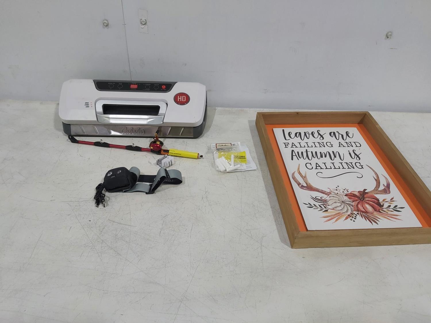 1178 Cabela's HD Vacuum Sealer, LED Headlamp, Fishing Rod Lighter and Framed Picture